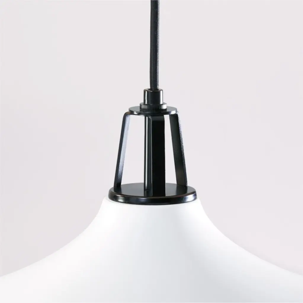 Strikingly simple with bold geometry and black details, this oversized bell pendant light in matte and shiny white arches gracefully. Hang the adjustable-height pendant over a dining table or kitchen island for a dramatic look and useful illumination. Blake Tovin designed our exclusive Maddox collection to be as flexible and functional as the modern home. Maddox mixes and matches finishes and features, creating the perfect combination. Steel shades in a variety of shapes, sizes and modern hues pair matte exteriors and glossy white interiors that reflect light beautifully, accented by decorative socket caps and ceiling plates in a range of finishes.