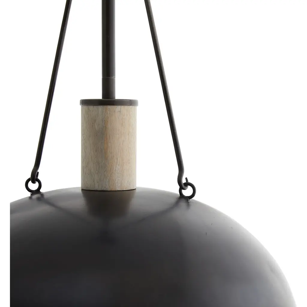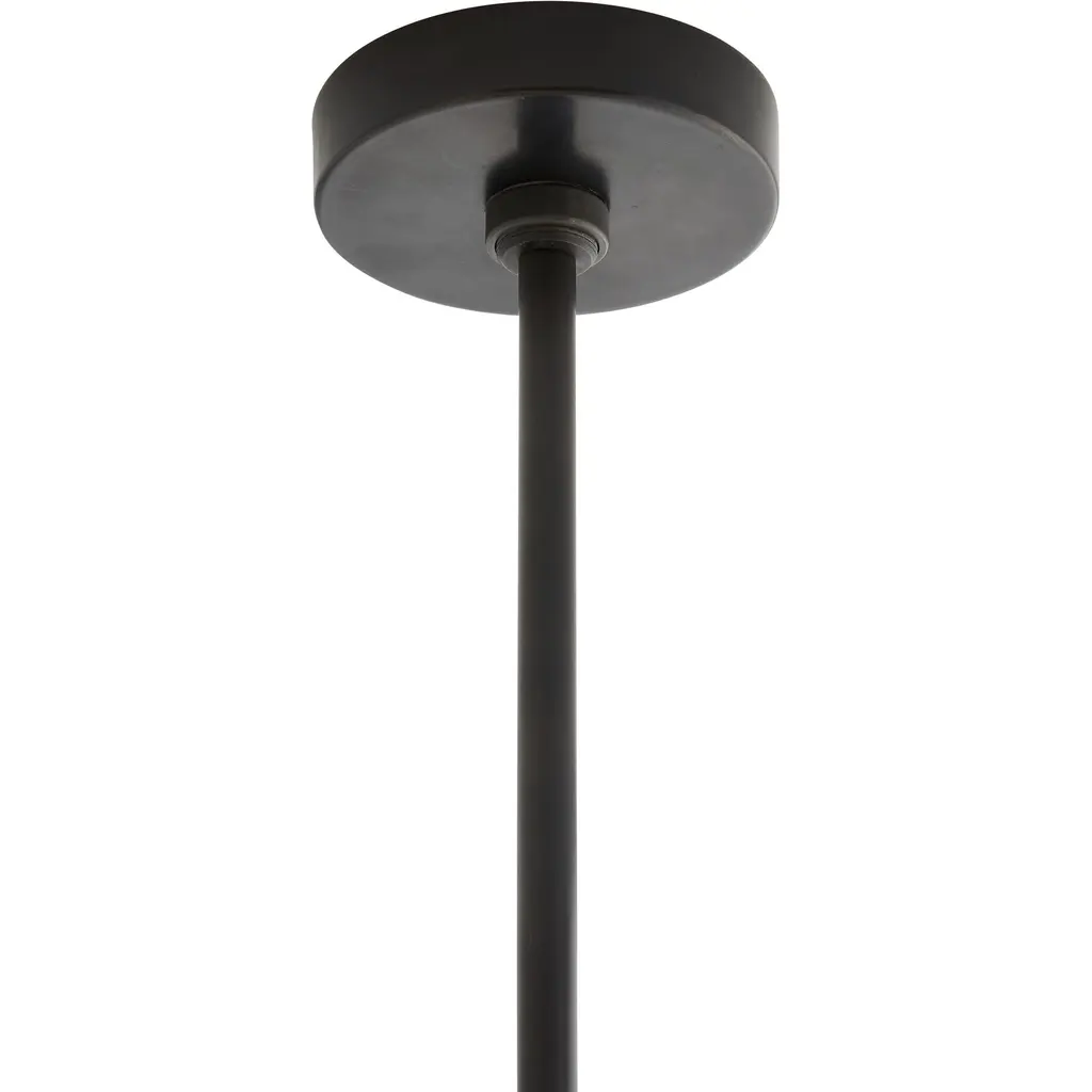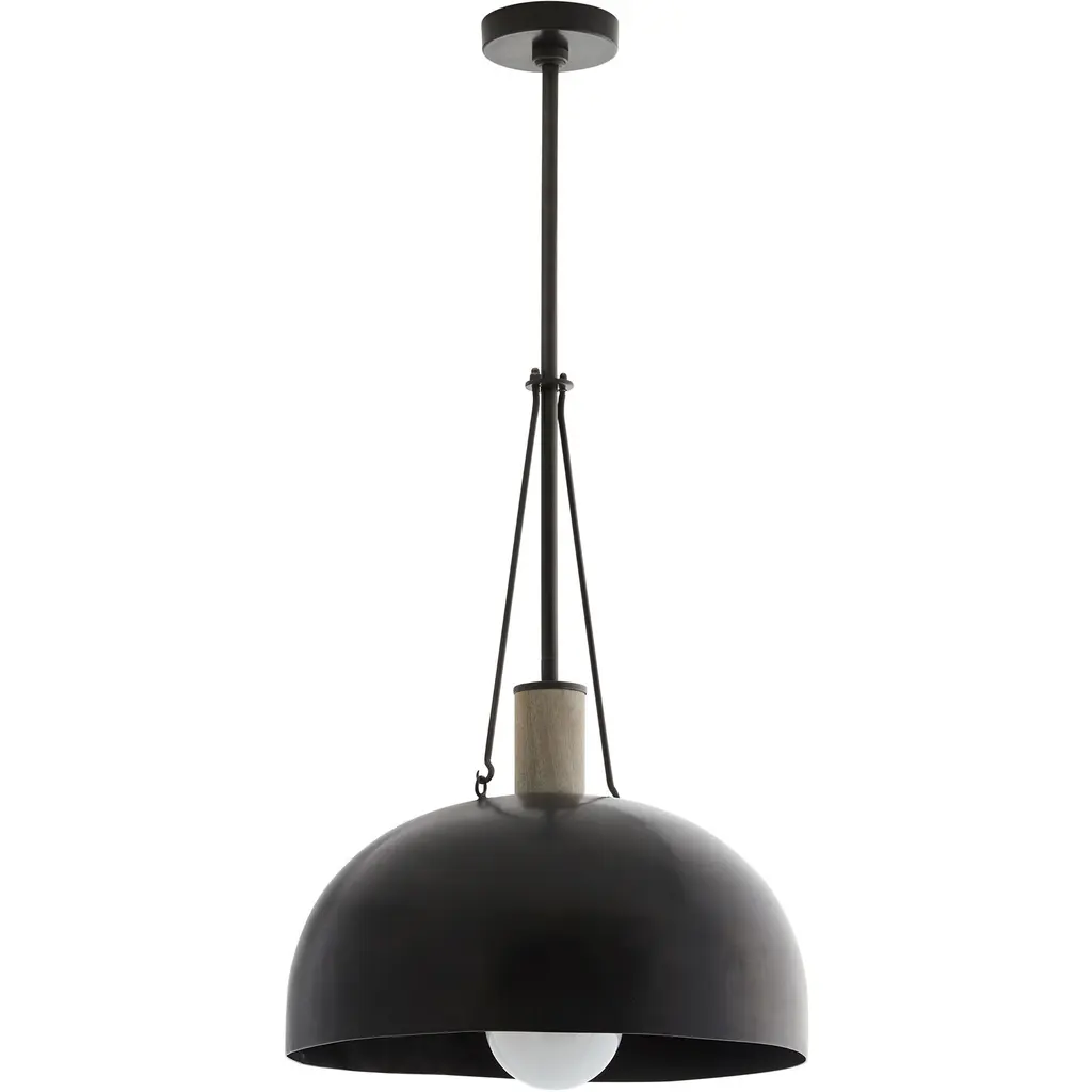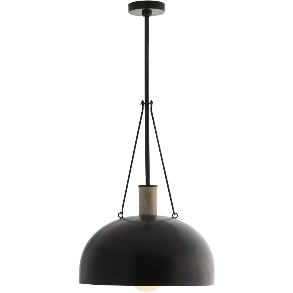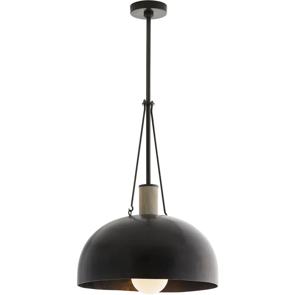 This classic bowl-shaped pendant is a contemporary cornerstone in modern lighting with timeless appeal. A wide yet shallow silhouette is composed of iron in a bronze finish, topped with a wood finial in a smoke finish with an industrial feel. The juxtaposition of sleek iron and rustic wood provides an artful balance of contrasting tones and textures. Finish will vary. Additional pipe available (PIPE-497). Damp-rated, although limited covered outdoor areas may affect finish.