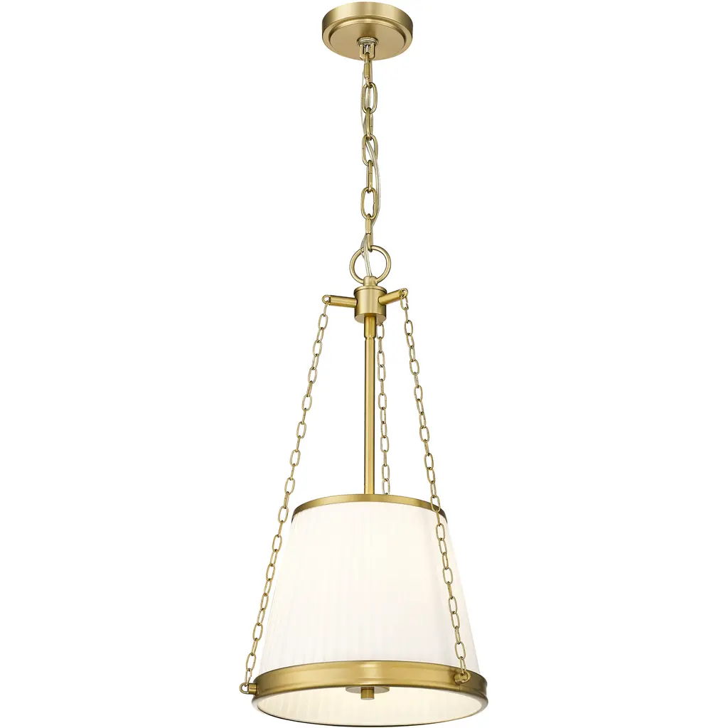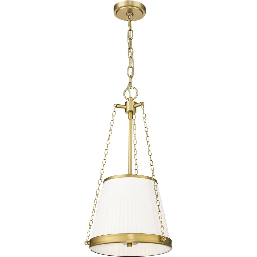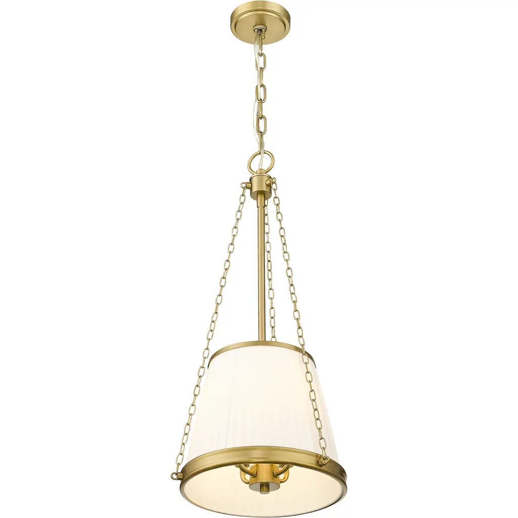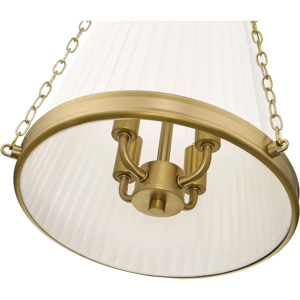 Warm modern gold finishing imparts approachable sophistication into this charming four-light pendant. A pleated linen shade creates stylish texture and dimensionality, while delicate chains add detail and height adjustability, perfect over a kitchen island, powder room, or other living space.