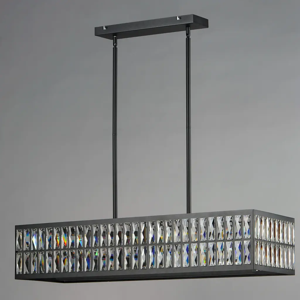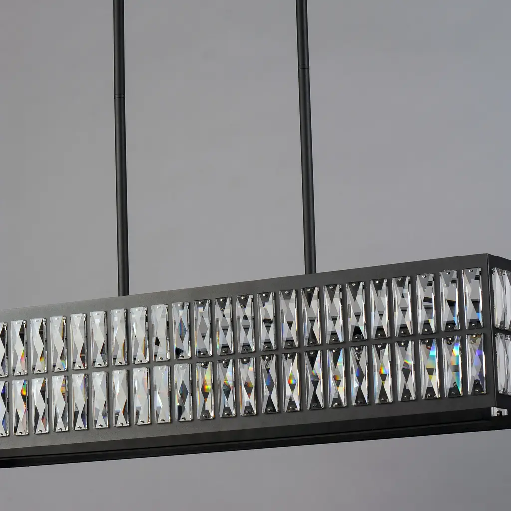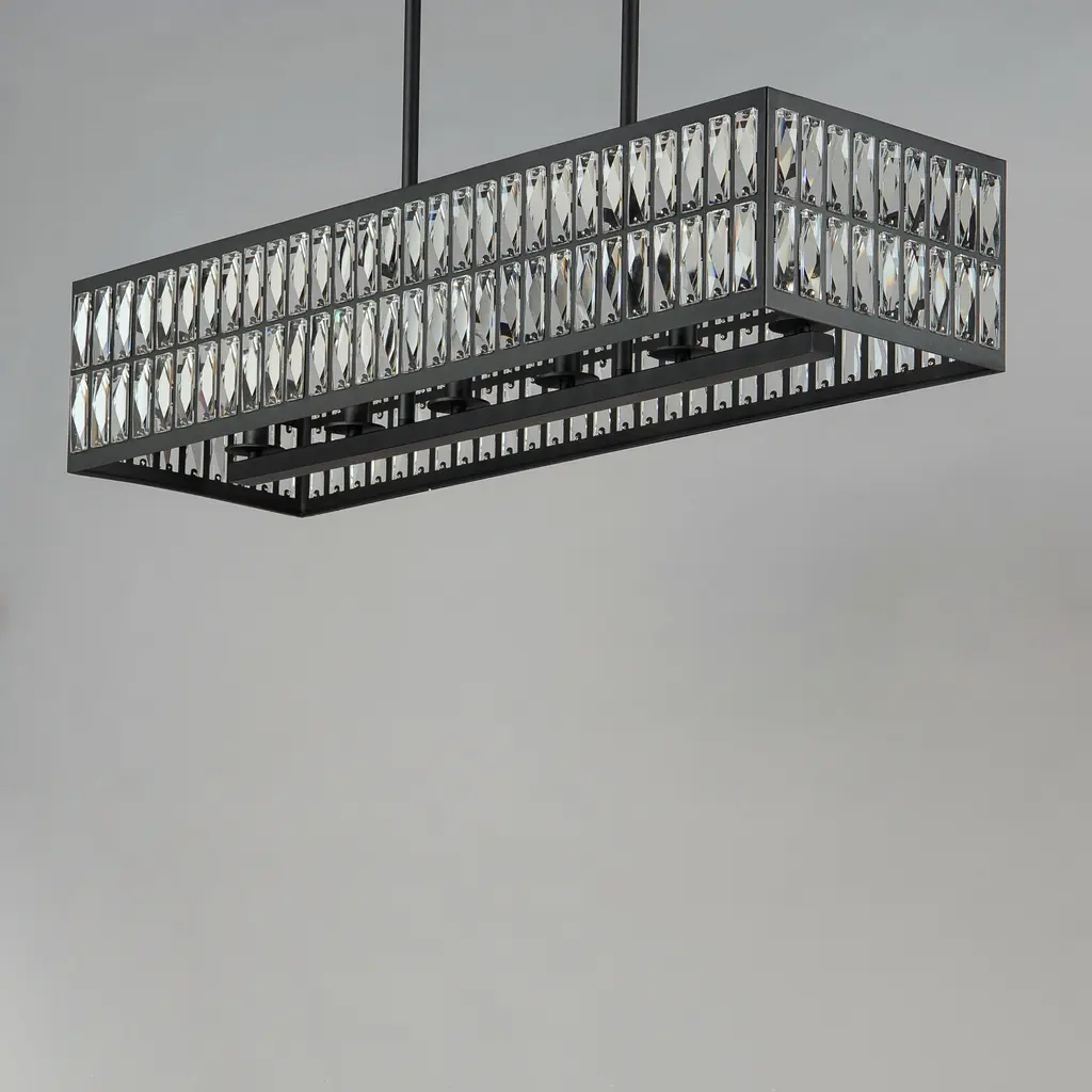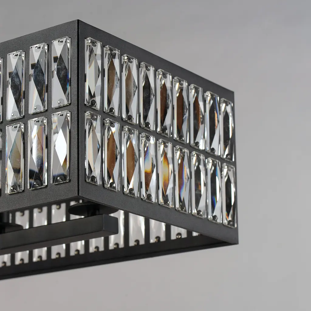 Rectilinear Beveled Crystals bejewel a Matte Black frame creates stark contrast to this radiantly prismatic display of light. The bound crystal is fixed to the frame to reduce time spent dressing the fixture.