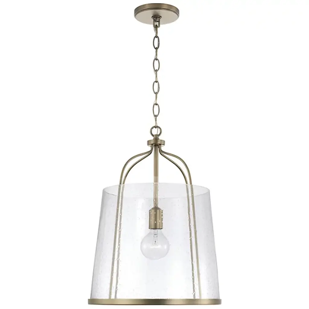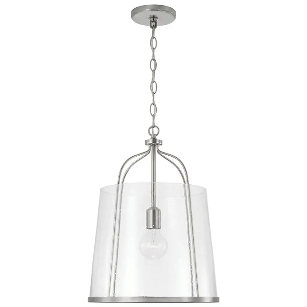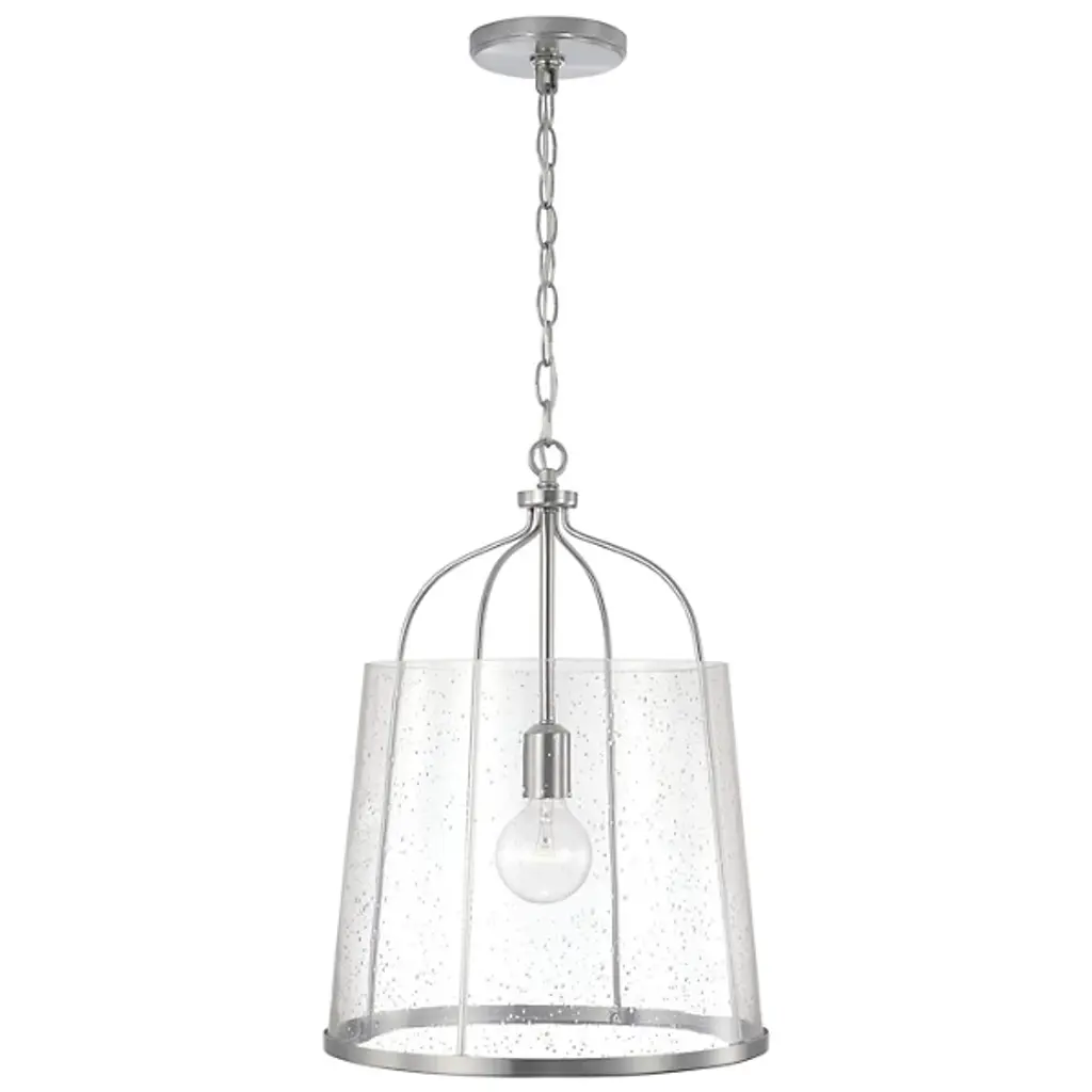 Give your home a chic aesthetic with the Madison Pendant by Capital Lighting. A chain of links attaches to a canopy at your ceiling, allowing a halogen bulb to suspend effortlessly in the air. Your fixture’s fine metalwork elegantly loops around this bulb and fits within a cylindrical shade of glass. From behind this glass, luminous light splays throughout your room, bringing visibility to your surroundings. This hanging furnishment is suited for living room placement and situations above dinner tables.