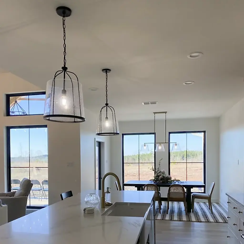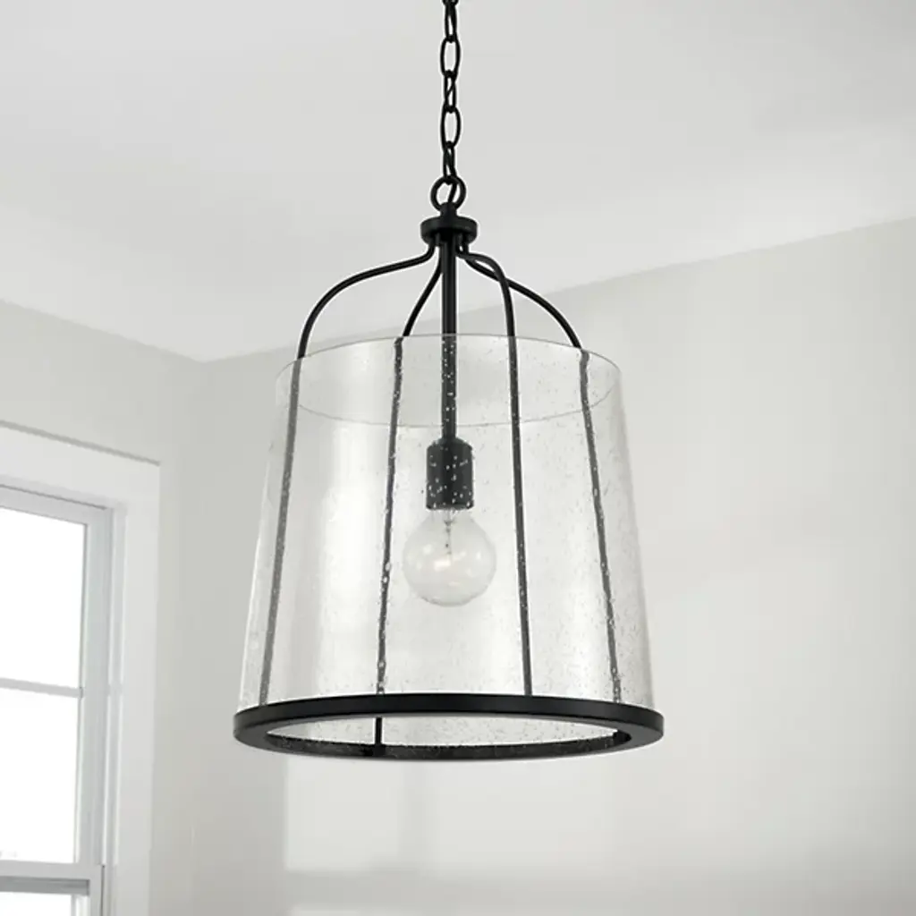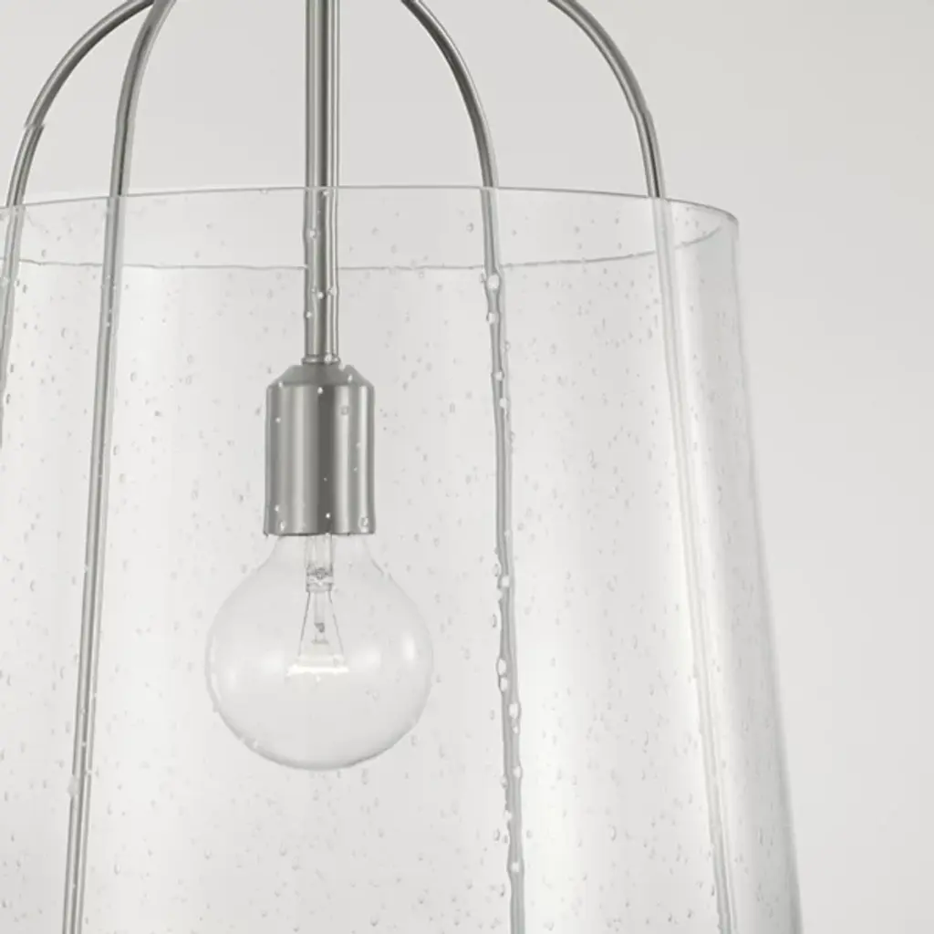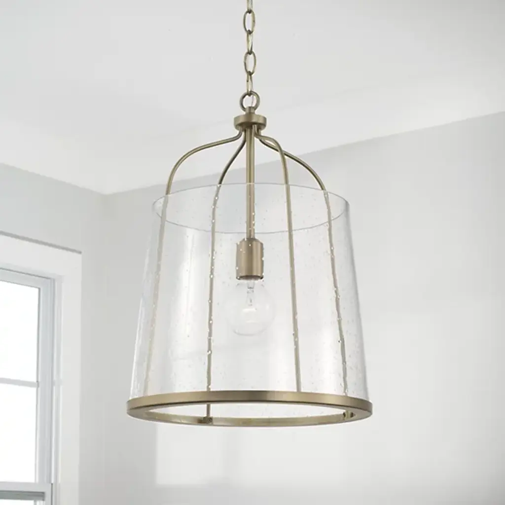Give your home a chic aesthetic with the Madison Pendant by Capital Lighting. A chain of links attaches to a canopy at your ceiling, allowing a halogen bulb to suspend effortlessly in the air. Your fixture’s fine metalwork elegantly loops around this bulb and fits within a cylindrical shade of glass. From behind this glass, luminous light splays throughout your room, bringing visibility to your surroundings. This hanging furnishment is suited for living room placement and situations above dinner tables.