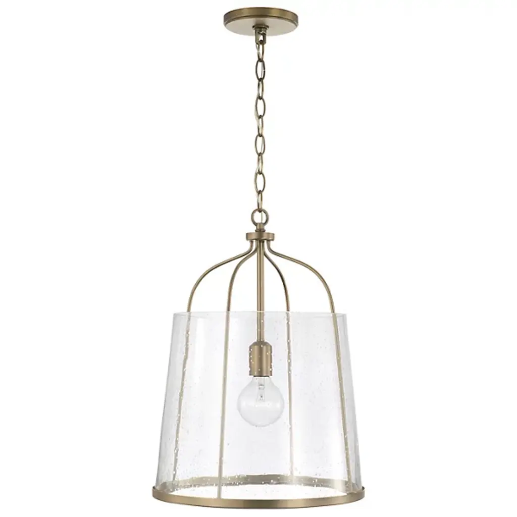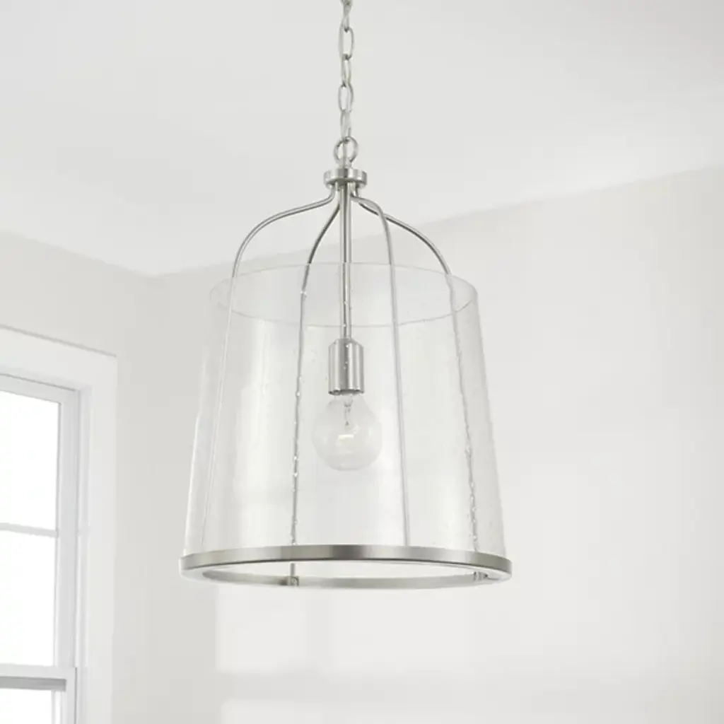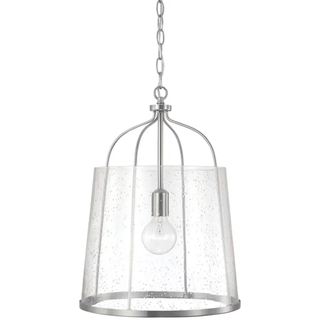 Give your home a chic aesthetic with the Madison Pendant by Capital Lighting. A chain of links attaches to a canopy at your ceiling, allowing a halogen bulb to suspend effortlessly in the air. Your fixture’s fine metalwork elegantly loops around this bulb and fits within a cylindrical shade of glass. From behind this glass, luminous light splays throughout your room, bringing visibility to your surroundings. This hanging furnishment is suited for living room placement and situations above dinner tables.