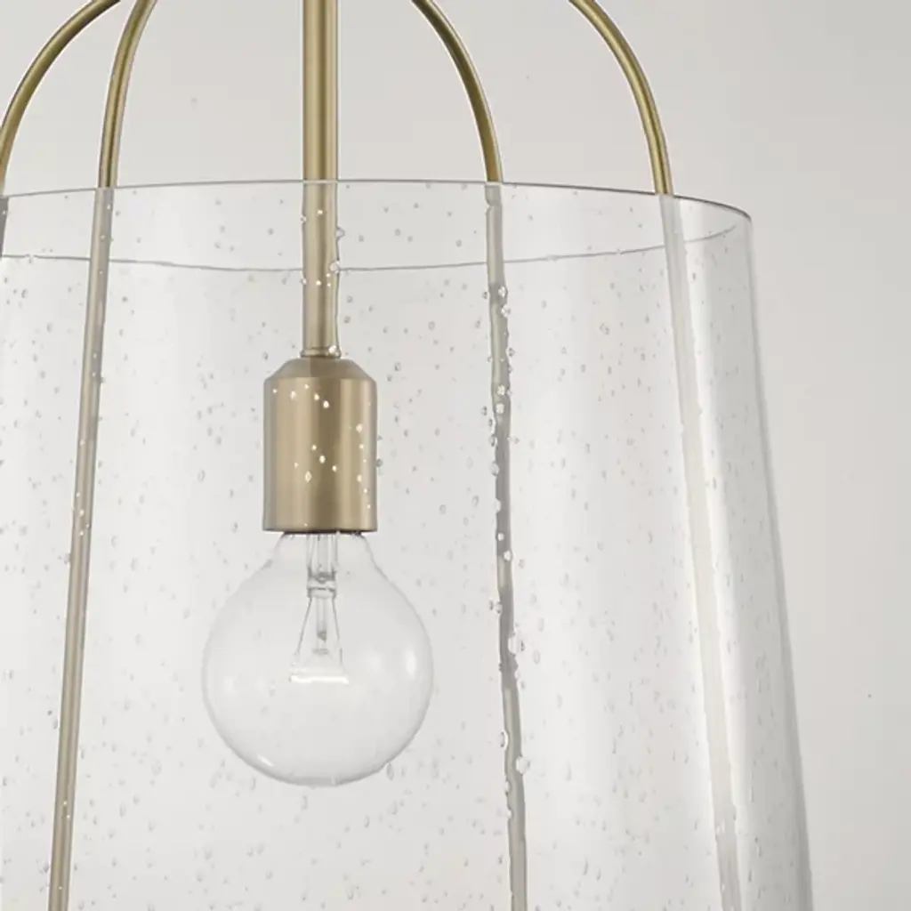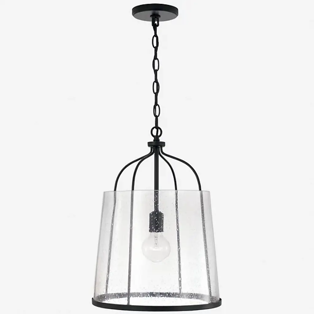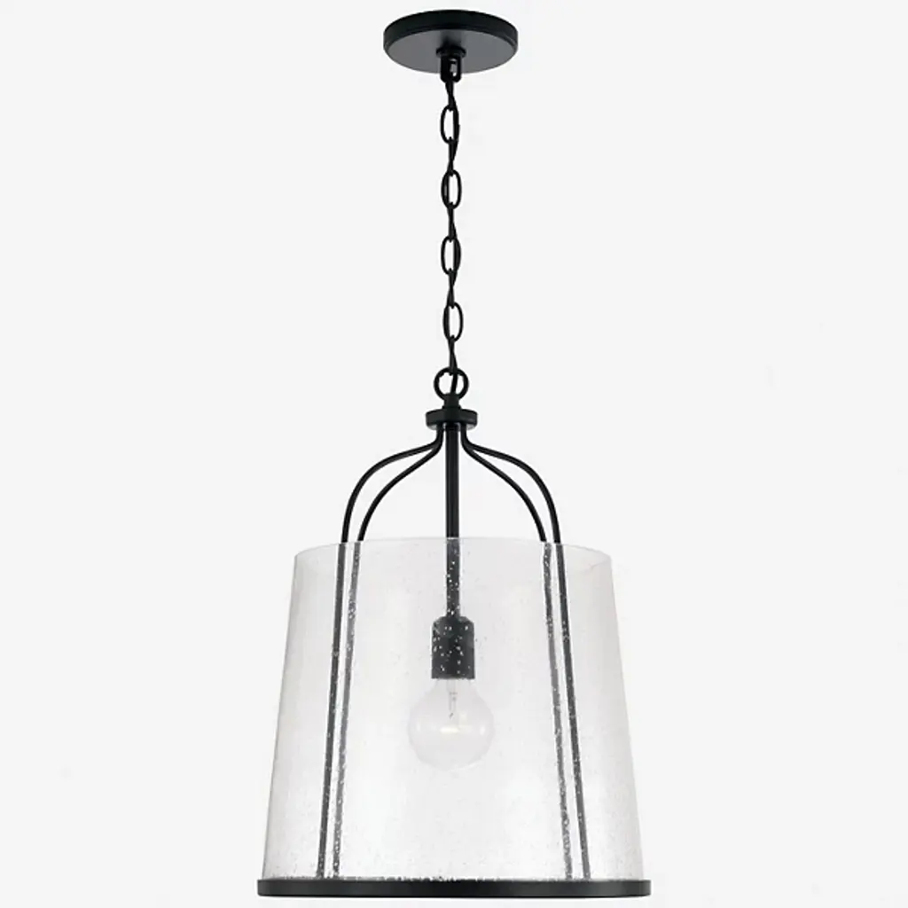 Give your home a chic aesthetic with the Madison Pendant by Capital Lighting. A chain of links attaches to a canopy at your ceiling, allowing a halogen bulb to suspend effortlessly in the air. Your fixture’s fine metalwork elegantly loops around this bulb and fits within a cylindrical shade of glass. From behind this glass, luminous light splays throughout your room, bringing visibility to your surroundings. This hanging furnishment is suited for living room placement and situations above dinner tables.