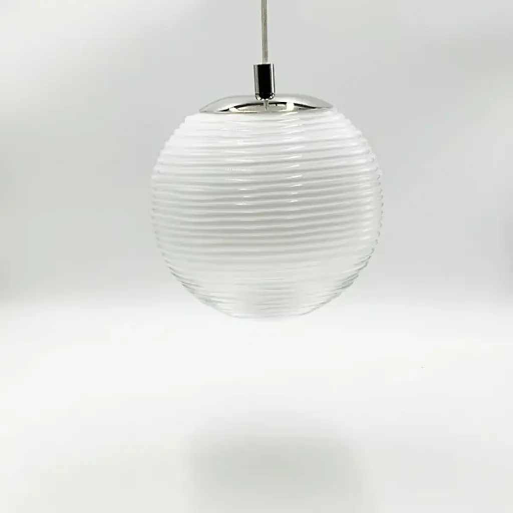 Light up your room with the Maestro Pendant by MM Lampadari. Your pendant is crowned by a streamlined frame of metal, enhancing its mid-century modern look. A globe-shaped shade is a line of beautiful Murano glass that takes on a rippling design. Within this shade rests a bright LED which produces a pleasant glow. The Maestro pendent easily secures to your ceiling and is well-suited for placement in your dining room, living room, and more.