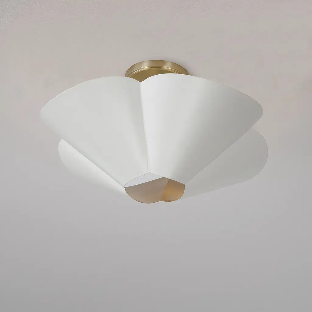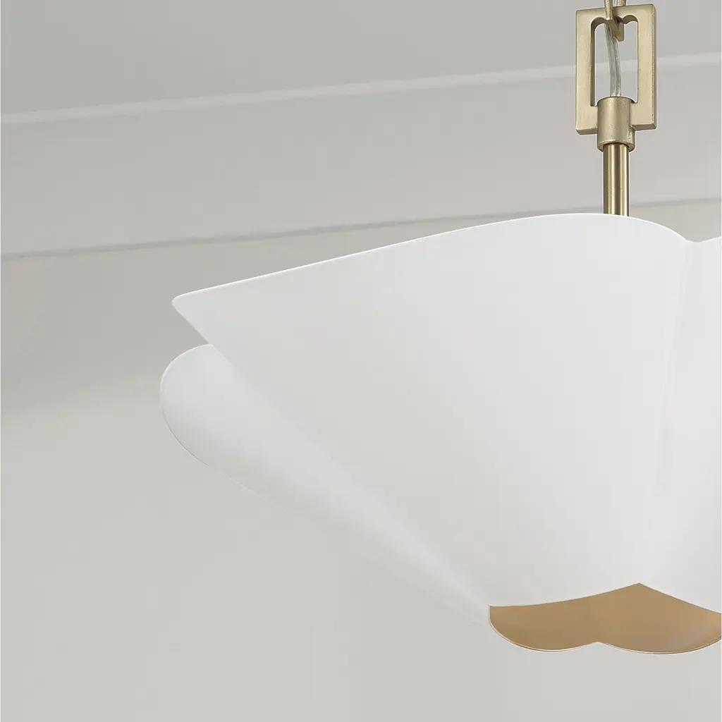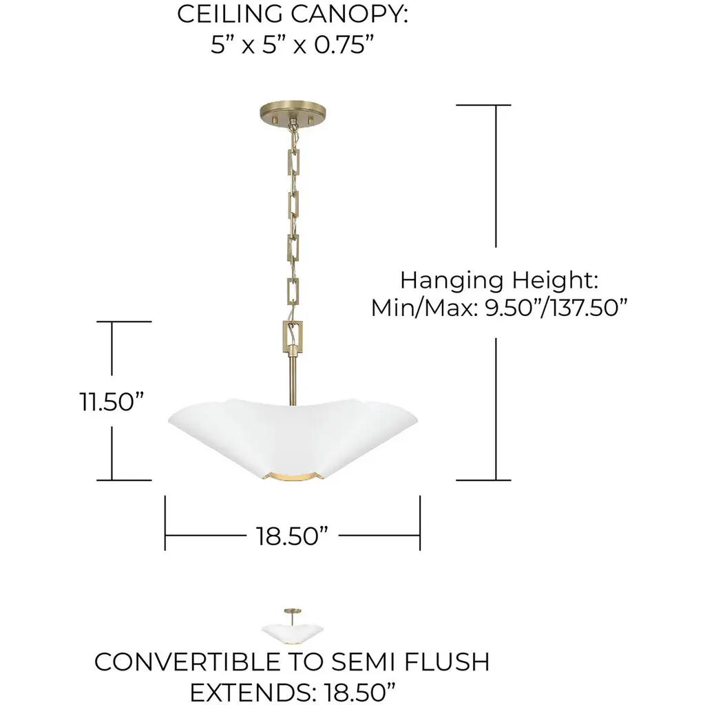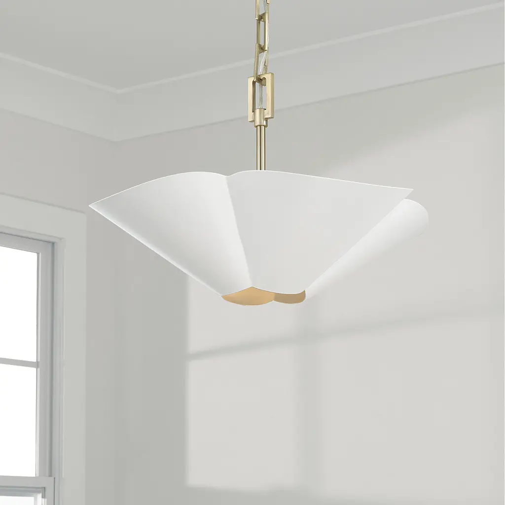 Invite all-around chic style with the 18.75 inch wide Maeve Small Dual Mount. Whether hung as a pendant or semi flush, the subtle curvature of the petal-like shade evokes a botanical feel, enhanced by the rectangular-shaped designer chain and sophisticated two-tone finish of smooth Matte White and painted Matte Brass interior.