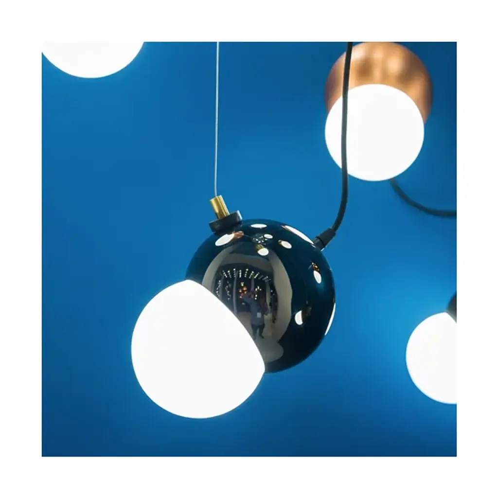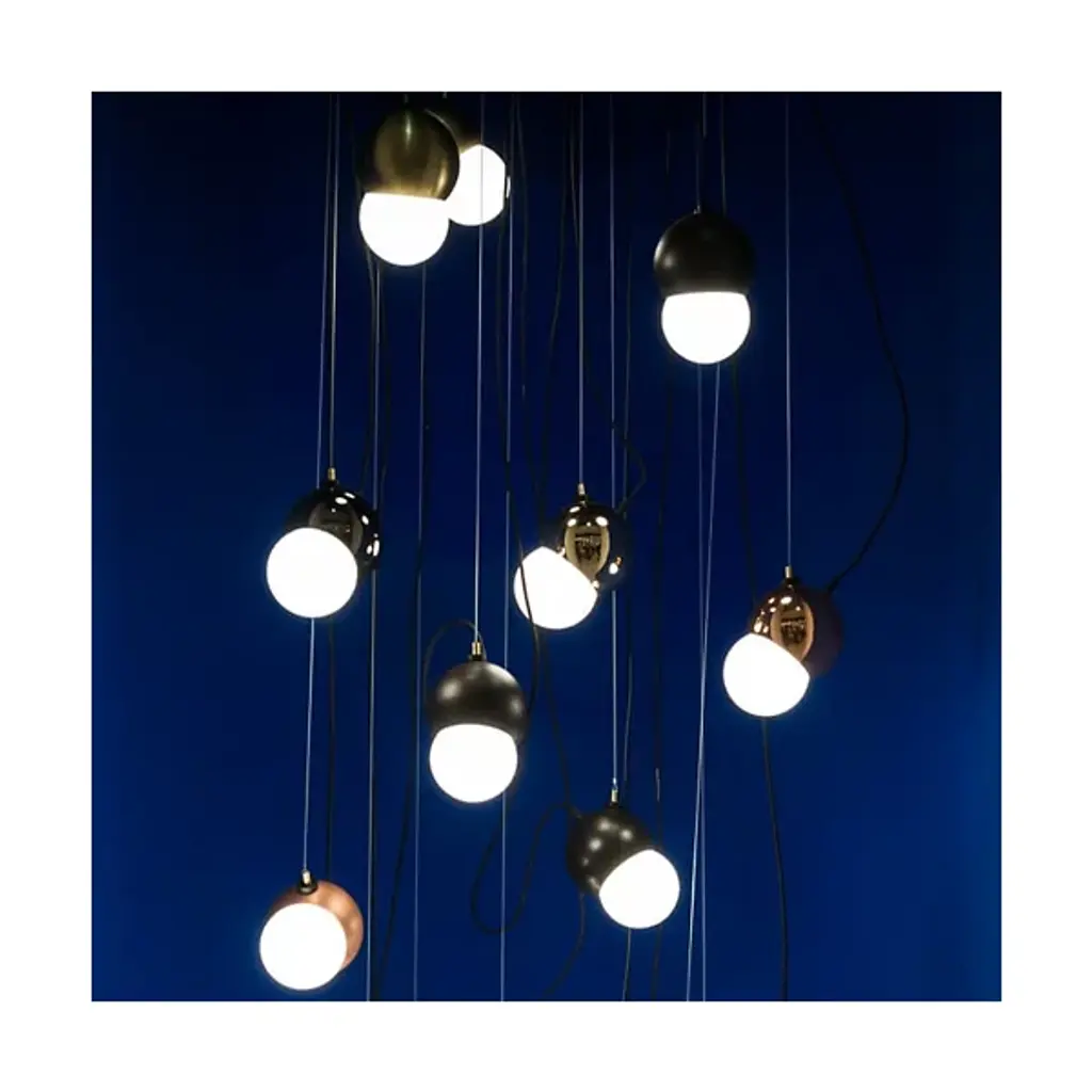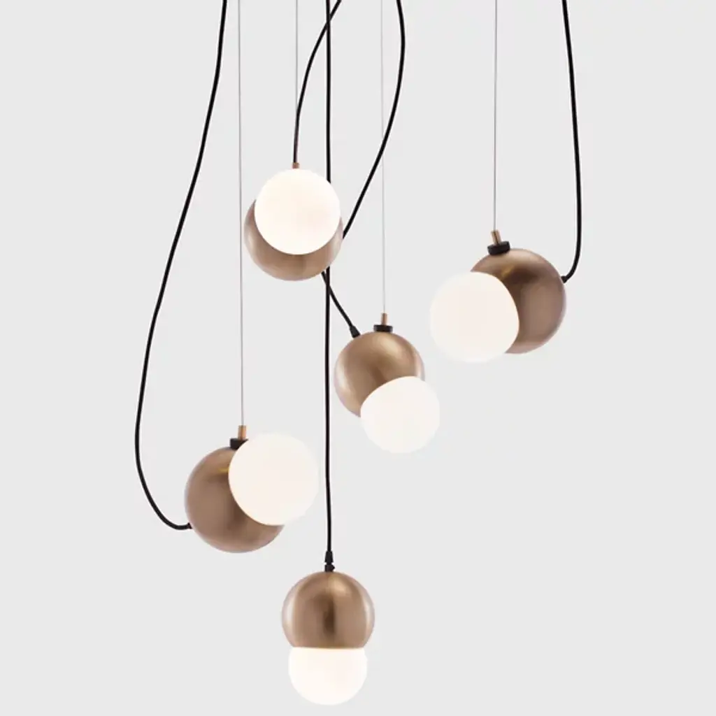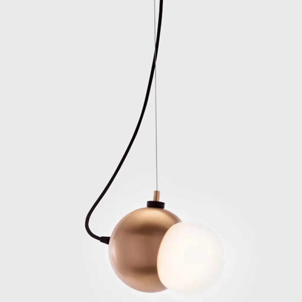 The Maggie LED Pendant Light was designed by Brooks Alexander Munroe. This two-toned suspension light features a spun steel globed with a plated finish and white opal glass insert. With a magnet attachment that serves as both a support cable and way to change the orientation of the pendant light, this fixture can be rotated to fit a wide array of decorative lighting needs. Adds soft, diffused illumination making it a fantastic choice for modern spaces. Available in Silver, Smoke, Copper, Gold, Hairline Bronze and Dark Bronze. Includes matching metal canopy and black cloth cord. Shown in Copper. Note: Available in custom multipoint clusters, please call (866) 428-9289 to place order.