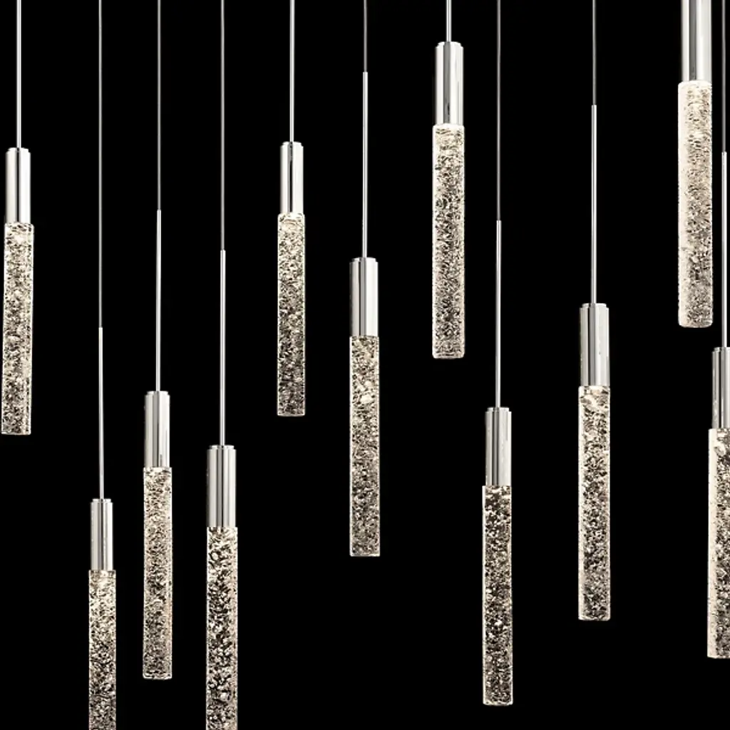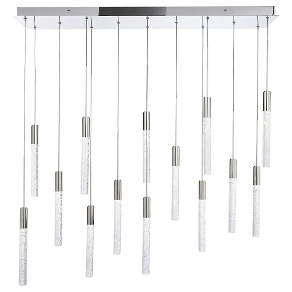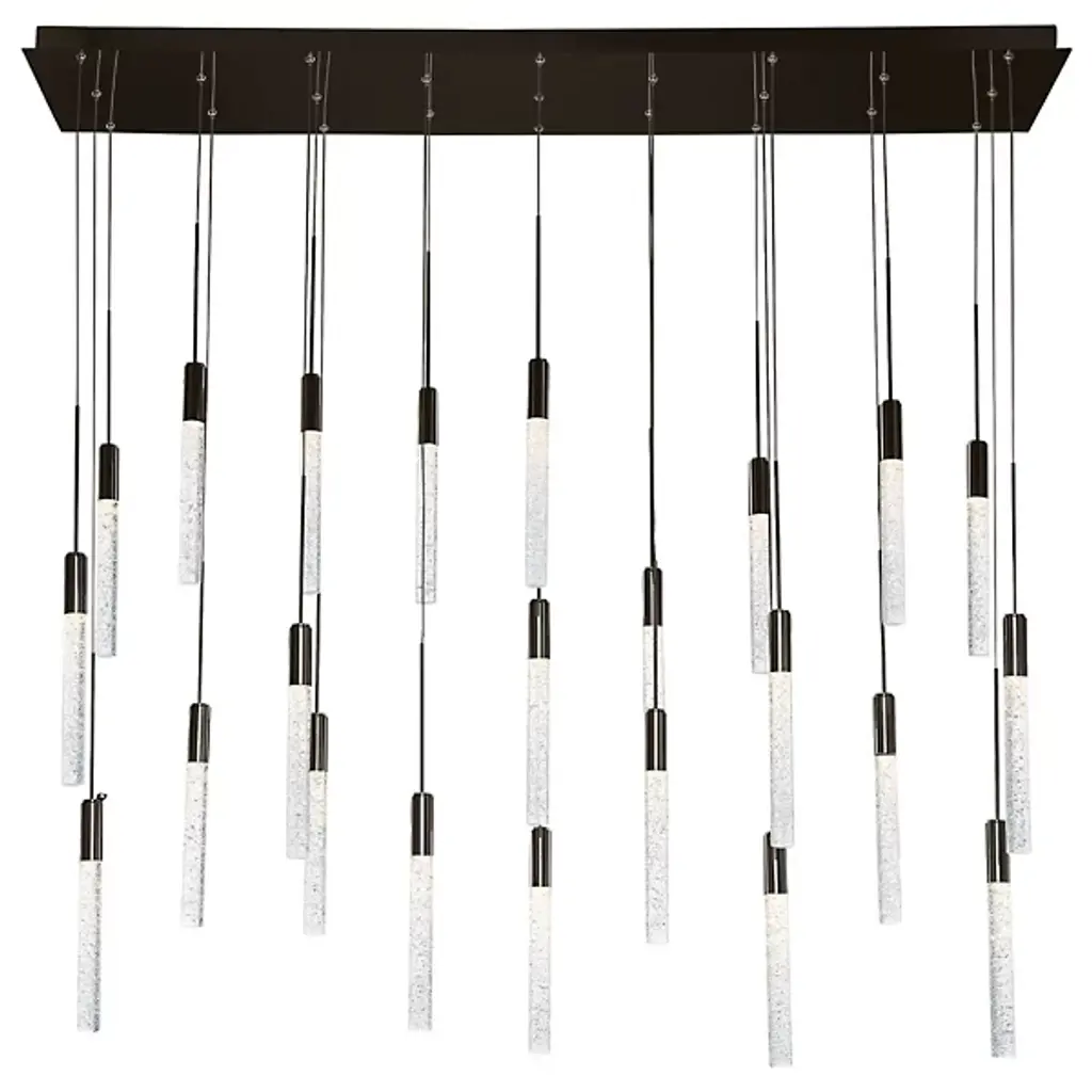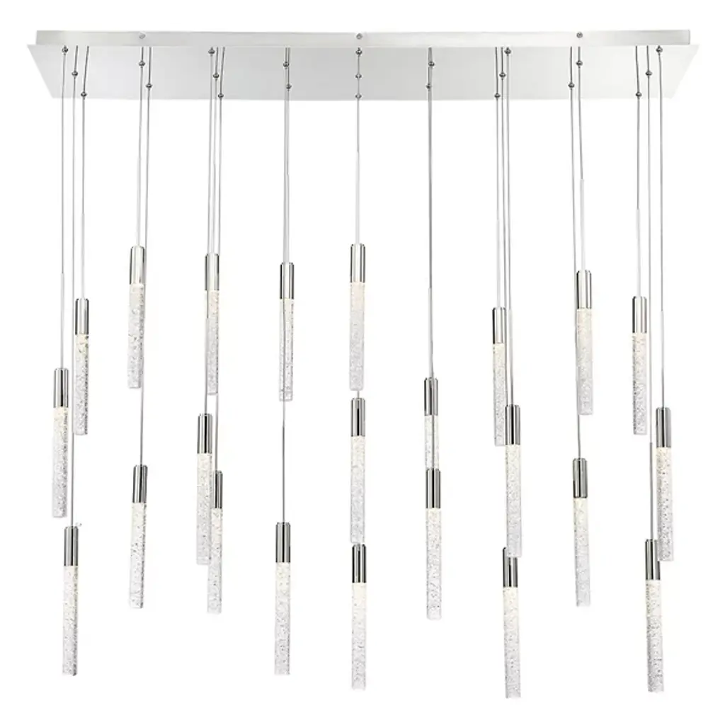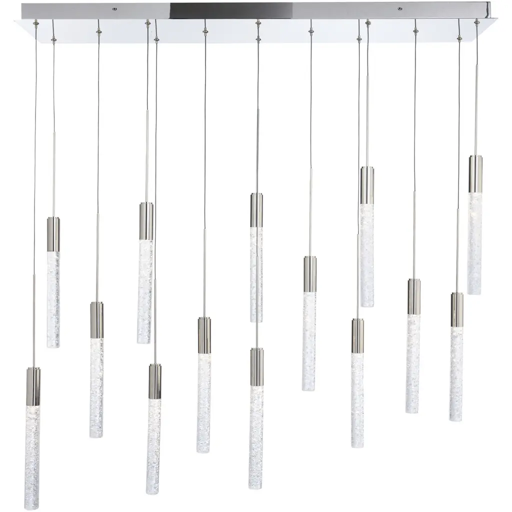 Post a contemporary curtain of dazzling illumination to your interiors with the Magic Rectangular Multi-Light LED Pendant from Modern Forms. The piece starts with a wide, stepped rectangular canopy of smooth aluminum that drops evenly spaced cylindrical housings from slender cables at different heights to form a pleasantly natural pattern. Further, the housings hold integrated LEDs above Piastra crystal rods, which uses their textured structure to ease glare into a warmer radiance around the fixture.