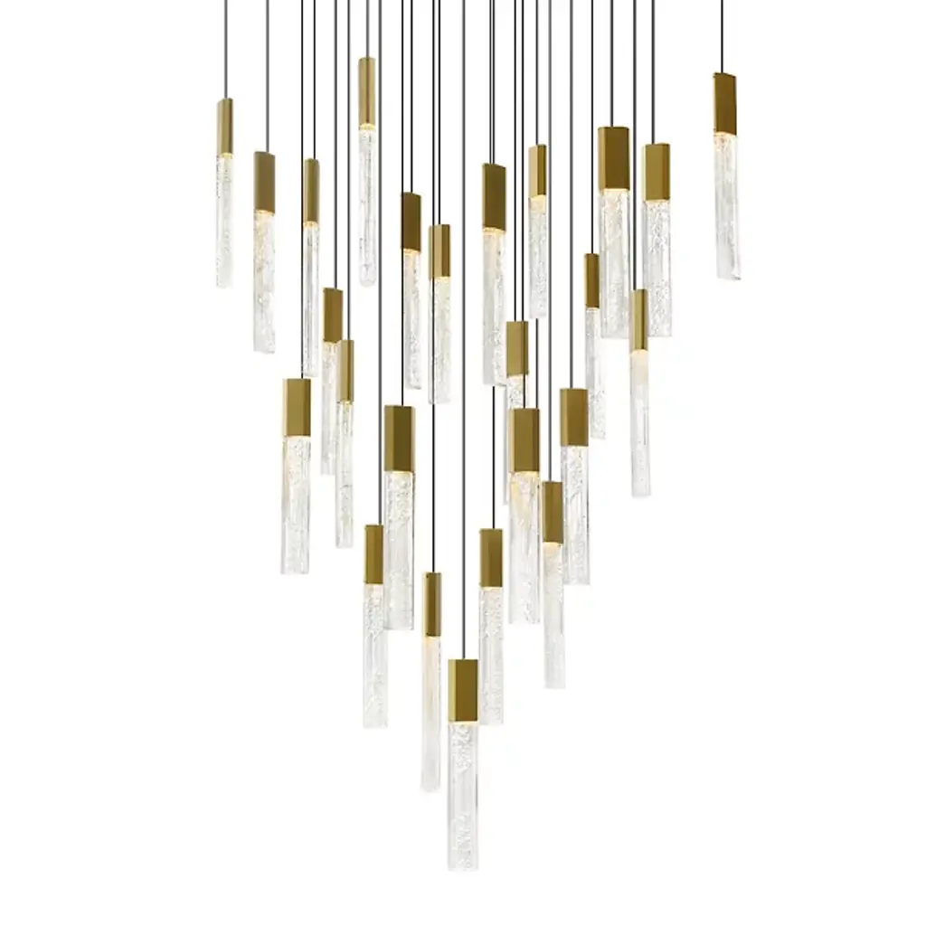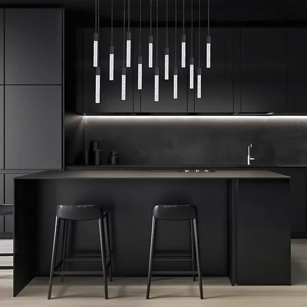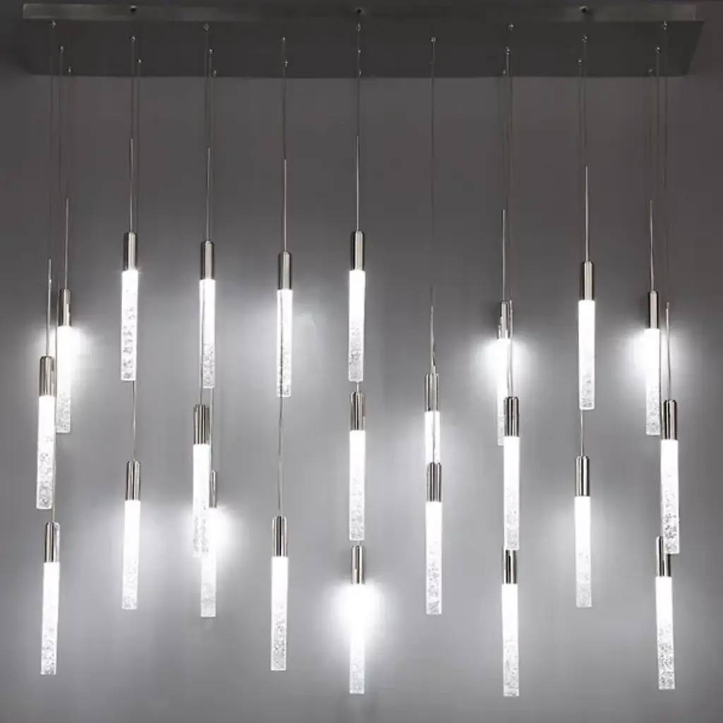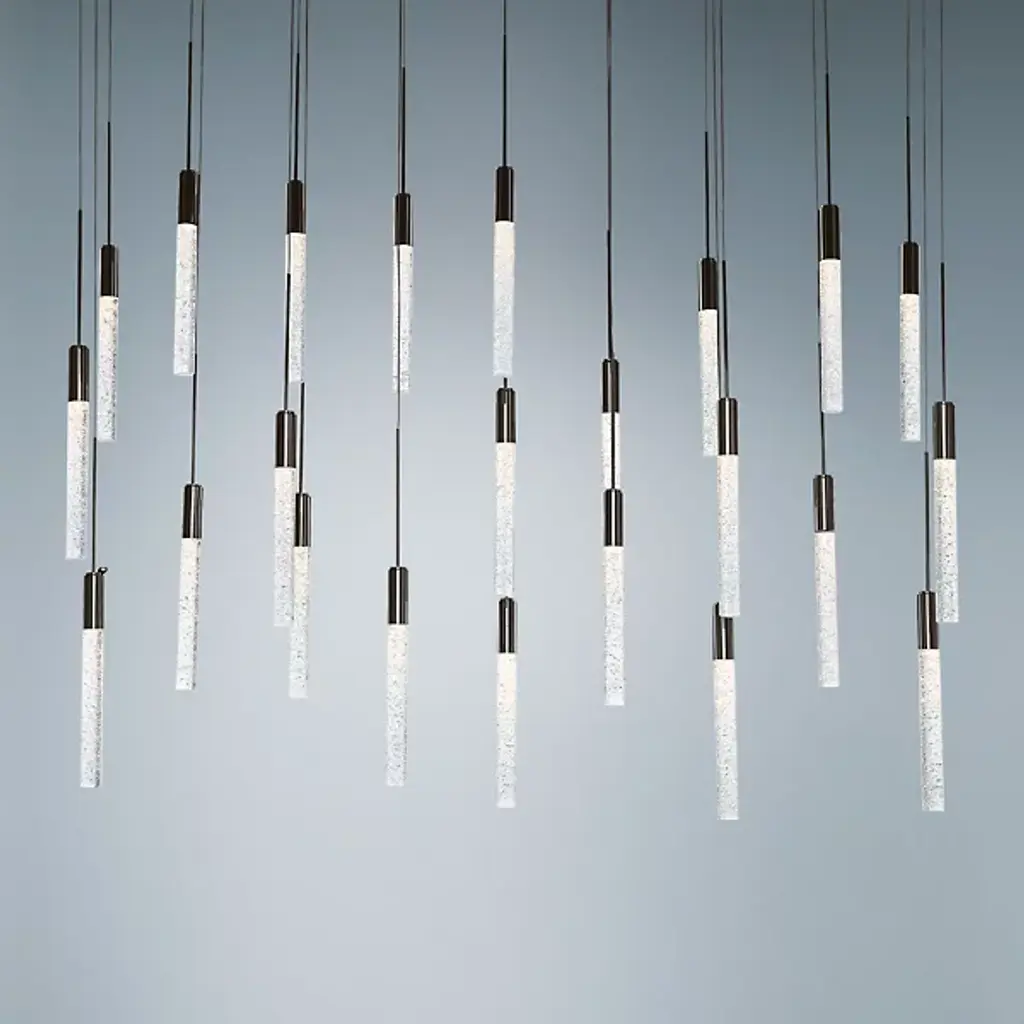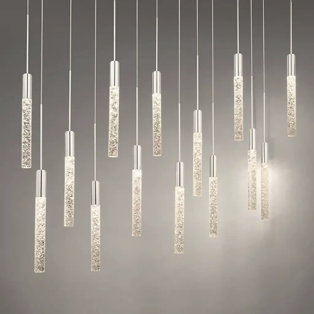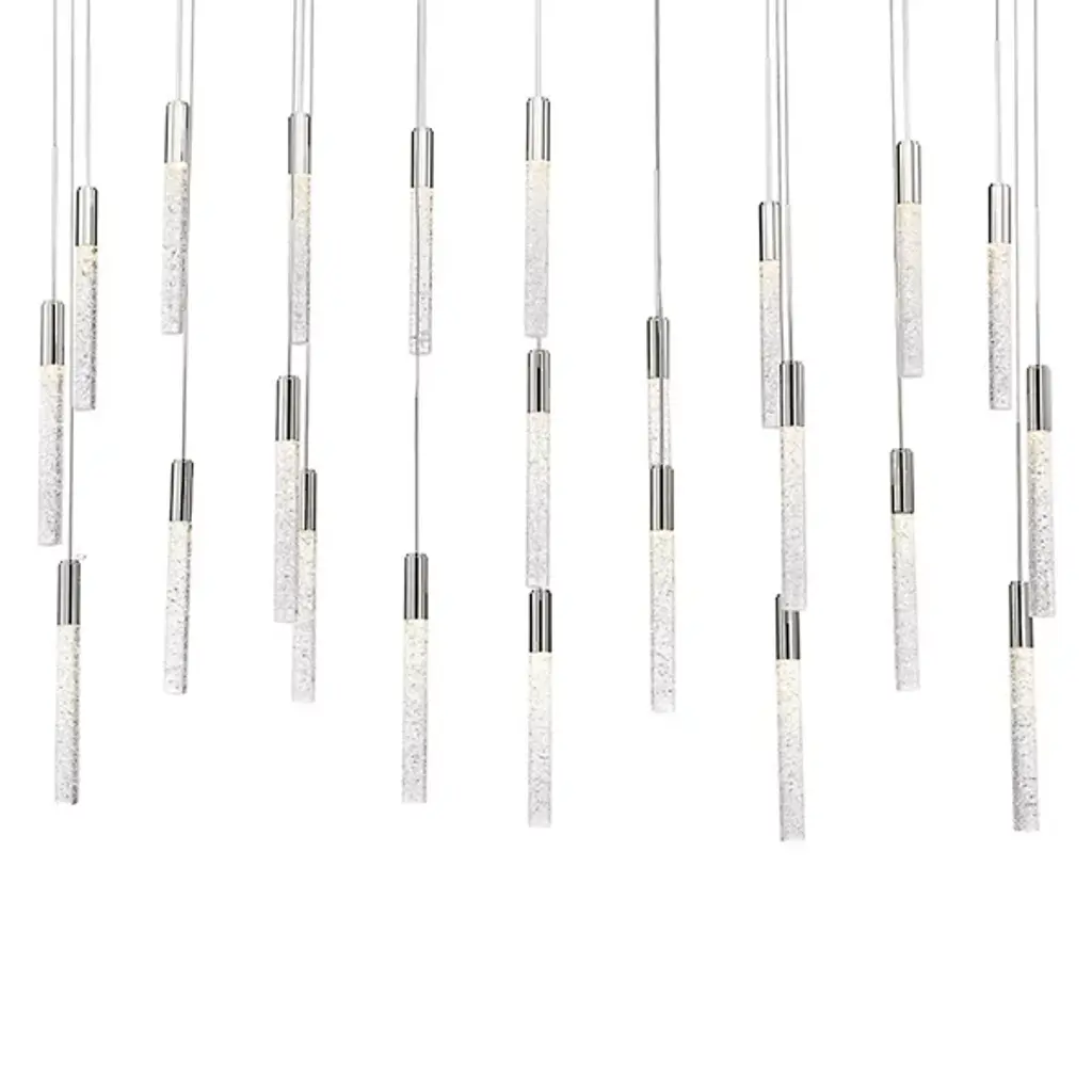 Post a contemporary curtain of dazzling illumination to your interiors with the Magic Rectangular Multi-Light LED Pendant from Modern Forms. The piece starts with a wide, stepped rectangular canopy of smooth aluminum that drops evenly spaced cylindrical housings from slender cables at different heights to form a pleasantly natural pattern. Further, the housings hold integrated LEDs above Piastra crystal rods, which uses their textured structure to ease glare into a warmer radiance around the fixture.