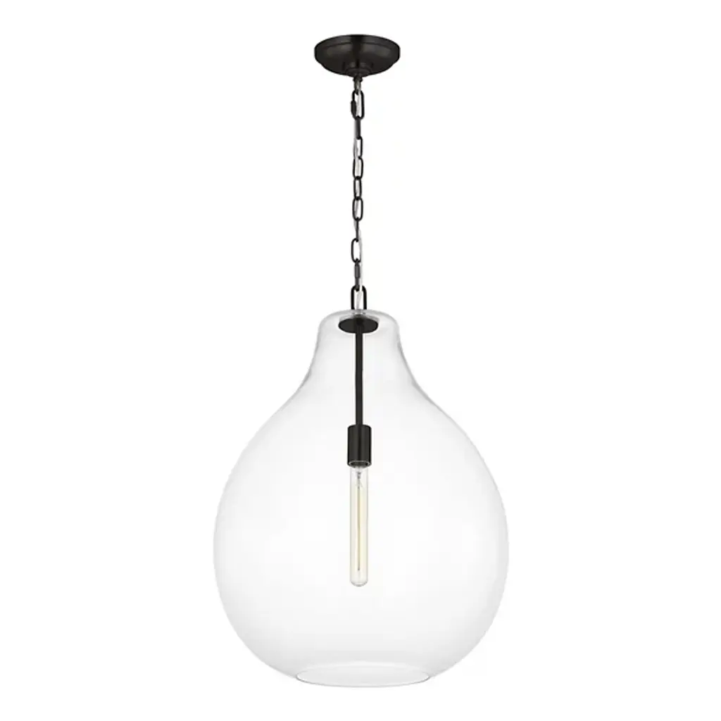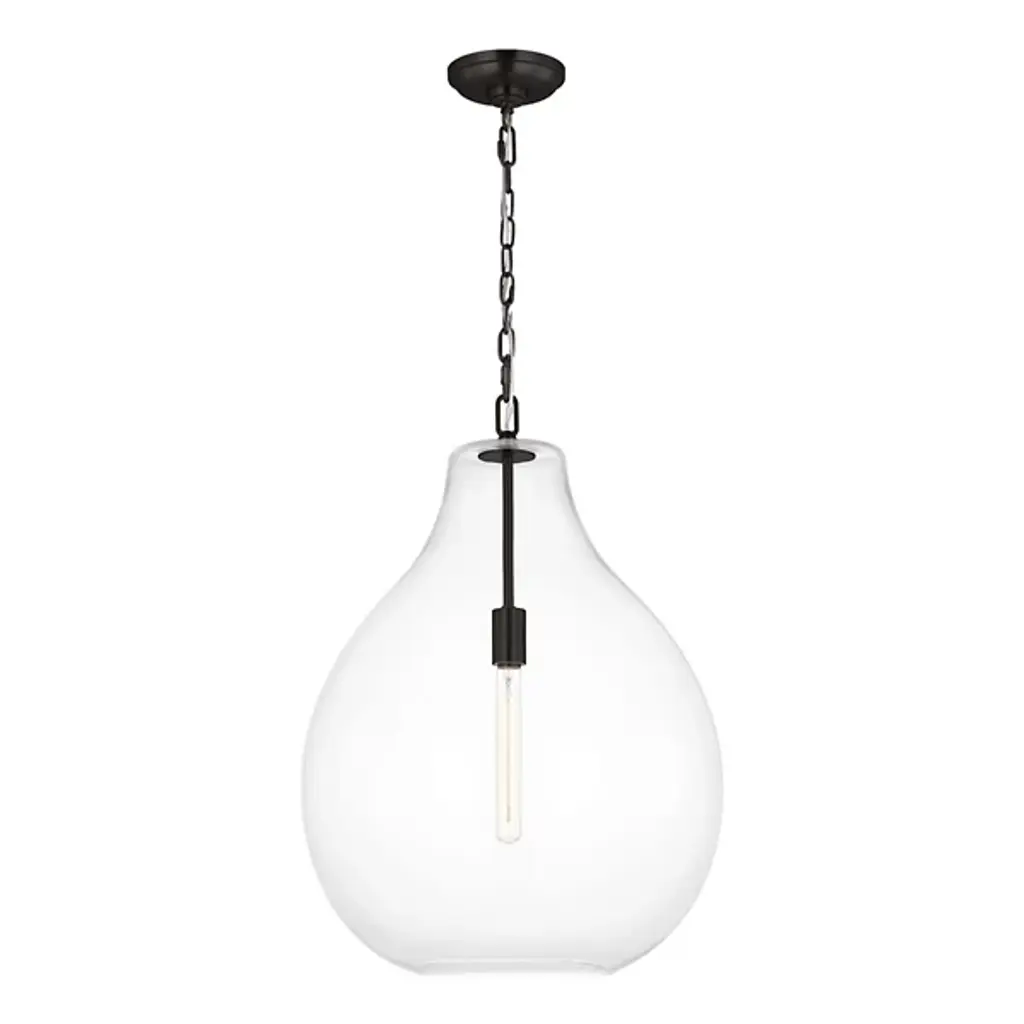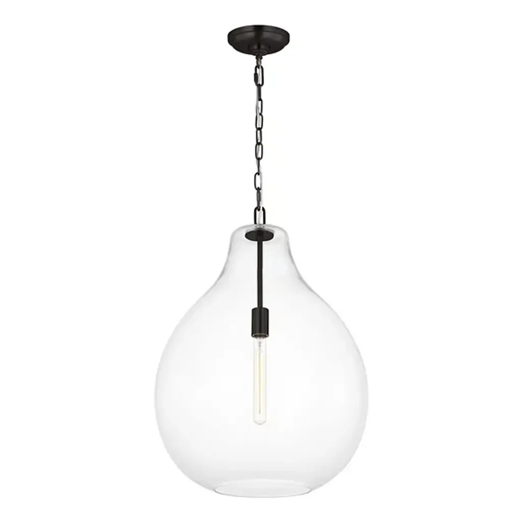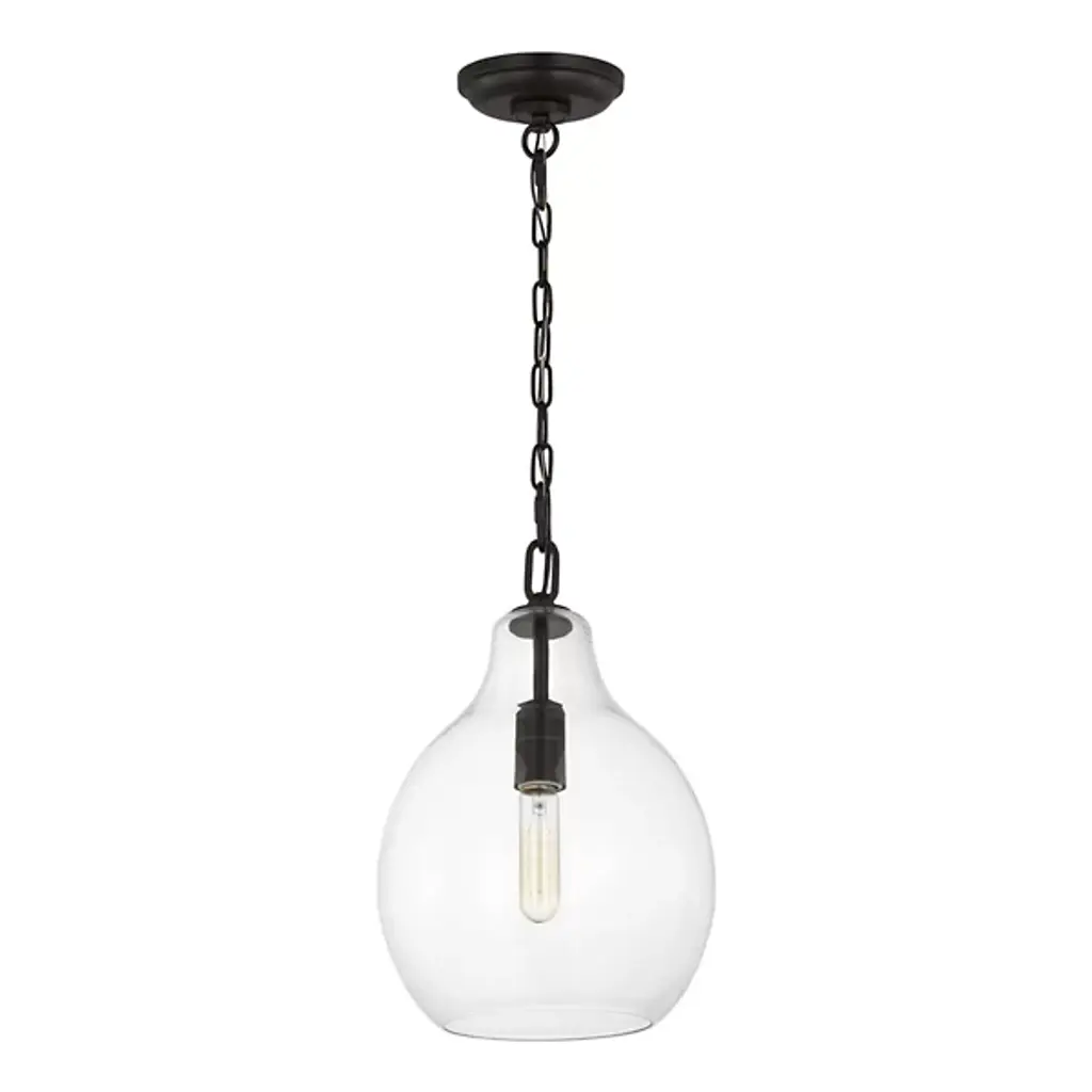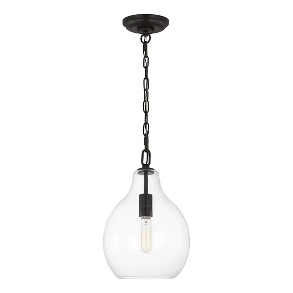 The Magnus Pendant from Visual Comfort Studio is designed by Ellen DeGeneres. It features a bulbously shaped glass shade open at the bottom, allowing the light from an LED to splay throughout your living space effortlessly. The LED is supported by steel and is secured to a ceiling canopy and a linked chain. Change the brightness level of this sloped-ceiling adaptable pendant using a separately sold ELV dimmer. Magnus infuses your décor with a contemporary touch.