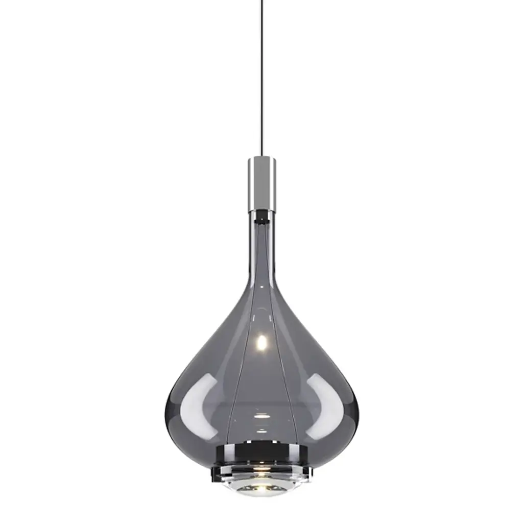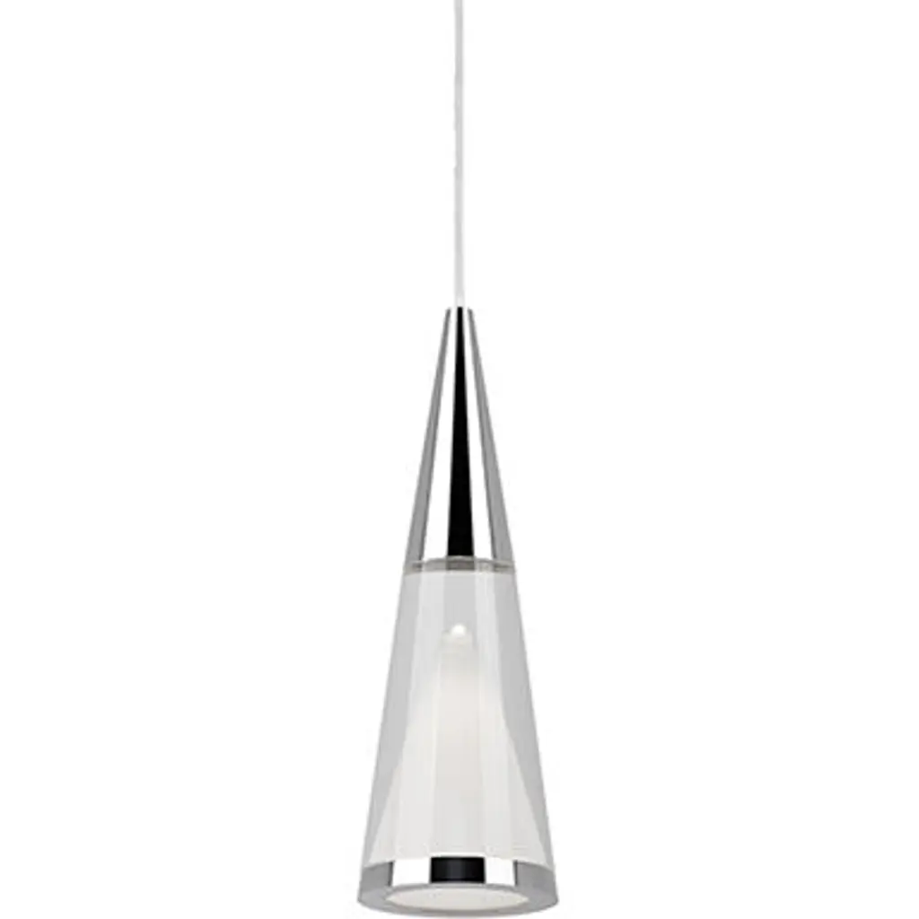Single LED lamp pendant, unique conical shape with chrome tip, clear with internal frosted designed acrylic and chrome trimmed diffuser with frosted center. Chrome canopy and metal details. Equipped with our powerful 120V AC LED technology. Available in a variety of multi-pendant options see series for family details.
