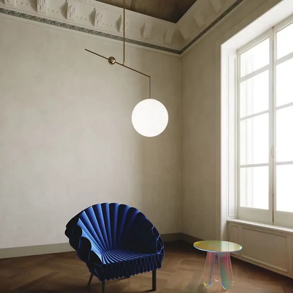 Drawing its name from the Hebrew meaning for ‘up and down,’ the Malamata Pendant from Luceplan does just that to offer a dashing silhouette and tailored light. Studio Shulab illustrates their design ideas with purified and simple forms. This pendant starts with an understated canopy for easy placement in tight spaces. It produces a slender downrod that surprises with an elegant ball joint. This ball joint can be adjusted to create a flat arm silhouette or an angular one. Supported by a globe counterweight, a blown glass shade hangs below with a pristine surface. Whether up high or down low, this globe generates an inviting ambient aura.
