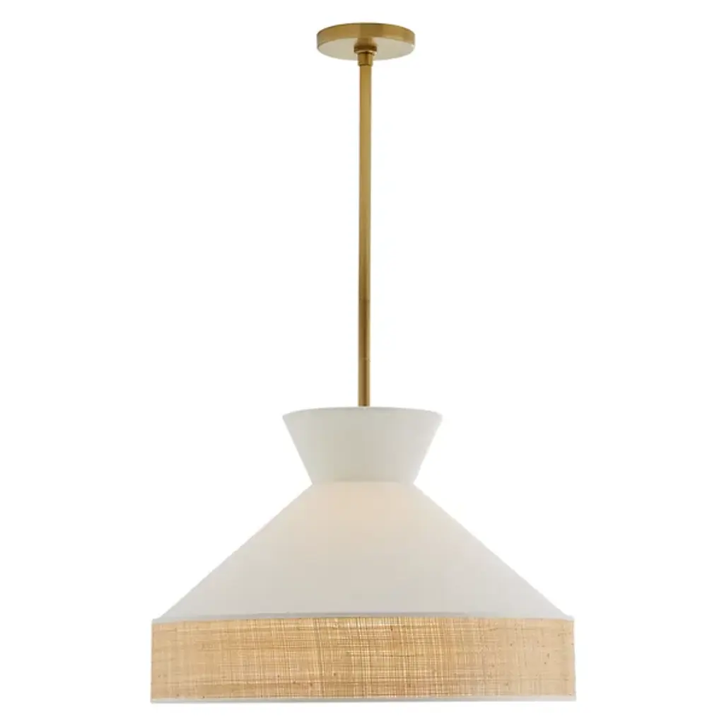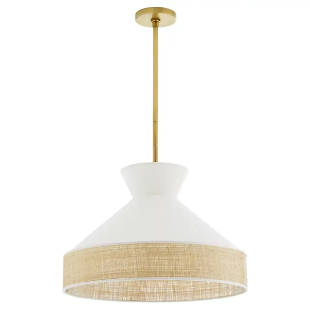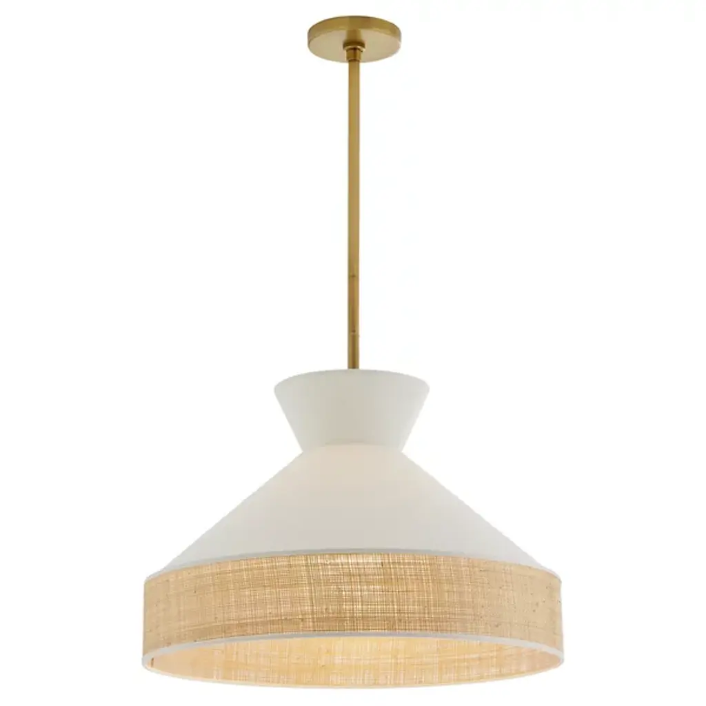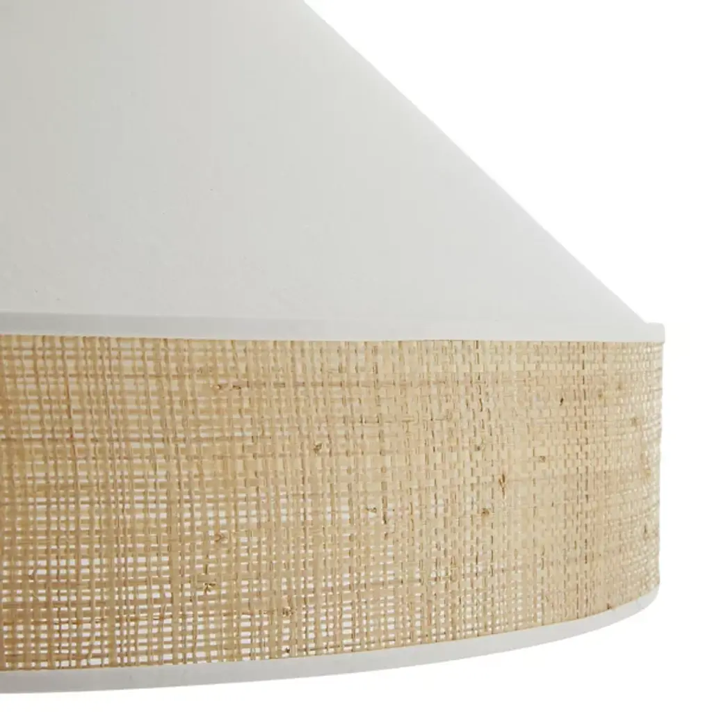 Expand inner ceilings with the simple geometric lines of the Malena Pendant from Arteriors. Secured by a sleek circular canopy in steel, it dispatches a central stem to single-socket lamping below, surrounded by a conical linen shade with a smaller inverted accent that rises in the opposite direction. This elegant ensemble is completed with a ring of rattan that sweeps around the shade’s lower edge, further focusing direct light from the lamping into a pool of downlight accompanied by an even ambiance cast through the shade’s translucent surface.