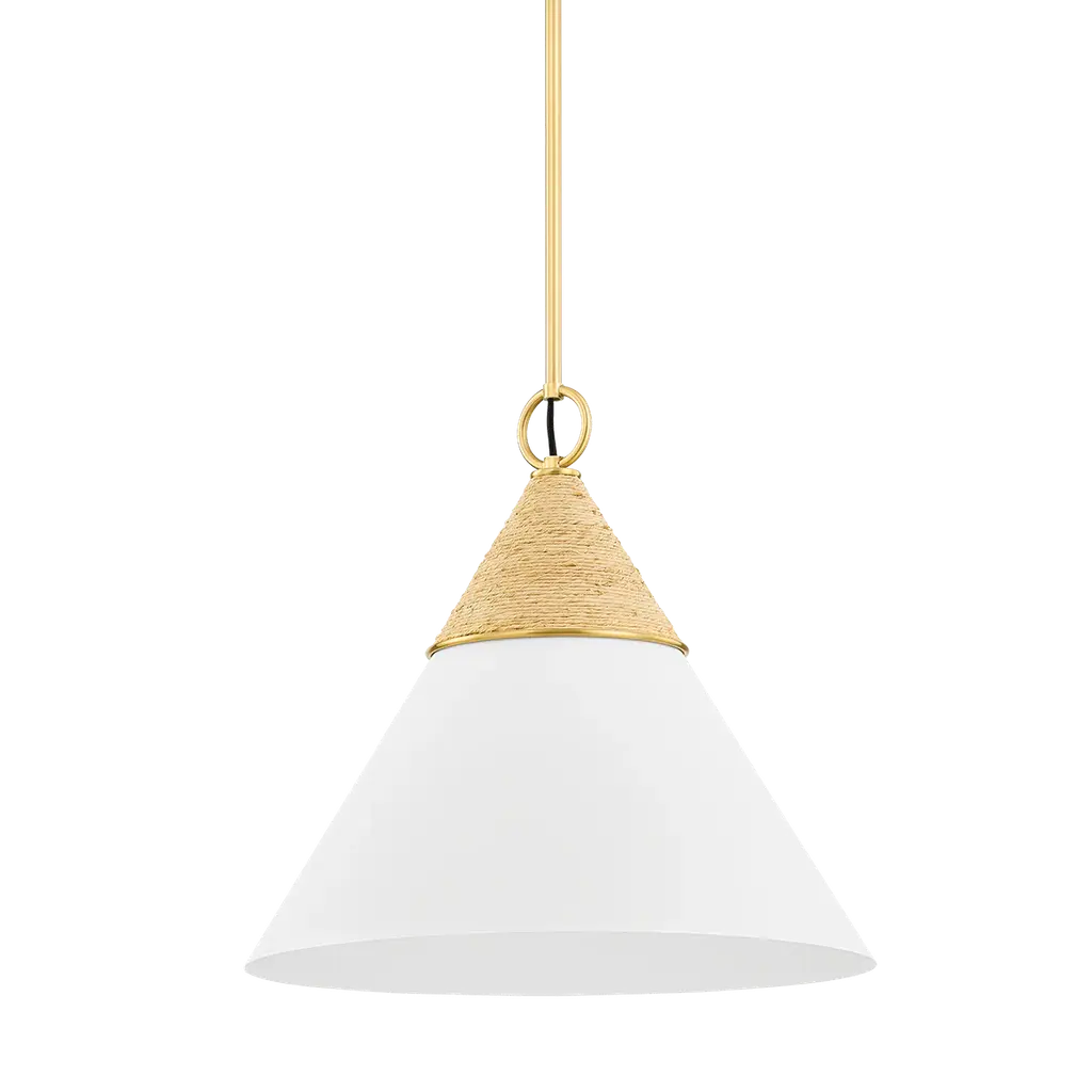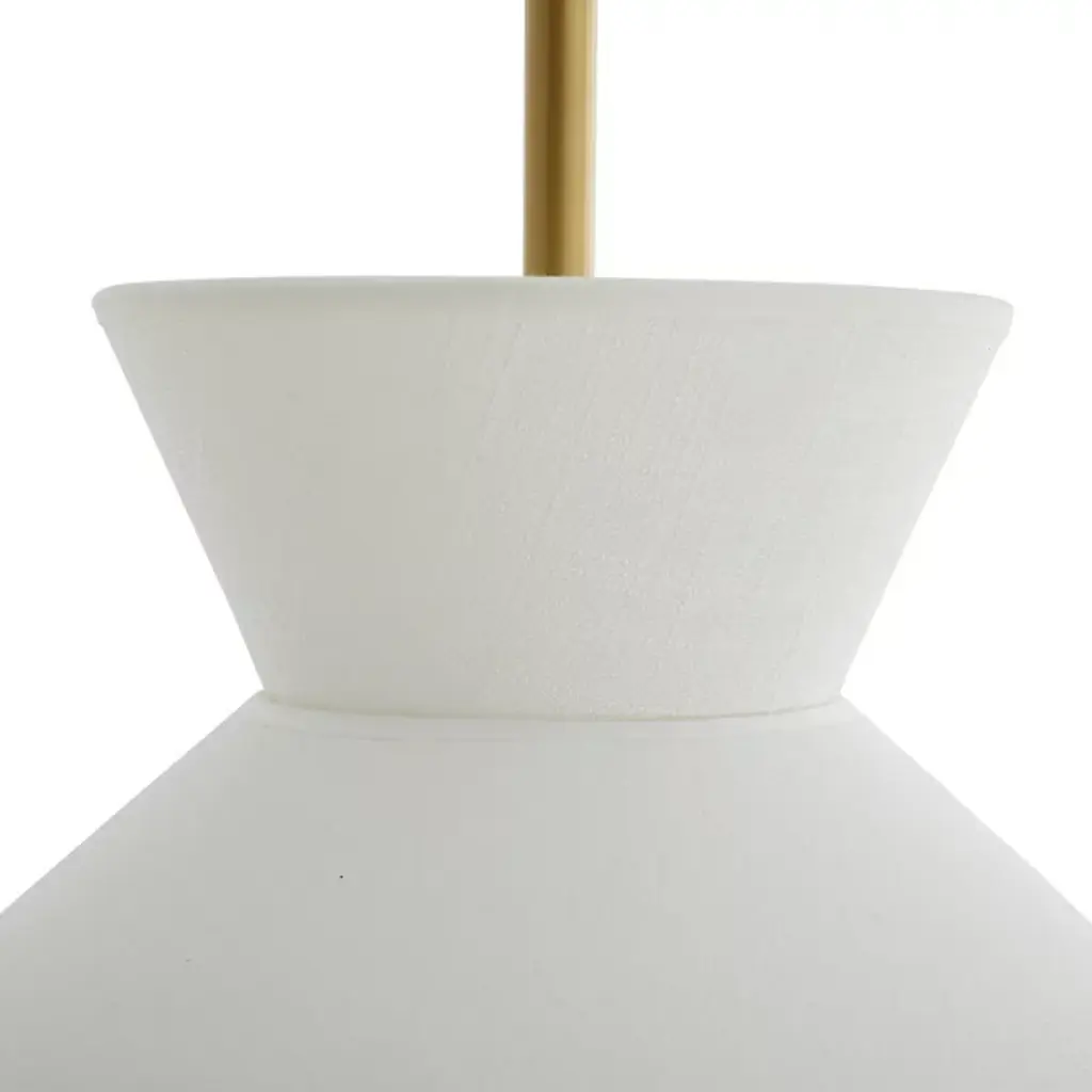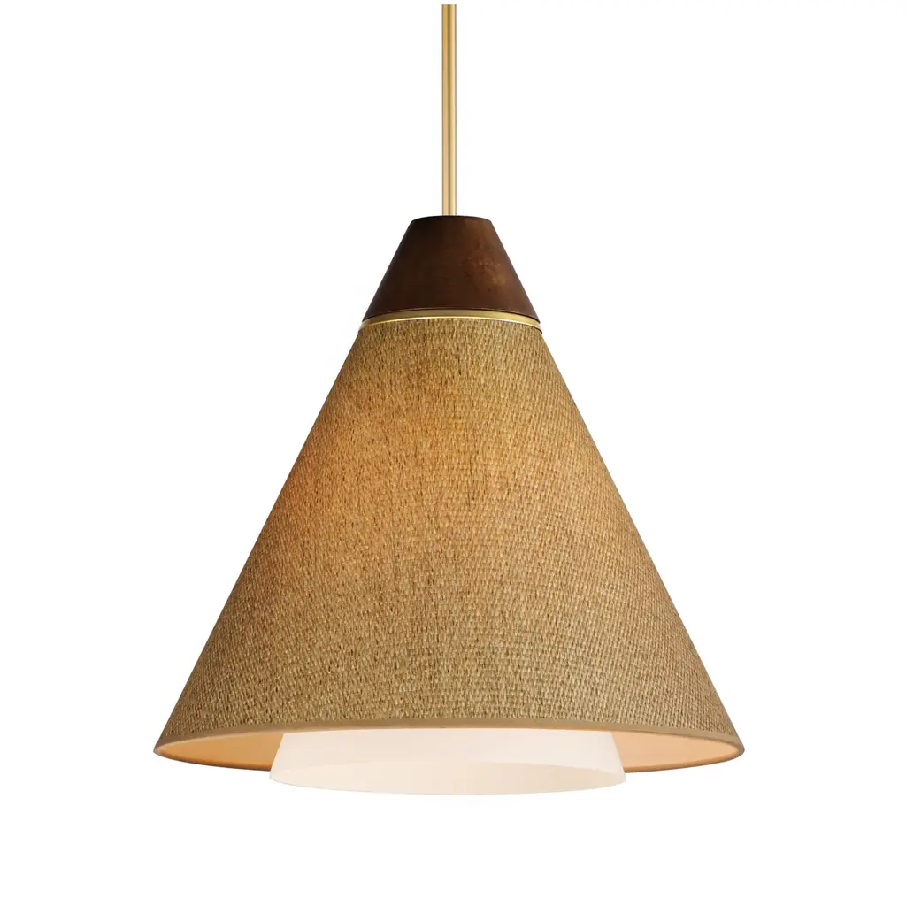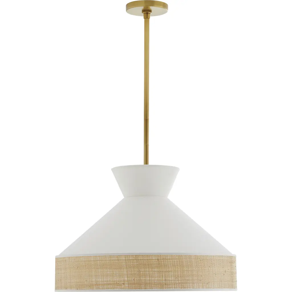 Expand inner ceilings with the simple geometric lines of the Malena Pendant from Arteriors. Secured by a sleek circular canopy in steel, it dispatches a central stem to single-socket lamping below, surrounded by a conical linen shade with a smaller inverted accent that rises in the opposite direction. This elegant ensemble is completed with a ring of rattan that sweeps around the shade’s lower edge, further focusing direct light from the lamping into a pool of downlight accompanied by an even ambiance cast through the shade’s translucent surface.