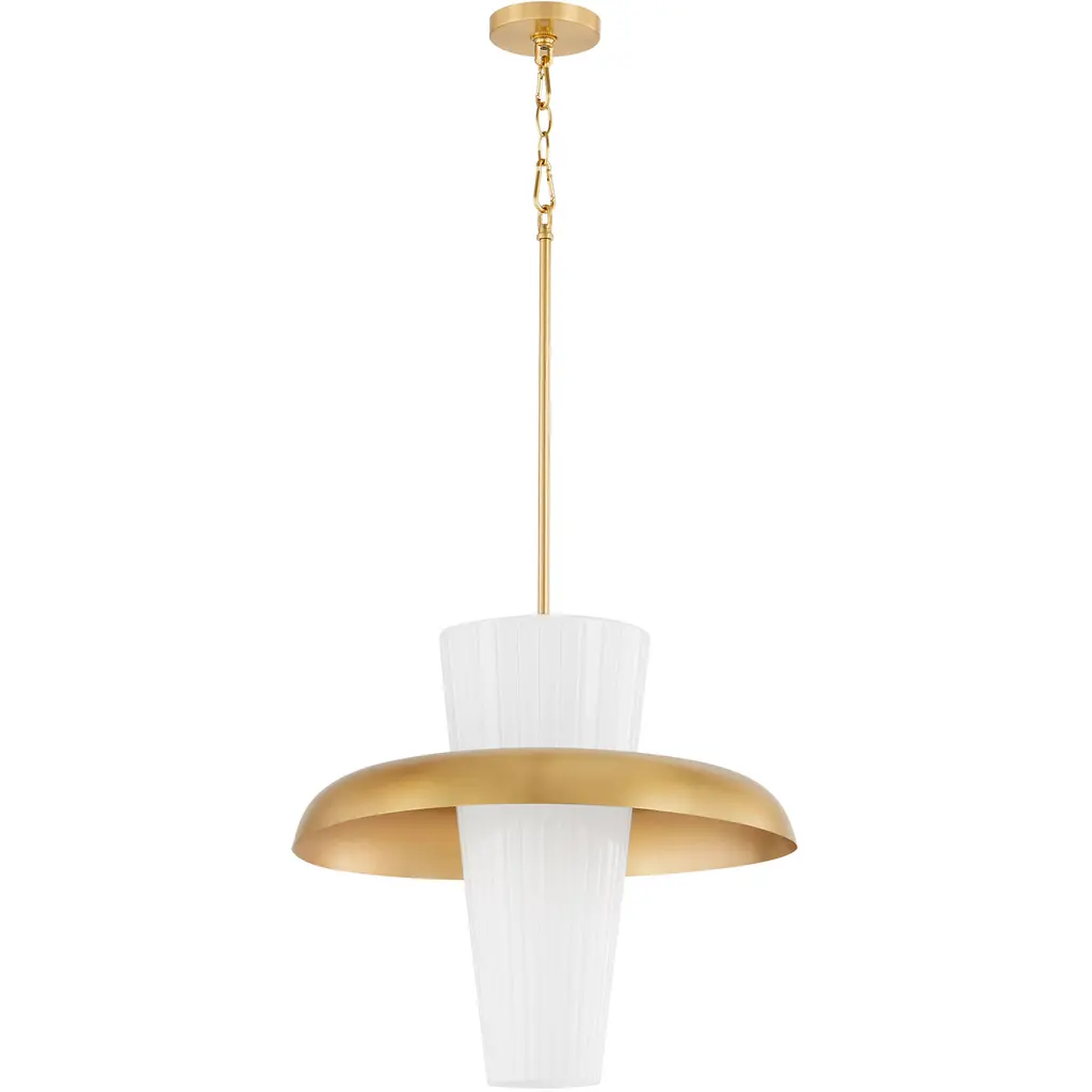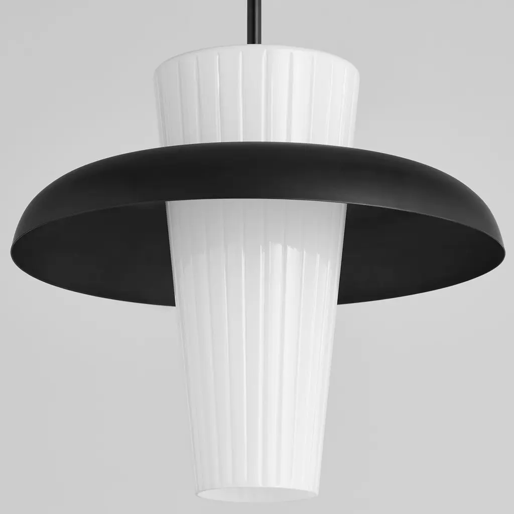 The central feature of the Mallory pendant light is an upside-down, Opal fluted glass cone that extends from the metal bowl. Beautifully crafted with a series of horizontal ribbed lines, the glass cone creates a unique texture that adds visual interest and diffuses light in an elegant and captivating manner. Choose from 18-inch or 20-inch options in matte black or aged brass finishes.