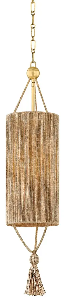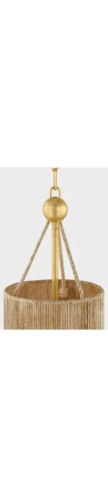 Referencing the construction of traditional Chinese lanterns, the Reyn family elevates drum silhouettes with jewelry-like embellishments. The pendants feature natural woven string in the shades and tassels, while the sconces are accented by wooden spheres. To balance the highly textural nature of the materials, the metalwork is kept clean and minimal with an Aged Brass finish. Part of our Mandy Cheng collection.*Due to the one-of-a-kind nature of the medium, exact colors and patterns may vary slightly from the image shown.