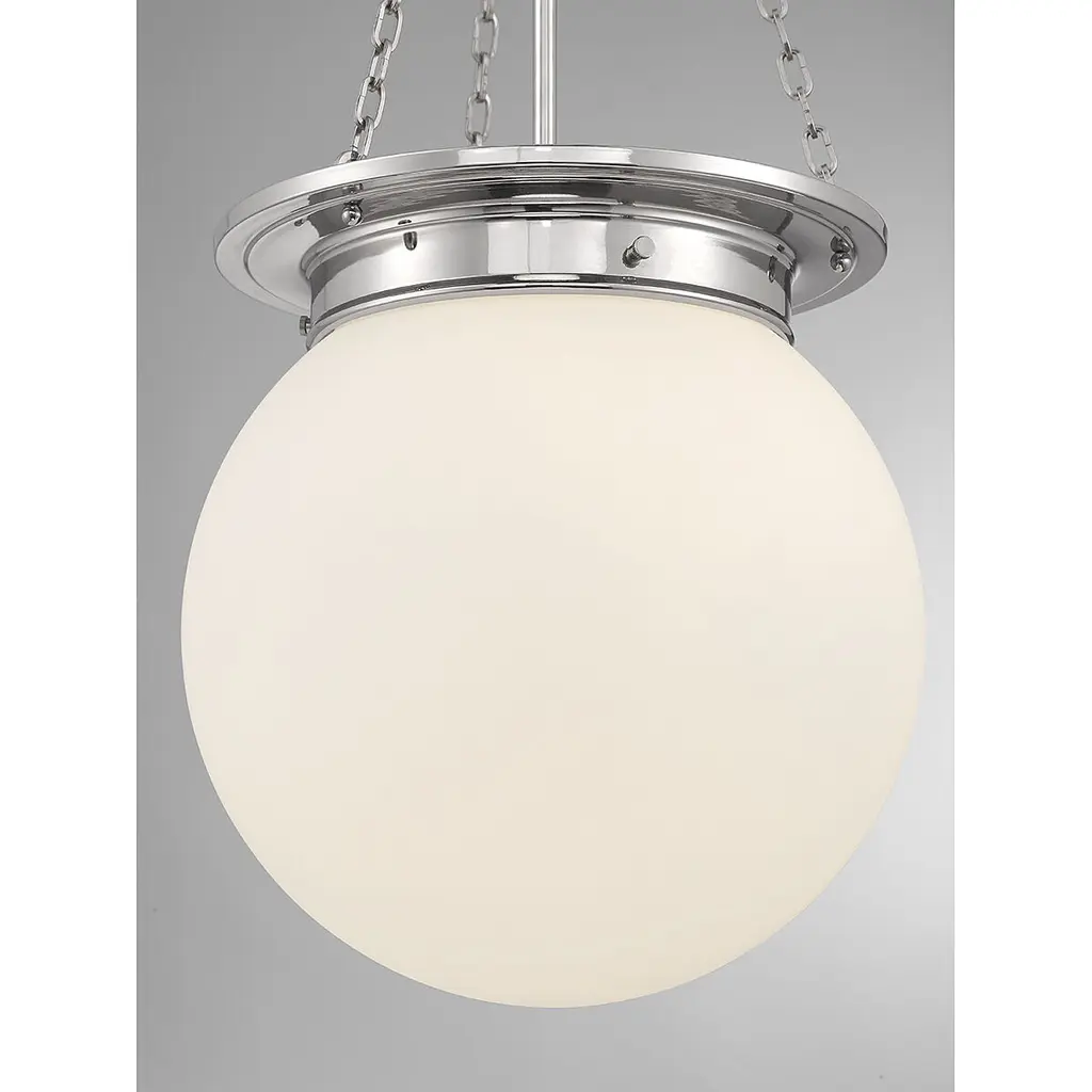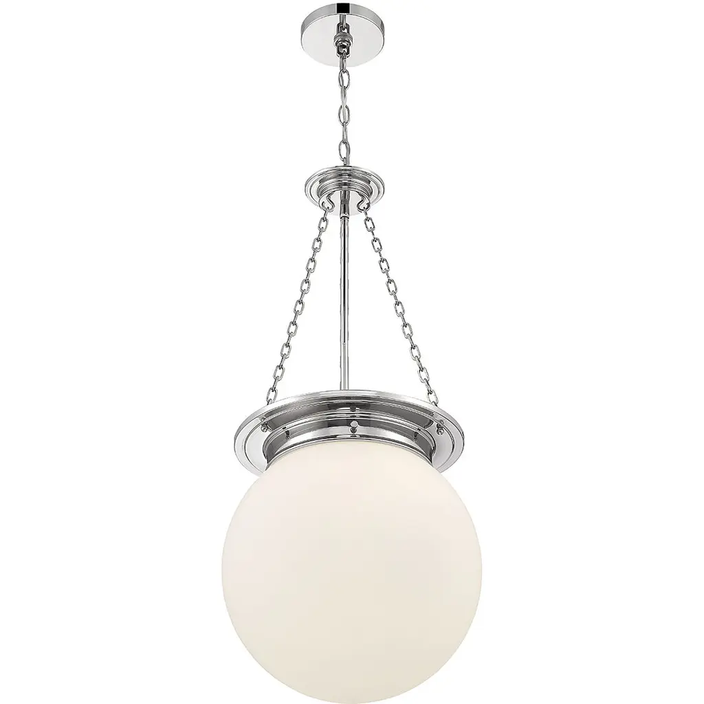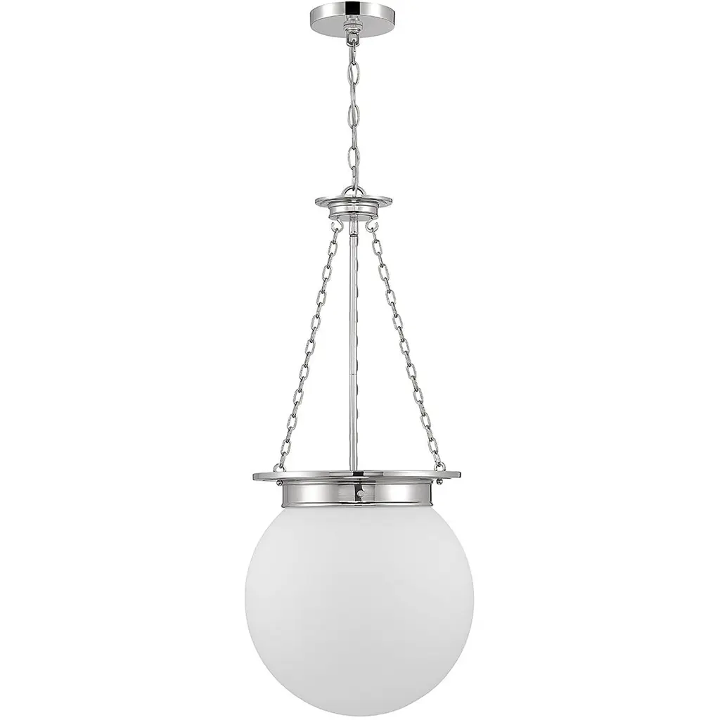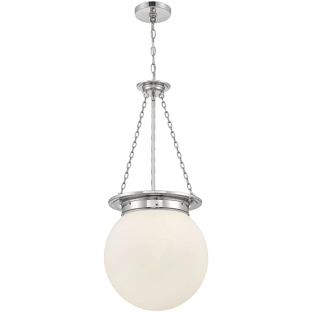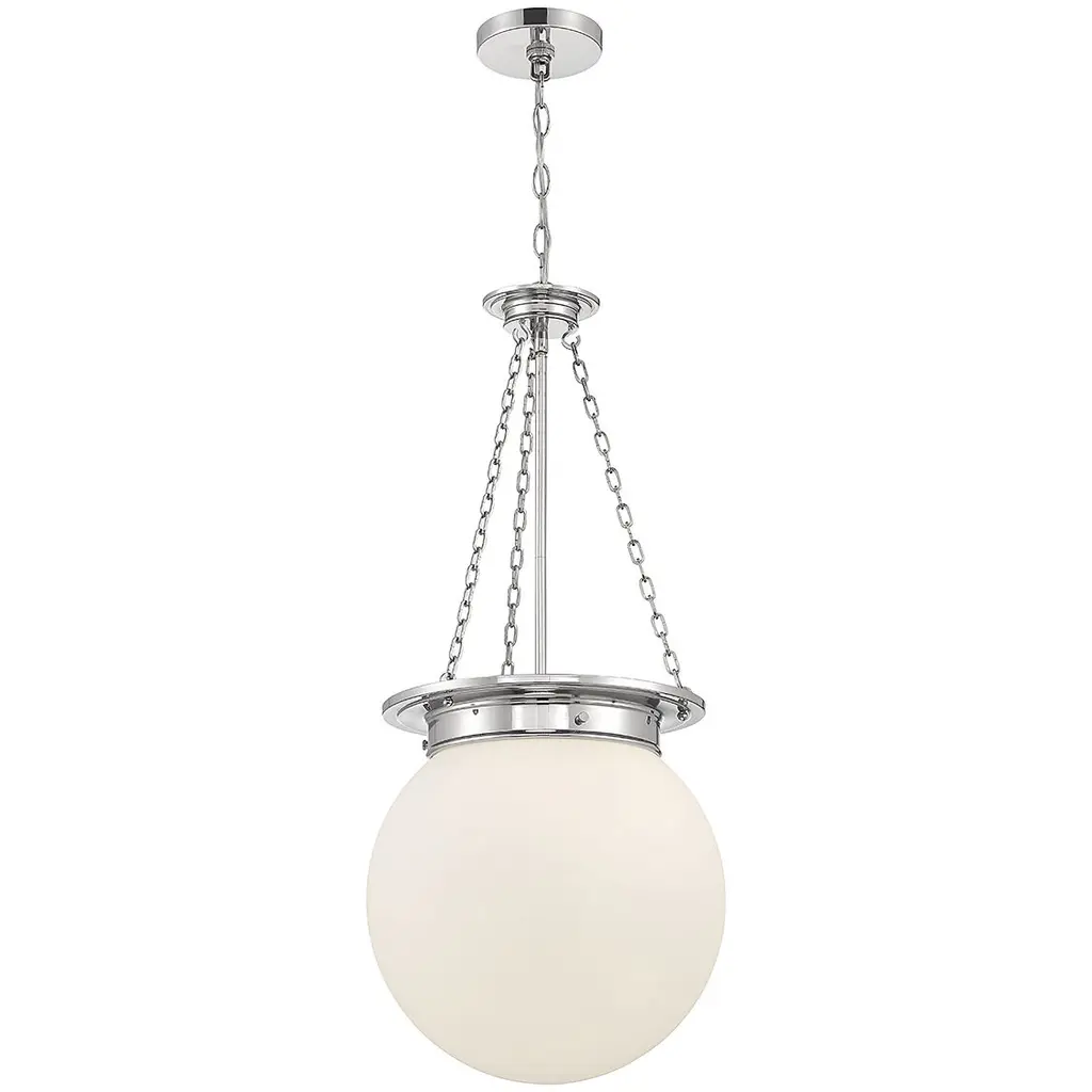 The Savoy House Manor 3-light pendant proves that a classic style can be stunning An orb-shaped shade of white opal glass hangs down from an understated structure with timeless details. Finished in polished nickel. Manor is 31 in height and 13.5 in width. It uses 3 candelabra size bulbs of up to 60 watts per bulb (bulbs not included).