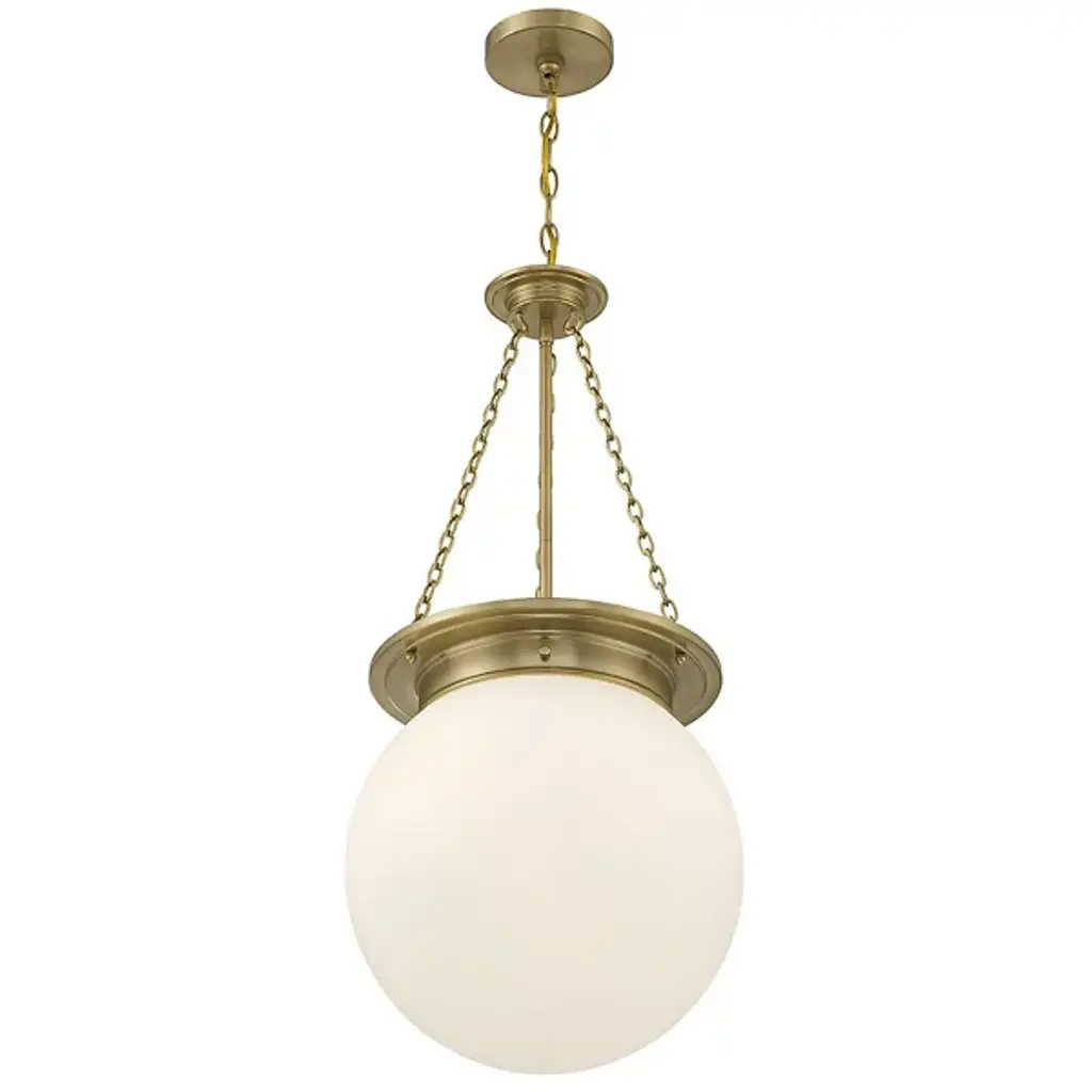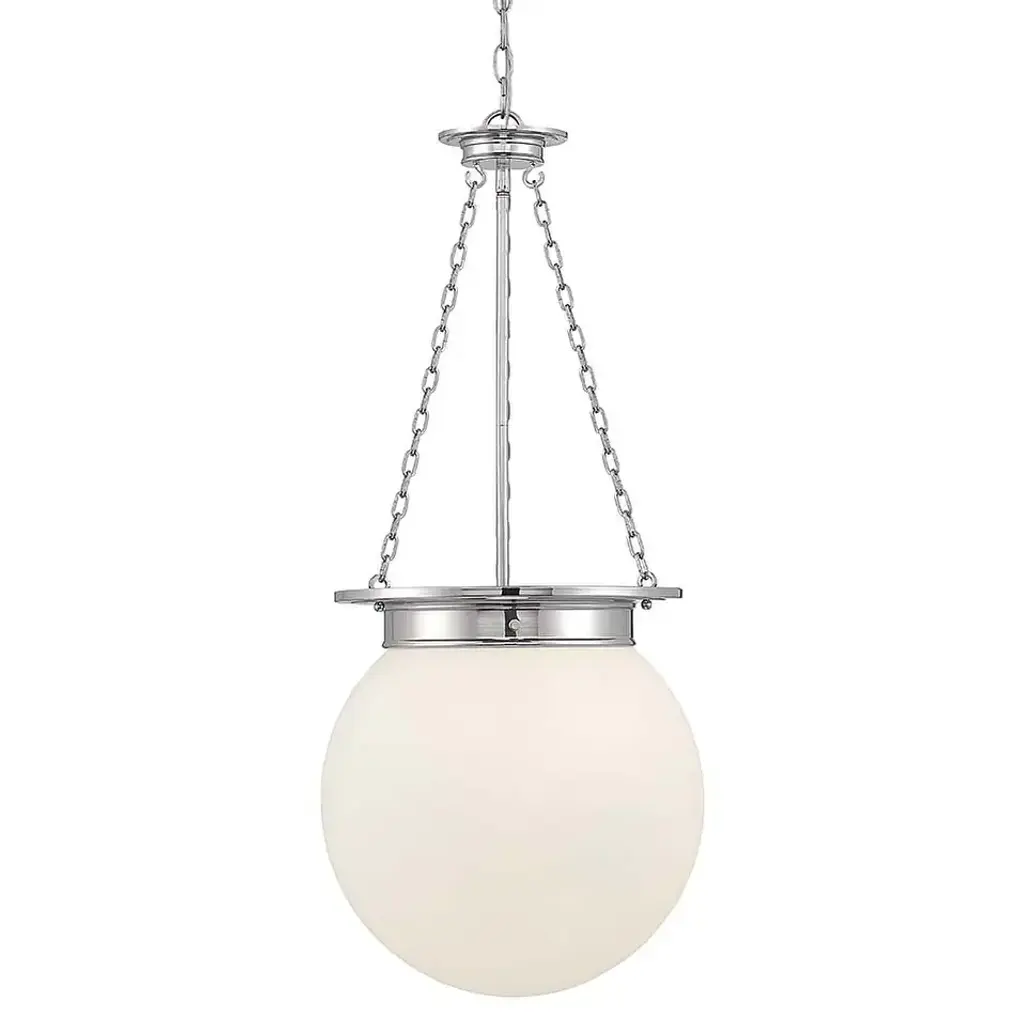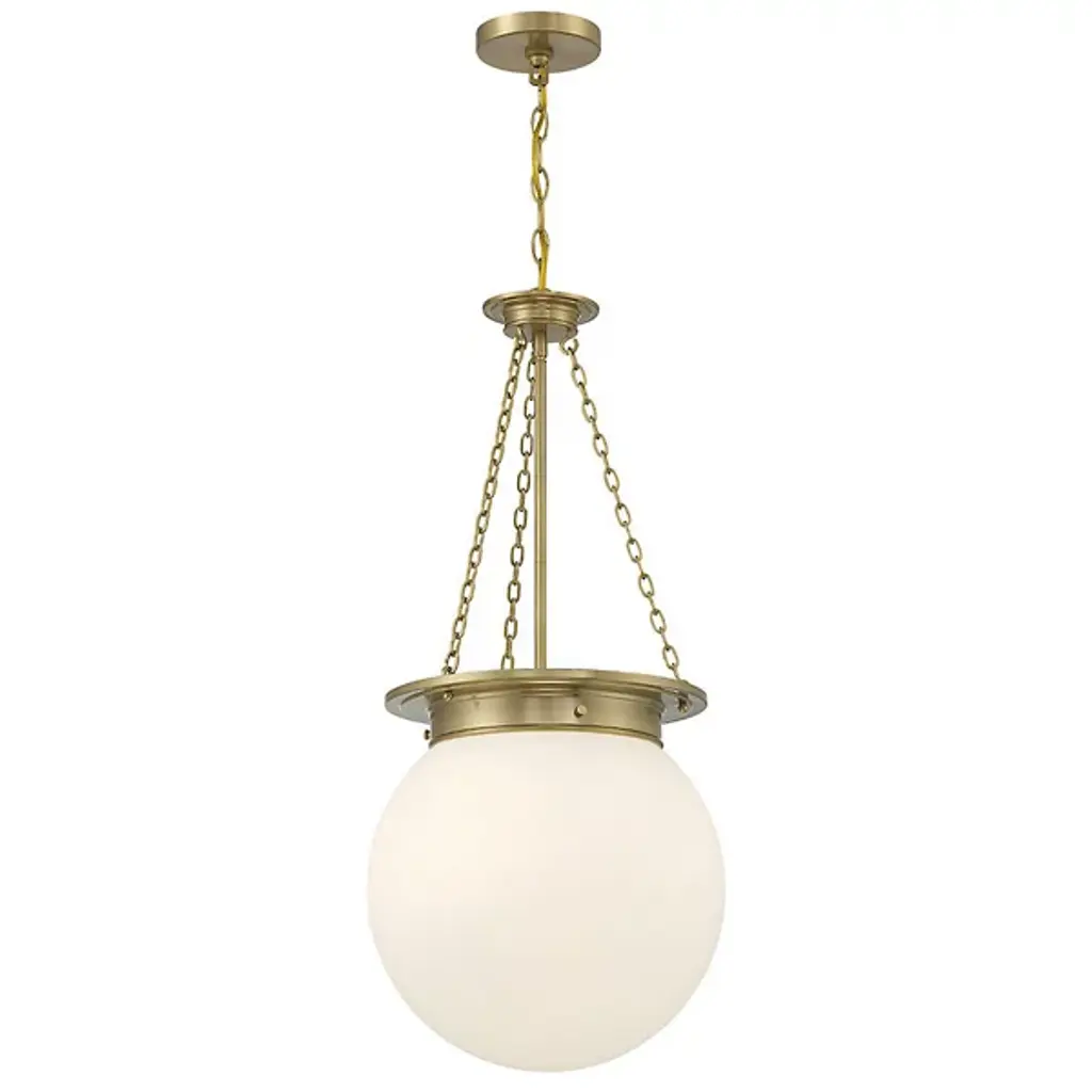 Grace your space with the modern-vintage fusion of the Manor Pendant from Savoy House. This classically inspired fixture proves traditional designs still shine, giving your décor an elevated touch or keeping it elegantly understated and featuring a smooth round opal glass orb shade suspended from an understated metal ring. Fine chain accents add a touch of flair, while the clean-lined metal framework provides a canvas for the pendant's focal point—that glowing glass globe. With its interplay of modern and vintage vibes, the pendant shines, bringing a luminous grace overhead.