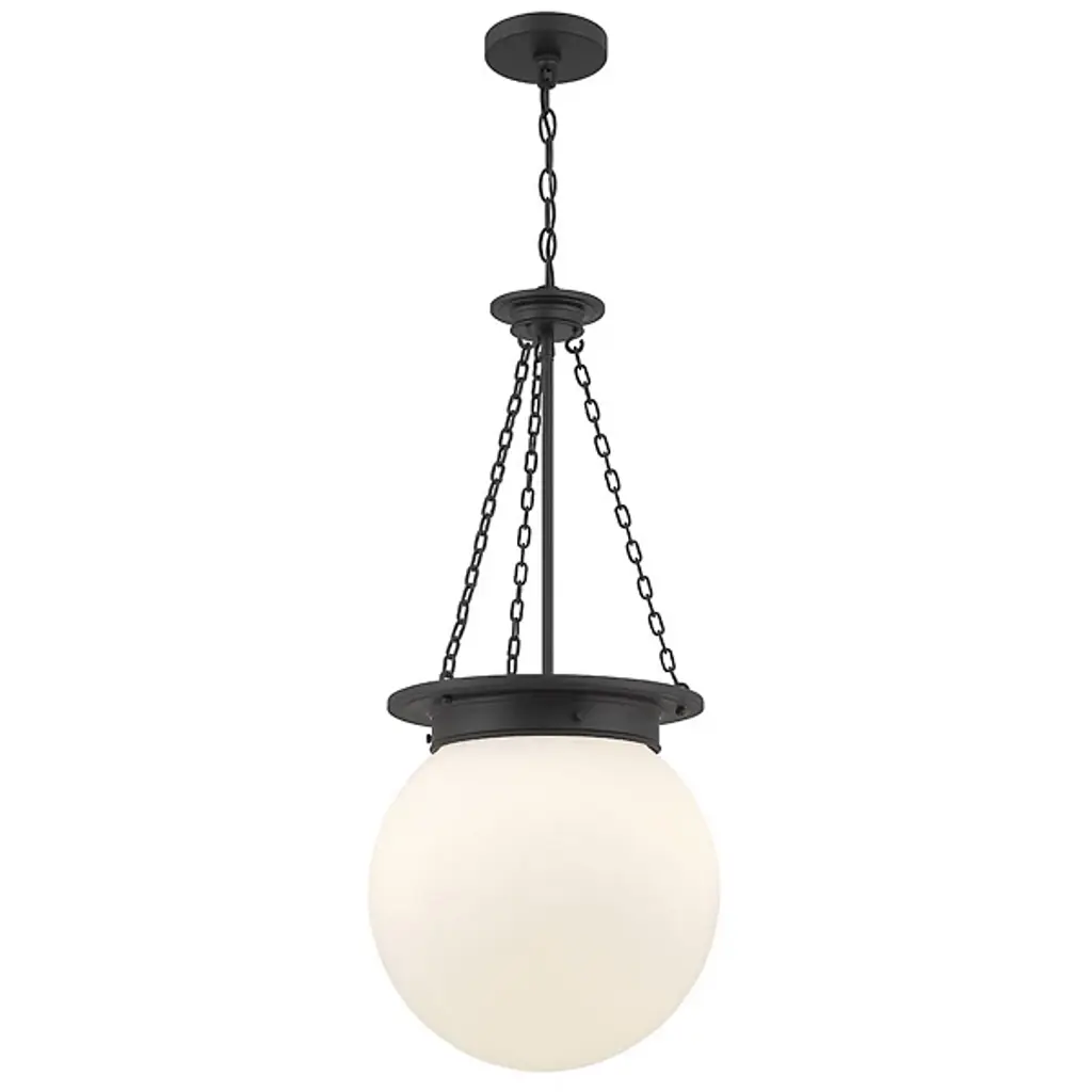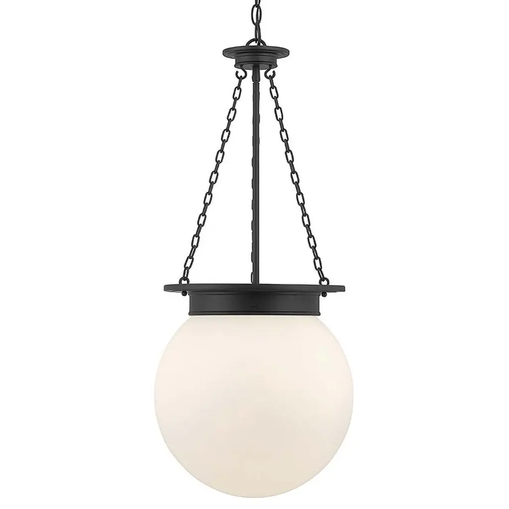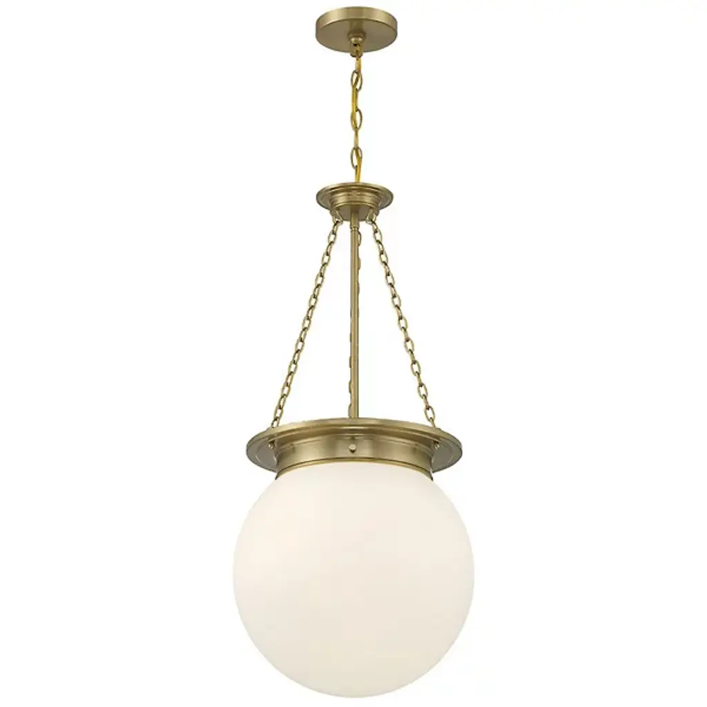 Grace your space with the modern-vintage fusion of the Manor Pendant from Savoy House. This classically inspired fixture proves traditional designs still shine, giving your décor an elevated touch or keeping it elegantly understated and featuring a smooth round opal glass orb shade suspended from an understated metal ring. Fine chain accents add a touch of flair, while the clean-lined metal framework provides a canvas for the pendant's focal point—that glowing glass globe. With its interplay of modern and vintage vibes, the pendant shines, bringing a luminous grace overhead.