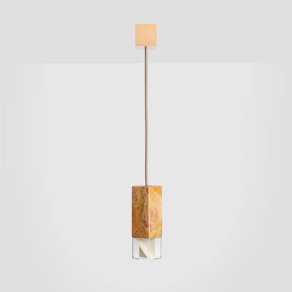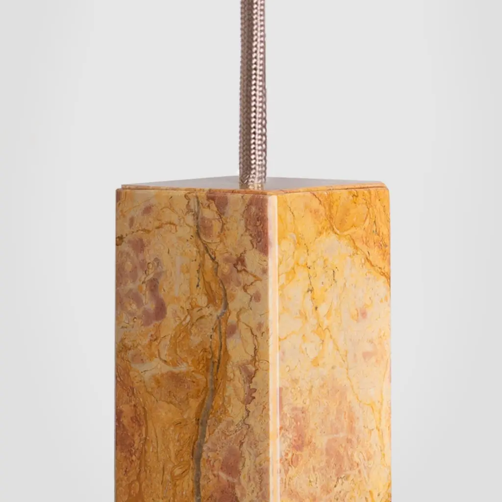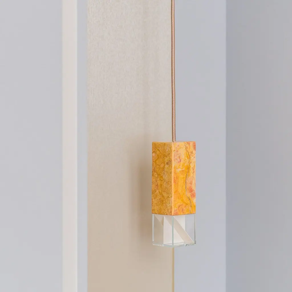 Lamp one color edition by FormaminimaDimensions: 5 x 5 x H 17 cmMaterials: Lamp body in marble giallo reale rosatoUltra- thin anti-reflection crystal diffuserInside- diffuser Limoges biscuit-finish porcelain sheetsSatin brass ceiling rose H 5 x 5 x 5 cmLight source supplied per lamp:LED 1xG9 max 2.6W, 50-60Hz G9 connection320lm 2700K Rc 80 EU standard compliantVoltage: 220-240v (120v available upon request)Supplied accessories:Adjustable fabric cable: 2 x 0.75 Ø 6.2 mm L 2mMounting kit: screws UX Fischer screws (2x)Ø 6mm x 30mm, satin brass ceiling roseDecorative pendant lamp for indoor use.We chose to employ exclusively local materials, respecting, preserving and enhancing traditional techniques, such as marble-carving, crystal-glass grinding, Limoges porcelain mold-production. The Colour-Edition Chandelier shows handcrafted decorative hanging lamps realized through a selection of iconic italian marbles, inspired by the most outstanding artistic movements of our Territory. Thisobject represented our tribute to Edit Napoli 1st Edition ( June 2019).Rosso Collemandina, original of Villa Collemandina, part of the “Appennino Tosco-Emiliano” National Park, is appreciated for its rich and intense chromatic tones.Verde Alpi is extracted from the heart of Western Alpes at 1.800 metres of altitude, in Val D’Aosta region. Its dramatic contrasts recall iconic architectures, thanks to itsdistinctive character. Giallo Reale Rosato, belonging to the gentle landscape of Verona, is celebrated for its prestigious yet eclectic touch.Both The Single Suspension series as well as The Chandelier series are characterized by the same endless passion for simplicity and attention for details that best representus. The inspiration, as well as the genesis of the entire design process, that led to the creation of the collection, belongs to the world of Porcelain, to its surface andstructural characteristics. Therefore, our project was born from the exploration of two-dimensional geometries on one hand, and on the other one, from the design intentaimed at researching lightness and thinness, bringing them to unforeseen results. As a consequence, this was a path subject to curiosity, to research, to the story of how alight beam may transform the features of a marble surface becoming translucent, and a porcelain sheet turning as thin as an eggshell.Formaminima is an emerging brand within the Italian Design panorama, prone to exploring the concept of object itself, in the field of lighting and product designin its broadest sense. This exploration starts in the first instance from the tradition, from the artisan mastery and that making full of charm, care, and perseverance.Each project is in fact crafted in those same places where the know-how is handed down and kept for generations, exclusively in our territory. Carefully selected workshops, ateliers, and studios become our precious partners in the creation of every single piece, conceived and designed by us. Therefore, in this latter, multiple knowledge is merged, especially that linked to high-quality materials, production processes, and an innovative aesthetic. Thus to achievewhat for us represents a contemporary Design Sleek Poetry.We create value through the Masterly realization of unique pieces, as well as minimizing the intermediation between the Design product and its audience. Hence our projects result in the outcome of a direct collaboration between our designers and the excellence of Italian craftsmanship, along with its valuable know-how. To this end, we believe that a slow design process, together with its time of thought andresearch, is essential for what we believe Good Design may be.So this latter, passing from the inspiration to the concrete realization of each of our design creation, arrives directly to the customer.