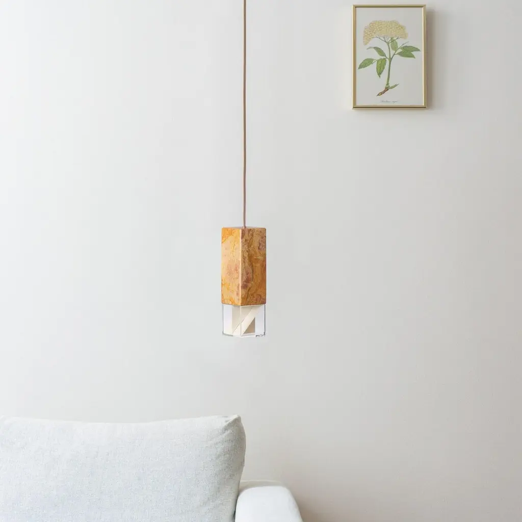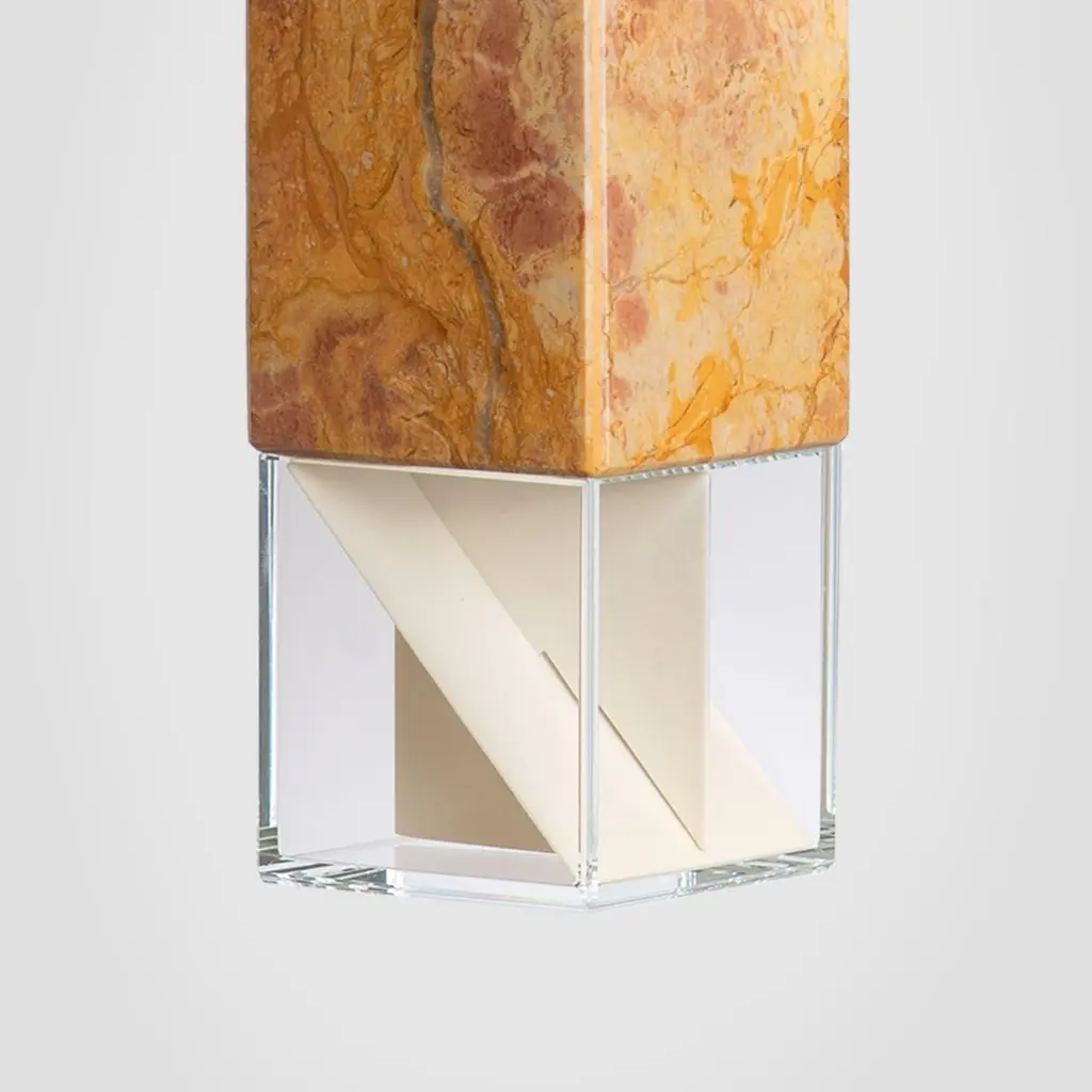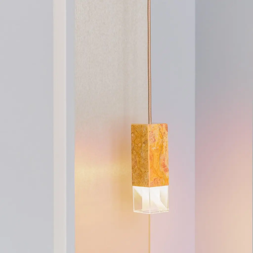 Lamp one color edition by FormaminimaDimensions: 5 x 5 x H 17 cmMaterials: Lamp body in marble giallo reale rosatoUltra- thin anti-reflection crystal diffuserInside- diffuser Limoges biscuit-finish porcelain sheetsSatin brass ceiling rose H 5 x 5 x 5 cmLight source supplied per lamp:LED 1xG9 max 2.6W, 50-60Hz G9 connection320lm 2700K Rc 80 EU standard compliantVoltage: 220-240v (120v available upon request)Supplied accessories:Adjustable fabric cable: 2 x 0.75 Ø 6.2 mm L 2mMounting kit: screws UX Fischer screws (2x)Ø 6mm x 30mm, satin brass ceiling roseDecorative pendant lamp for indoor use.We chose to employ exclusively local materials, respecting, preserving and enhancing traditional techniques, such as marble-carving, crystal-glass grinding, Limoges porcelain mold-production. The Colour-Edition Chandelier shows handcrafted decorative hanging lamps realized through a selection of iconic italian marbles, inspired by the most outstanding artistic movements of our Territory. Thisobject represented our tribute to Edit Napoli 1st Edition ( June 2019).Rosso Collemandina, original of Villa Collemandina, part of the “Appennino Tosco-Emiliano” National Park, is appreciated for its rich and intense chromatic tones.Verde Alpi is extracted from the heart of Western Alpes at 1.800 metres of altitude, in Val D’Aosta region. Its dramatic contrasts recall iconic architectures, thanks to itsdistinctive character. Giallo Reale Rosato, belonging to the gentle landscape of Verona, is celebrated for its prestigious yet eclectic touch.Both The Single Suspension series as well as The Chandelier series are characterized by the same endless passion for simplicity and attention for details that best representus. The inspiration, as well as the genesis of the entire design process, that led to the creation of the collection, belongs to the world of Porcelain, to its surface andstructural characteristics. Therefore, our project was born from the exploration of two-dimensional geometries on one hand, and on the other one, from the design intentaimed at researching lightness and thinness, bringing them to unforeseen results. As a consequence, this was a path subject to curiosity, to research, to the story of how alight beam may transform the features of a marble surface becoming translucent, and a porcelain sheet turning as thin as an eggshell.Formaminima is an emerging brand within the Italian Design panorama, prone to exploring the concept of object itself, in the field of lighting and product designin its broadest sense. This exploration starts in the first instance from the tradition, from the artisan mastery and that making full of charm, care, and perseverance.Each project is in fact crafted in those same places where the know-how is handed down and kept for generations, exclusively in our territory. Carefully selected workshops, ateliers, and studios become our precious partners in the creation of every single piece, conceived and designed by us. Therefore, in this latter, multiple knowledge is merged, especially that linked to high-quality materials, production processes, and an innovative aesthetic. Thus to achievewhat for us represents a contemporary Design Sleek Poetry.We create value through the Masterly realization of unique pieces, as well as minimizing the intermediation between the Design product and its audience. Hence our projects result in the outcome of a direct collaboration between our designers and the excellence of Italian craftsmanship, along with its valuable know-how. To this end, we believe that a slow design process, together with its time of thought andresearch, is essential for what we believe Good Design may be.So this latter, passing from the inspiration to the concrete realization of each of our design creation, arrives directly to the customer.