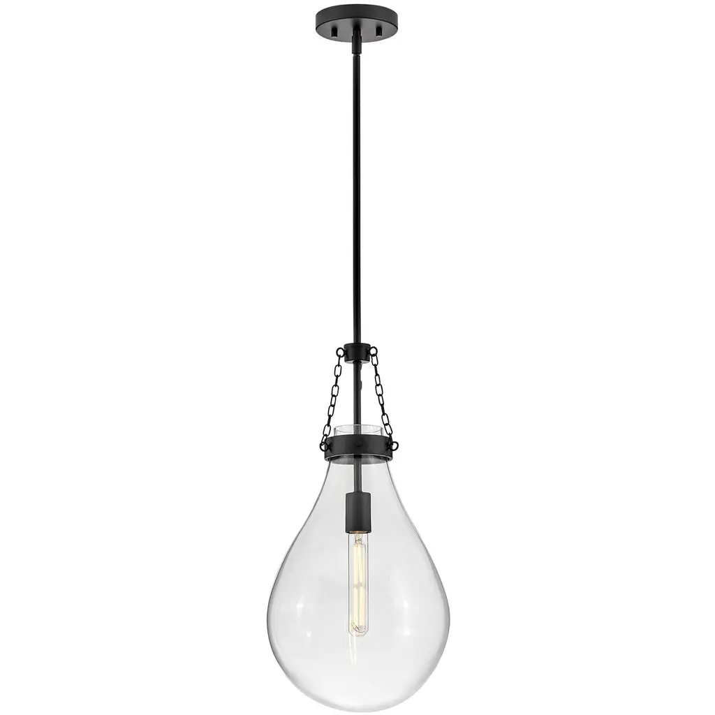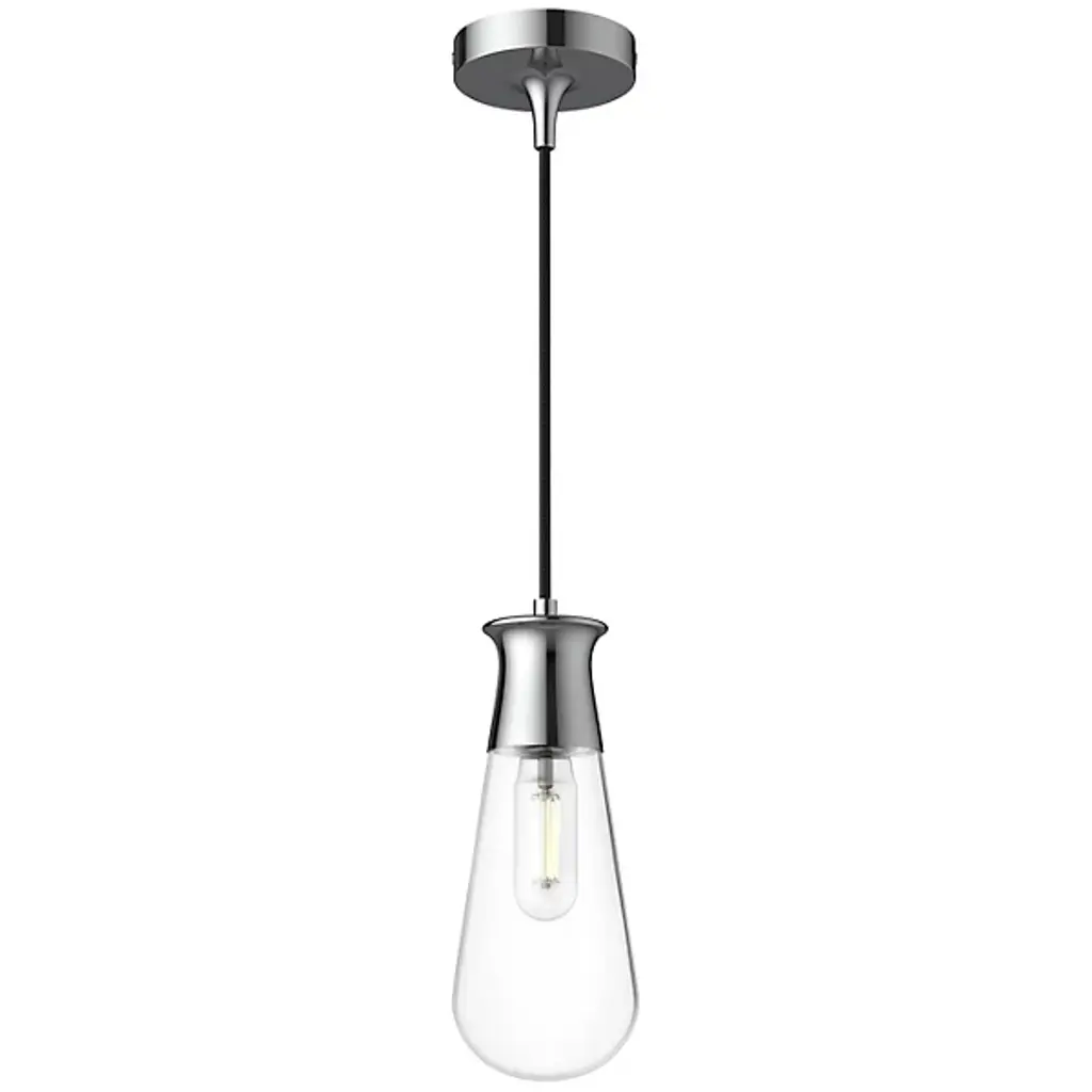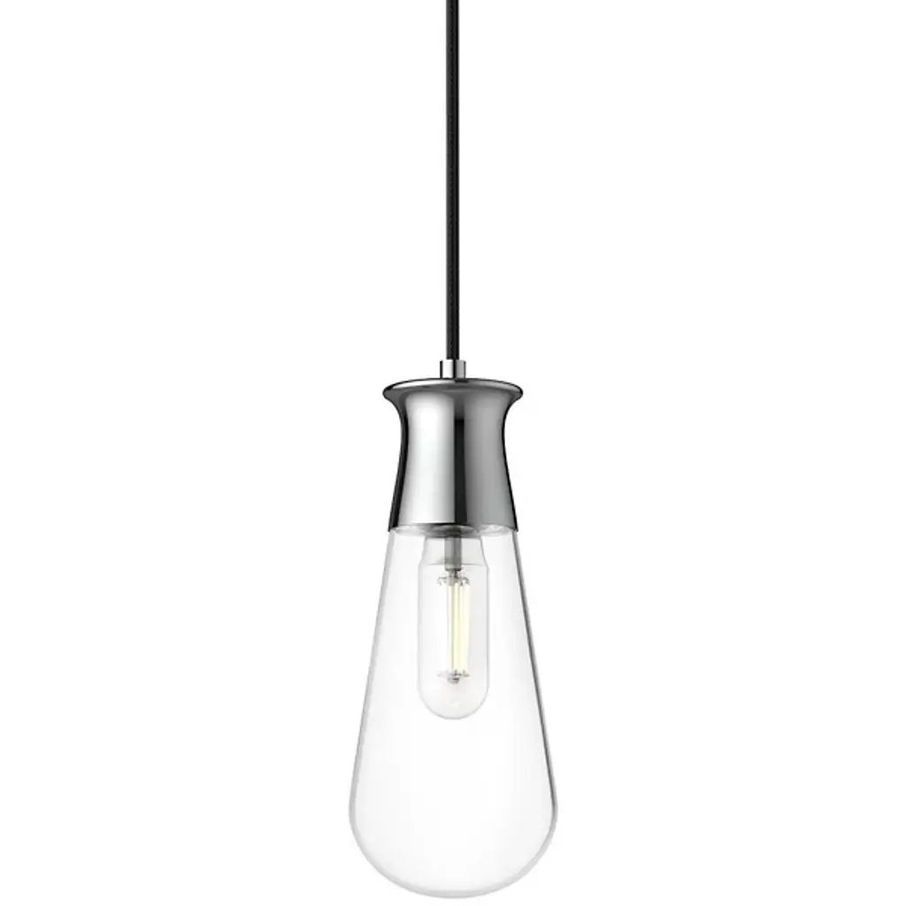 Add an inspired retro appeal to interiors with the swooping, sculptural simplicity of the Marcel Mini Pendant from Alora Mood. A circular canopy with a conical central accent extends a slim cord below, terminating in a flared steel socket housing that holds a single lamp beneath a curving teardrop shade of clear glass. The shade and housing coordinate well together in a unified form with contrasting materials, moderating direct glare into an even ambiance into a glittering ambiance around the fixture.