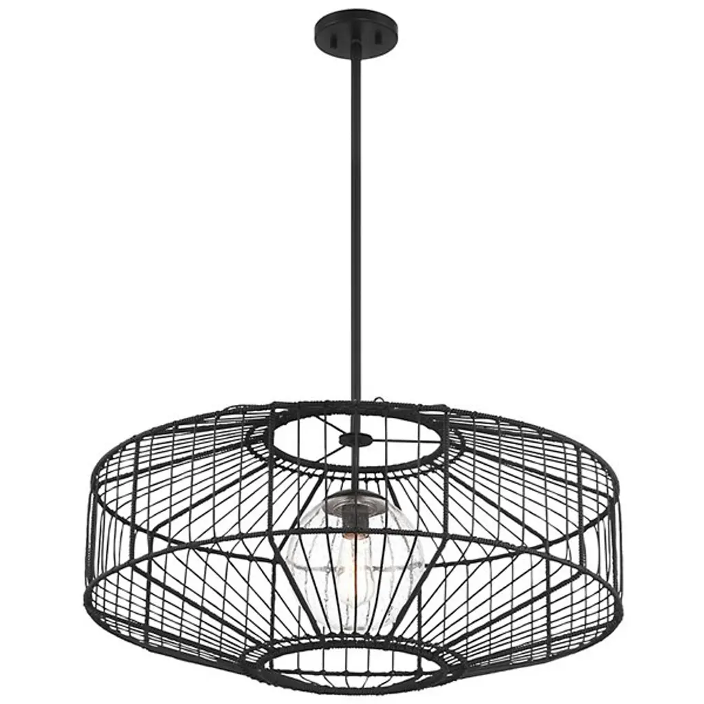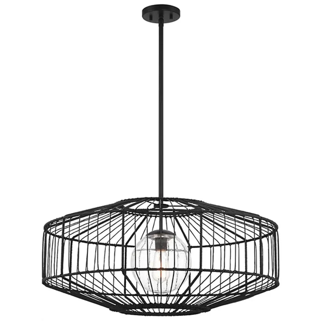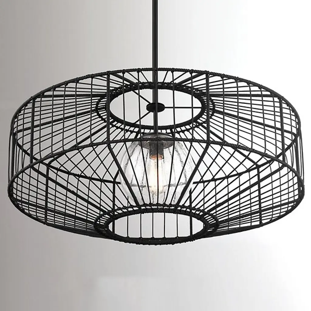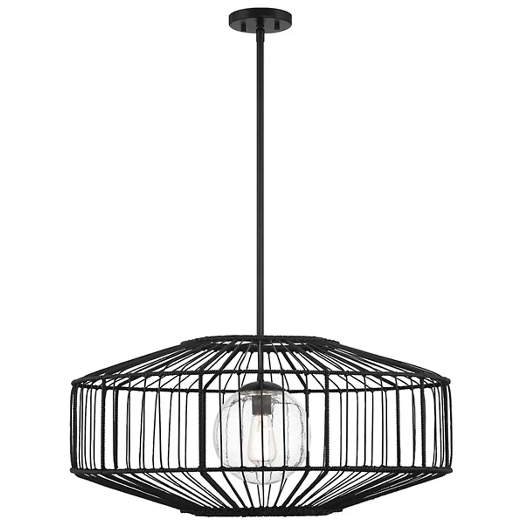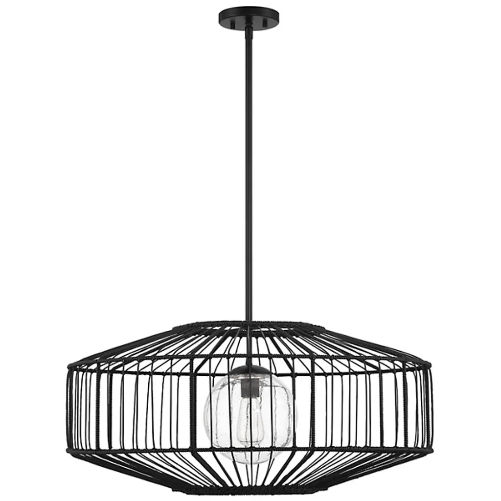 The Marcy Pendant from Savoy House brings the organic appeal of rattan to outdoor lighting design. This fixture features a basket-like shade crafted from black rattan resin, encasing an orb of clear seeded glass. The combination of these elements creates a visually striking contrast between the textured exterior and the transparent, subtly textured interior. Designed for exterior use, the pendant offers durability without sacrificing style. The Marcy Pendant's unique blend of materials results in a tactile, eye-catching fixture that adds natural warmth and texture to outdoor spaces.