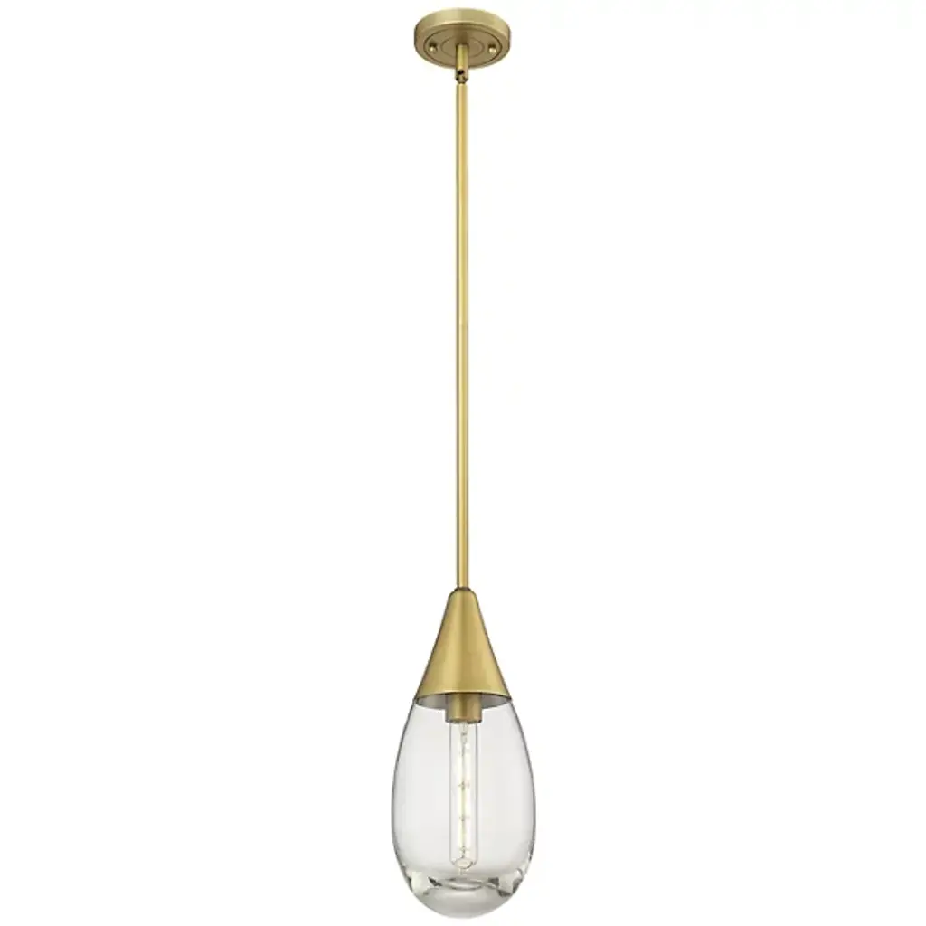 A sparklingly fluid look for modern spaces. With the Maren Mini Pendant by Alder & Ore, the individual forms of its frame and its shade come together to create a seamless teardrop. The metal shade holder has a funnel shape that transitions perfectly into the smooth, elongated curves of the thick glass shade. Use this stem-hung pendant to add a watery, modern design element as well as warm ambient light to a kitchen, dining room or bathroom.