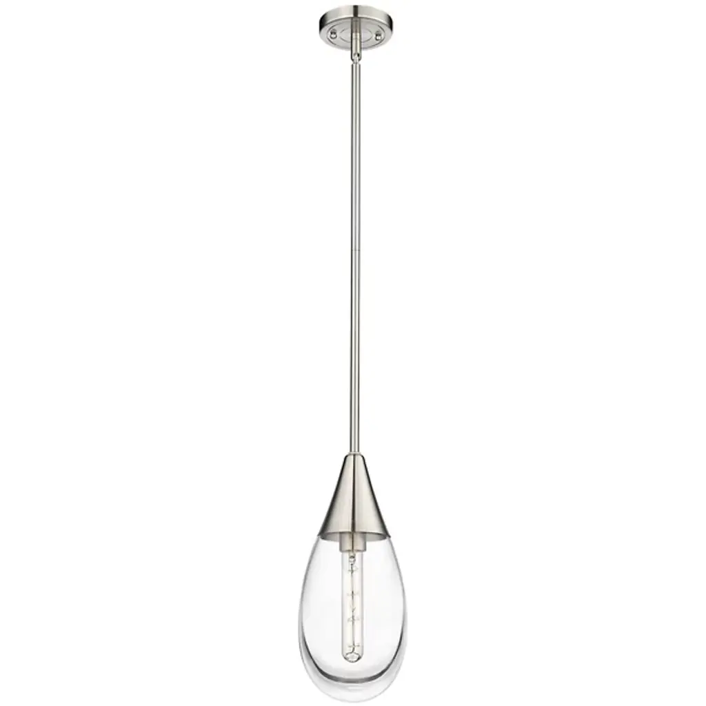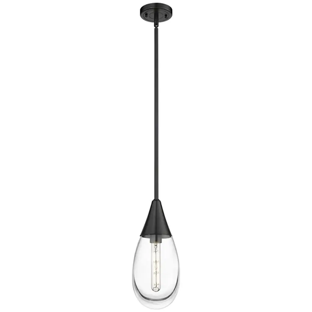 A sparklingly fluid look for modern spaces. With the Maren Mini Pendant by Alder & Ore, the individual forms of its frame and its shade come together to create a seamless teardrop. The metal shade holder has a funnel shape that transitions perfectly into the smooth, elongated curves of the thick glass shade. Use this stem-hung pendant to add a watery, modern design element as well as warm ambient light to a kitchen, dining room or bathroom.