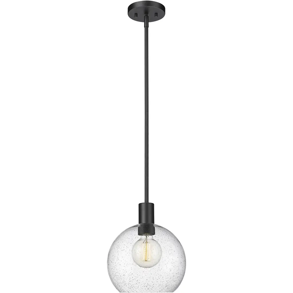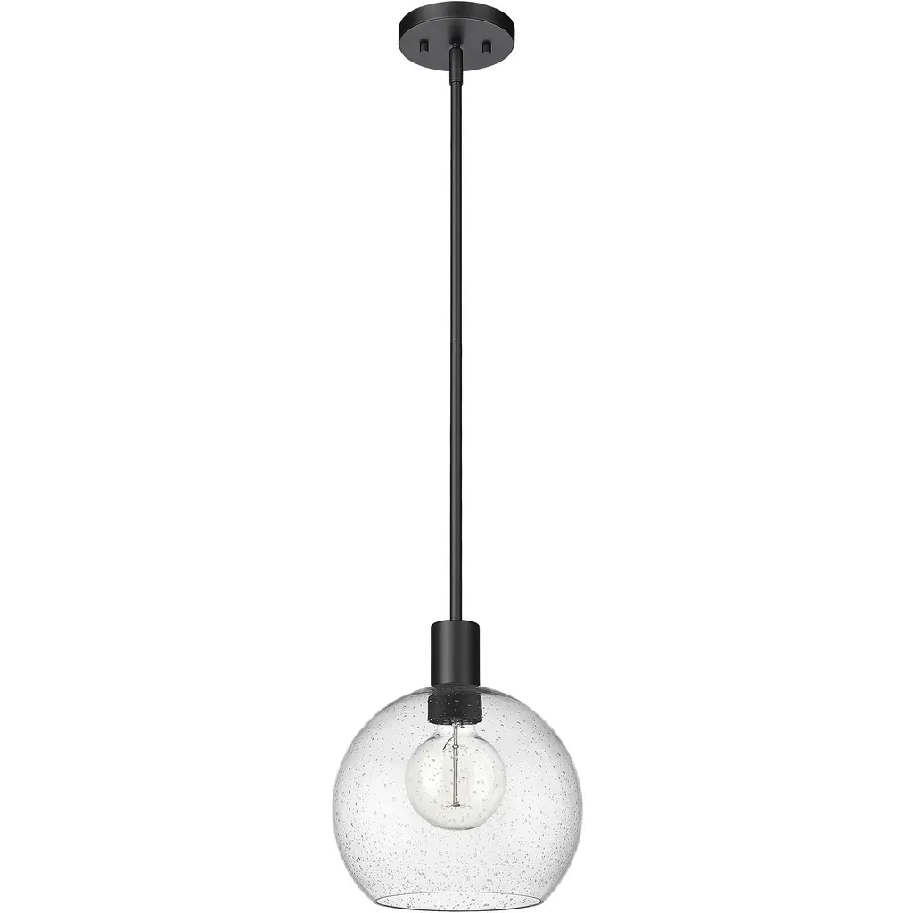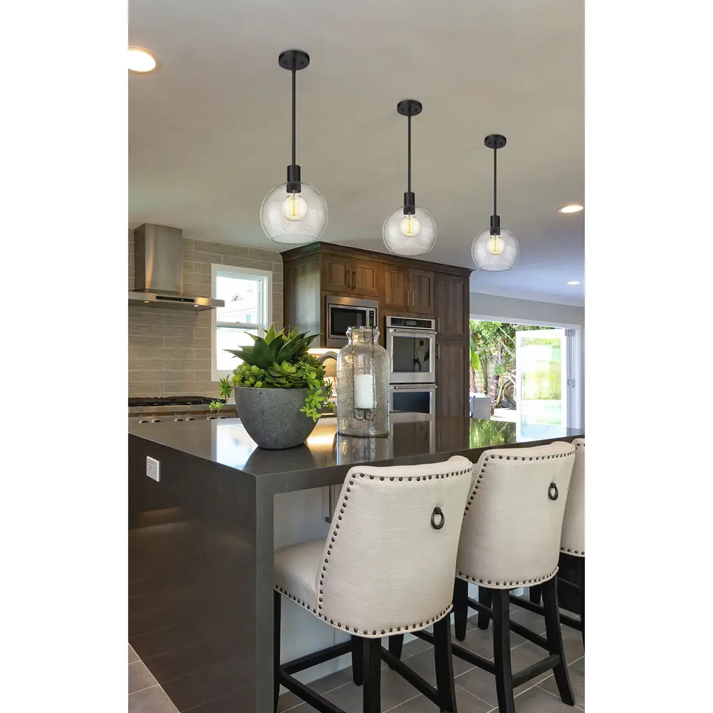 A handmade-inspired artisan quality presents itself in the clear seedy glass globe of this Mid-Century Modern light pendant. Creating a gorgeous illumination across spacious kitchen islands and gathering spaces, this welcoming, classically designed single light pendant also offers a luxe metallic touch with its dramatic matte black steel suspension rod and round disc-shaped plate mount. The orb-like globe, with its Arts and Crafts era seedy glass design, also gives off a subtle texture and scintillation across tablescapes.