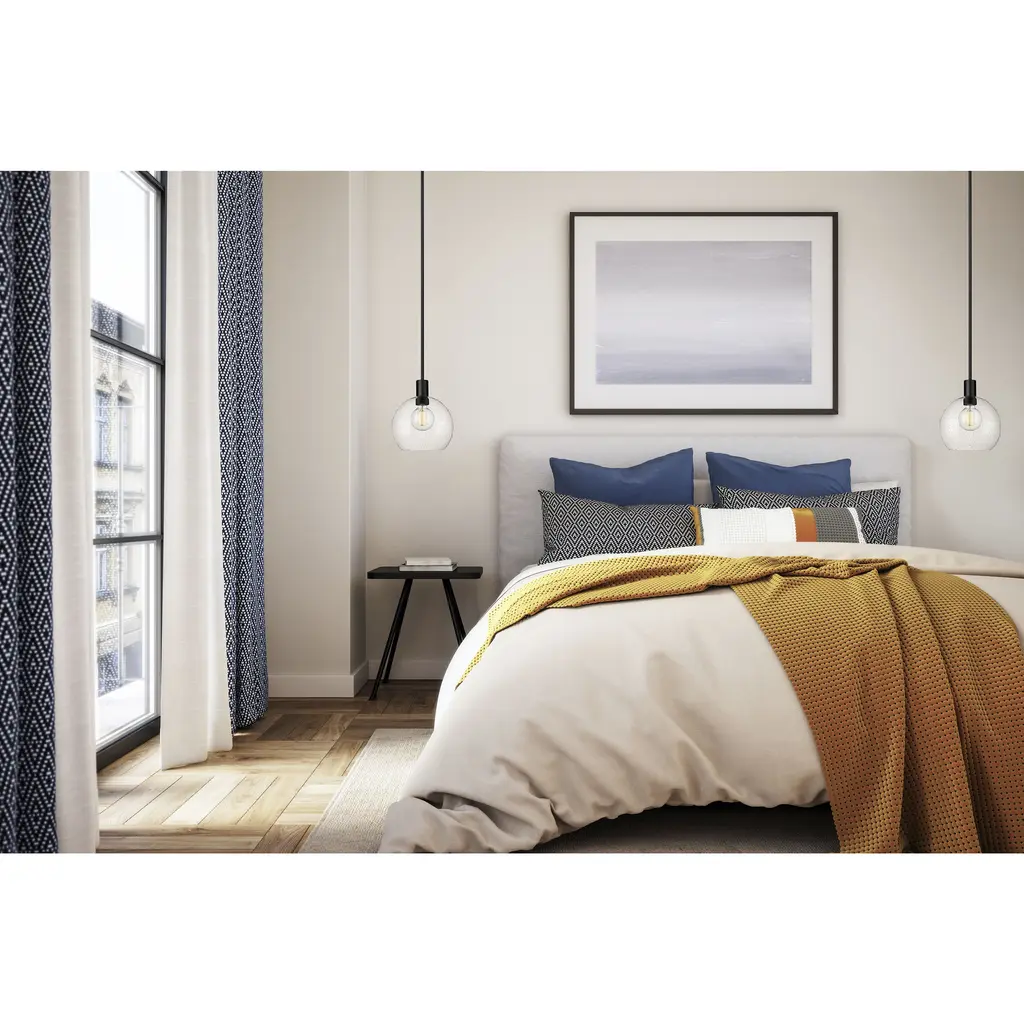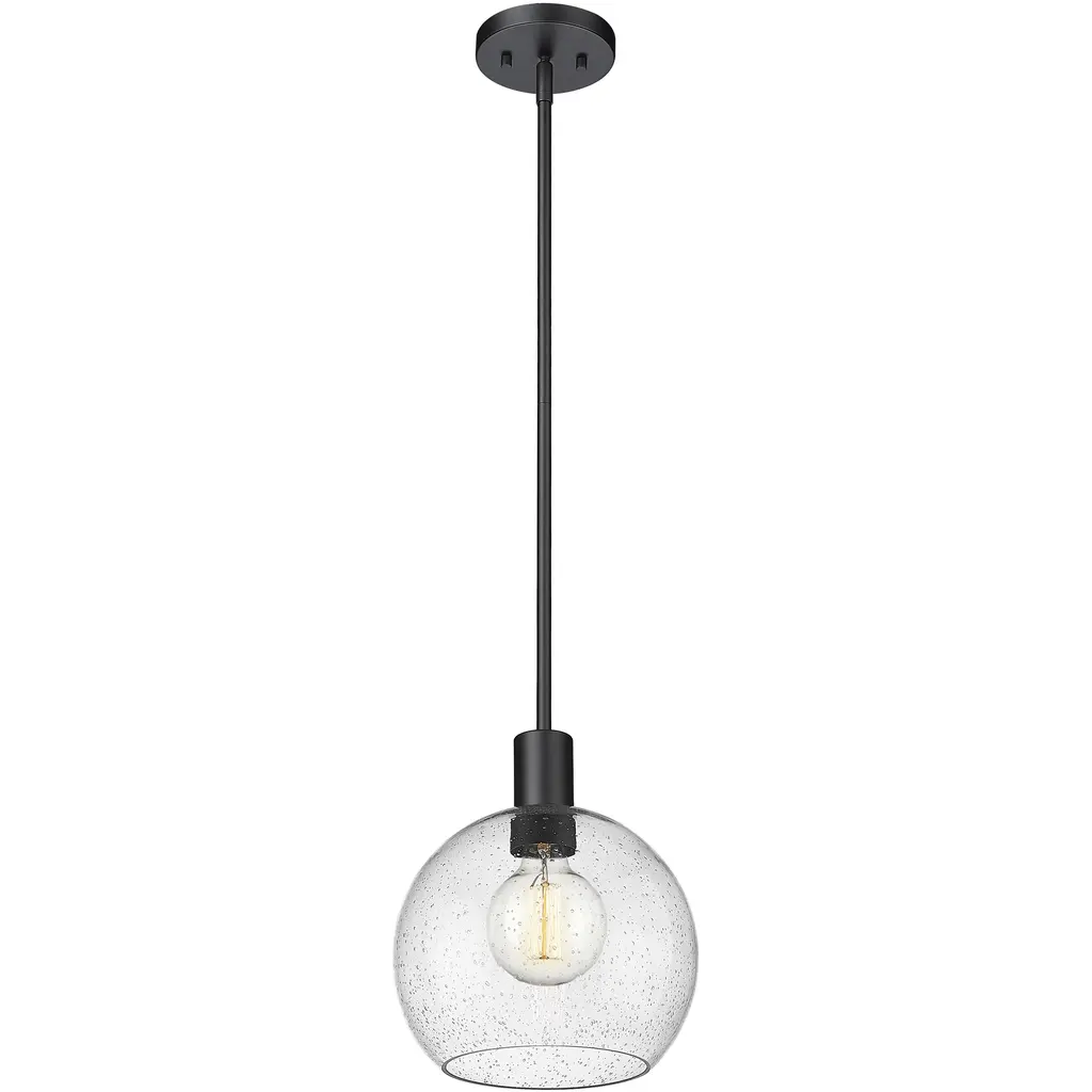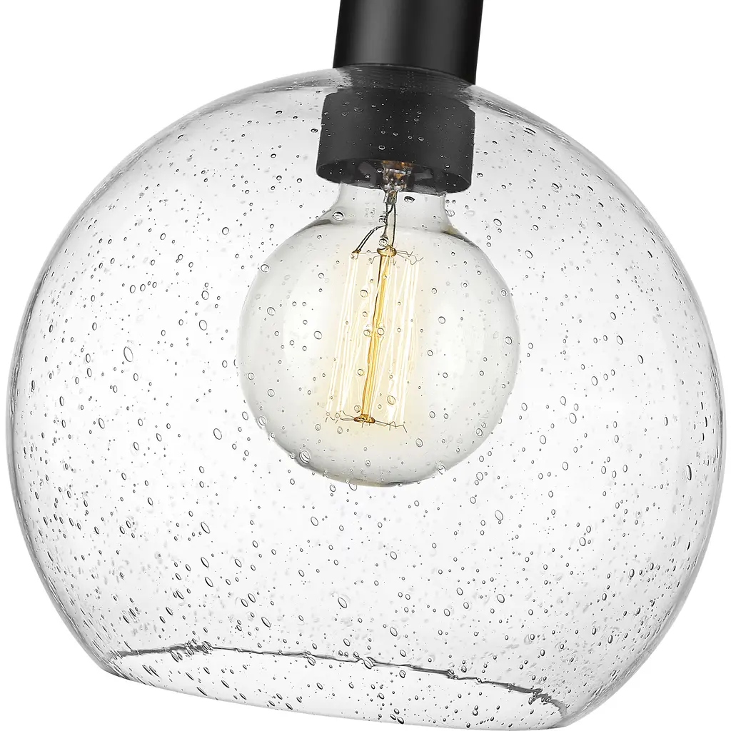 A handmade-inspired artisan quality presents itself in the clear seedy glass globe of this Mid-Century Modern light pendant. Creating a gorgeous illumination across spacious kitchen islands and gathering spaces, this welcoming, classically designed single light pendant also offers a luxe metallic touch with its dramatic matte black steel suspension rod and round disc-shaped plate mount. The orb-like globe, with its Arts and Crafts era seedy glass design, also gives off a subtle texture and scintillation across tablescapes.
