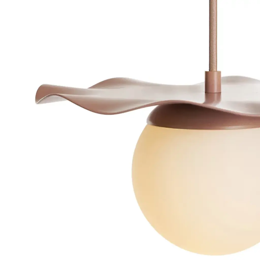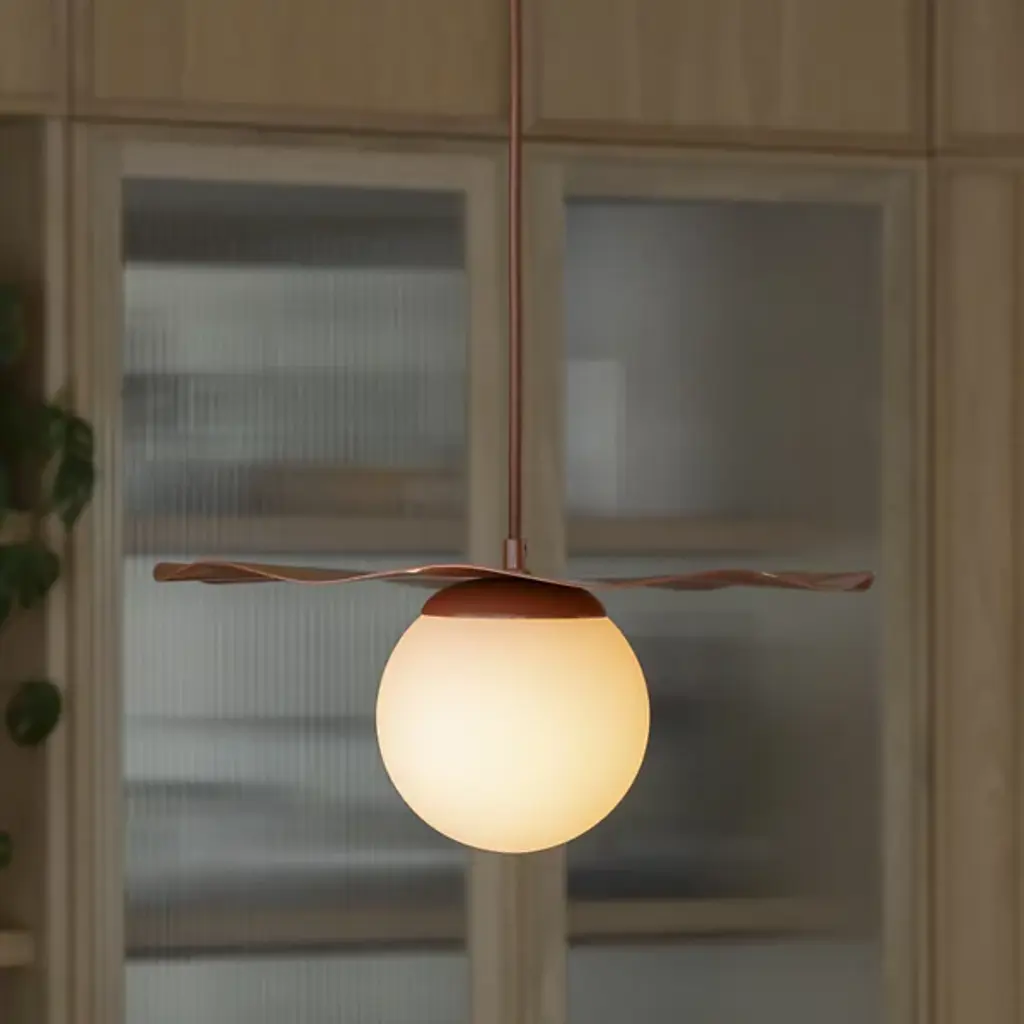 Add subtle mid-century modern charm to your interiors with the Marguerite Pendant from Luminaire Authentik. A metal elements suspended from a low-profile canopy, the design threads a slim stem through a ruffled, floral disc, supporting a strong light source inside a glass sphere shade. The shade and metalwork contrast artistically, while the glass diffuser’s translucent texture moderates direct light, transforming it into an even glow that reflects down around the fixture.