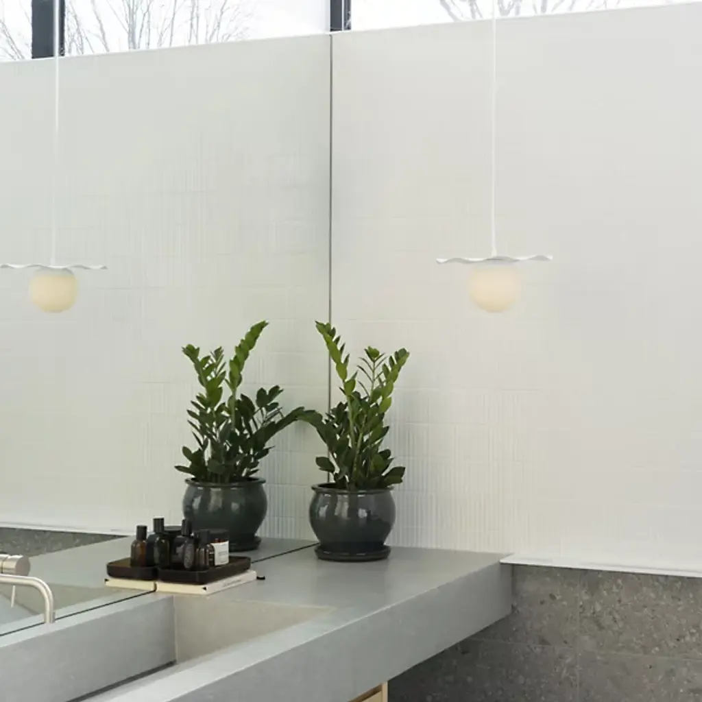 Add subtle mid-century modern charm to your interiors with the Marguerite Pendant from Luminaire Authentik. A metal elements suspended from a low-profile canopy, the design threads a slim stem through a ruffled, floral disc, supporting a strong light source inside a glass sphere shade. The shade and metalwork contrast artistically, while the glass diffuser’s translucent texture moderates direct light, transforming it into an even glow that reflects down around the fixture.