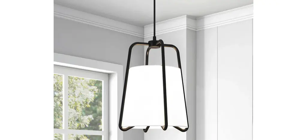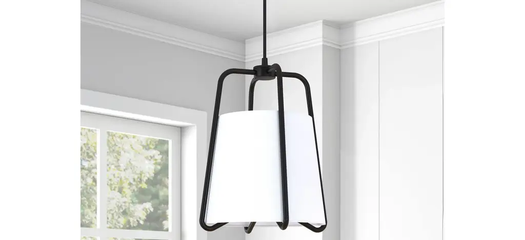 White fabric shade with 1 light. The shade's warm glow contrasts with the stark simplicity of its outer metal frame. This contemporary fixture, with an adjustable height, would complement the modern design of your living room, dining room, bedroom or foyer. The brass frame perfectly encases the white linen shade. It is paired with a elongated French Drum shade.