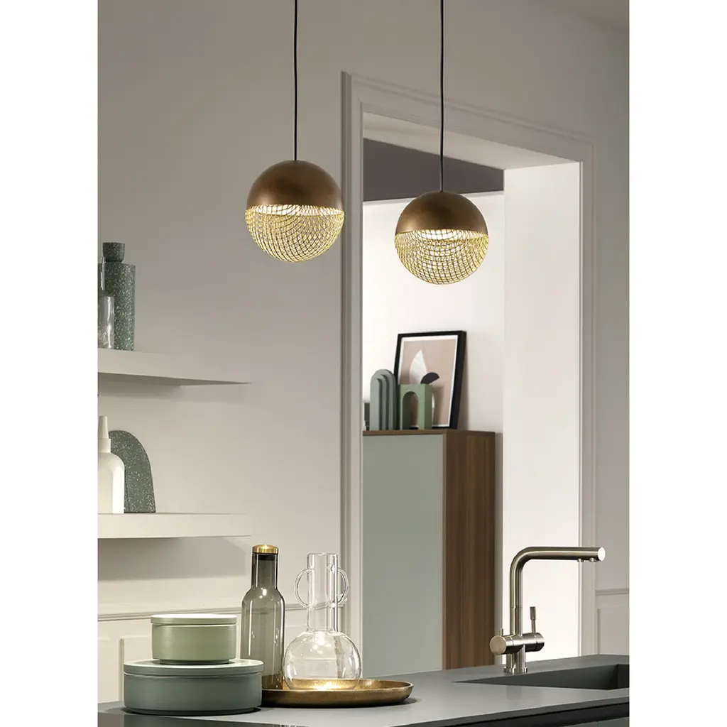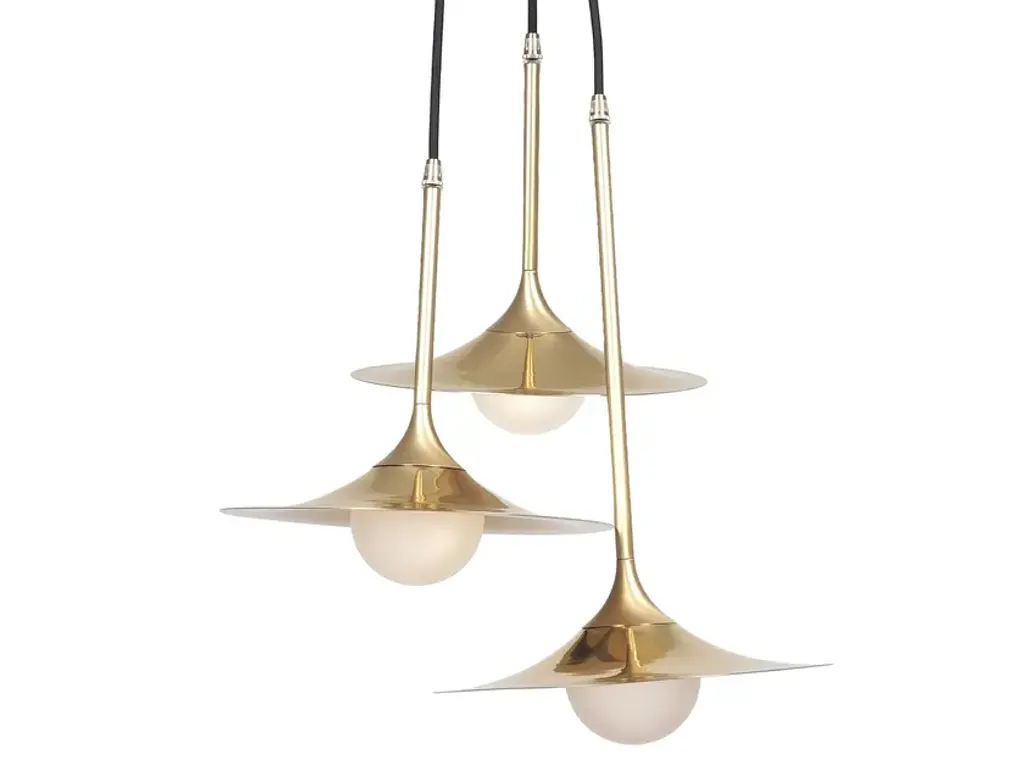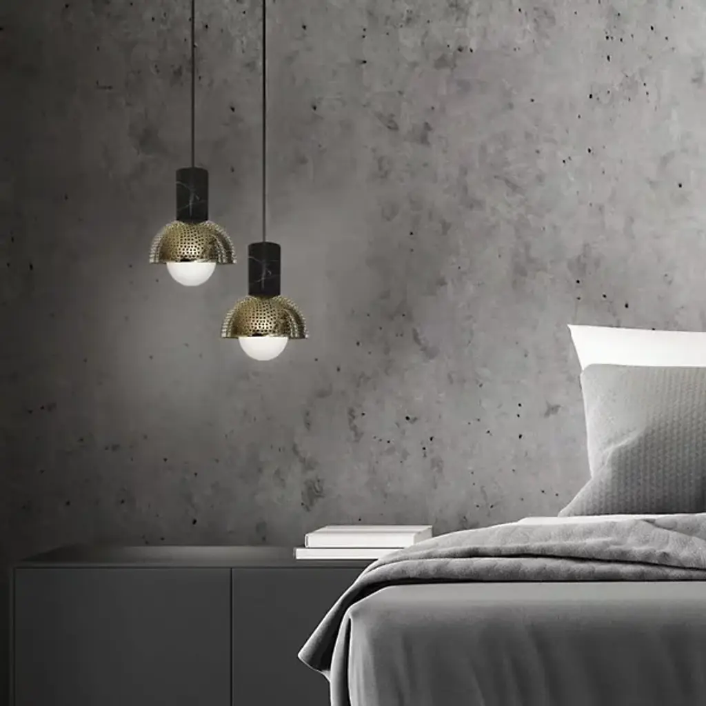 The Maria Multi-Light Pendant from Dounia Home adds natural character and handcrafted intricacy to inside ceilings. A handmade design made in Morocco, its circle canopy suspends cylinder housings of black marble, securing damp-listed lamping inside hemisphere shades of sustainably sourced metal. Each shade is made by hand and features unique perforations across its surface, showing off translucent glass bowl shades below while casting unique patterns of light and shadow to the sides.
