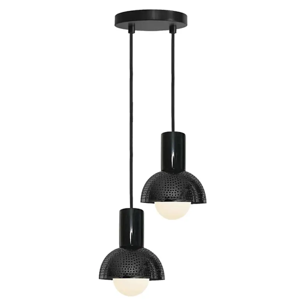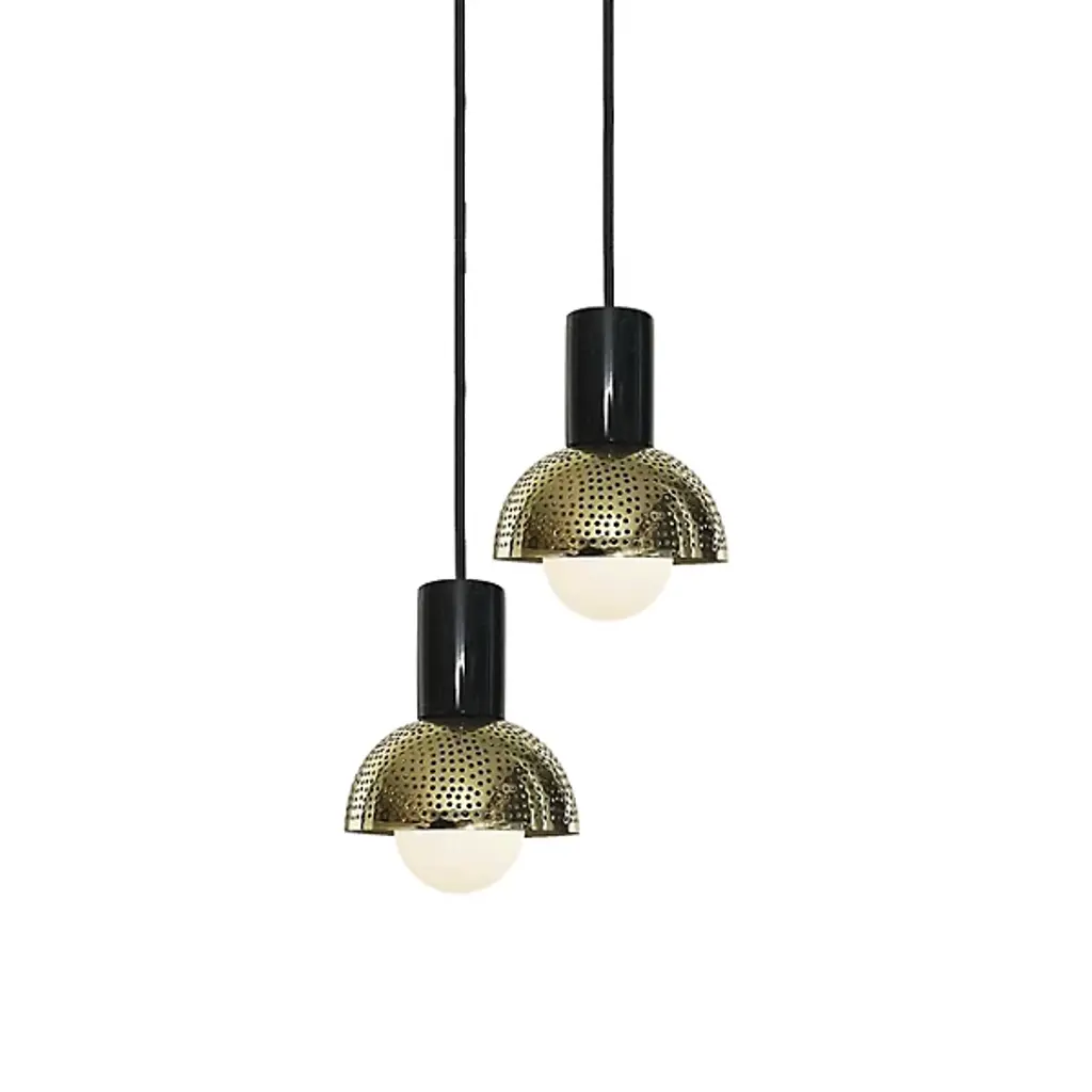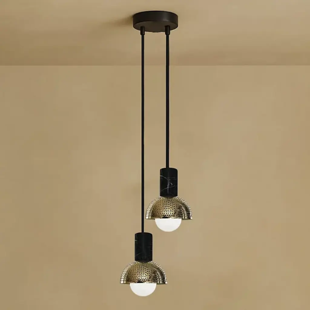 The Maria Multi-Light Pendant from Dounia Home adds natural character and handcrafted intricacy to inside ceilings. A handmade design made in Morocco, its circle canopy suspends cylinder housings of black marble, securing damp-listed lamping inside hemisphere shades of sustainably sourced metal. Each shade is made by hand and features unique perforations across its surface, showing off translucent glass bowl shades below while casting unique patterns of light and shadow to the sides.
