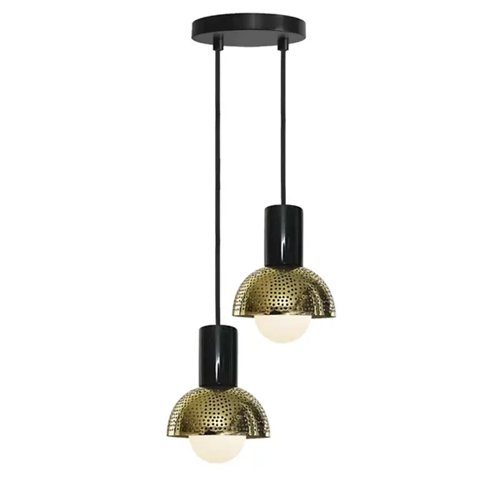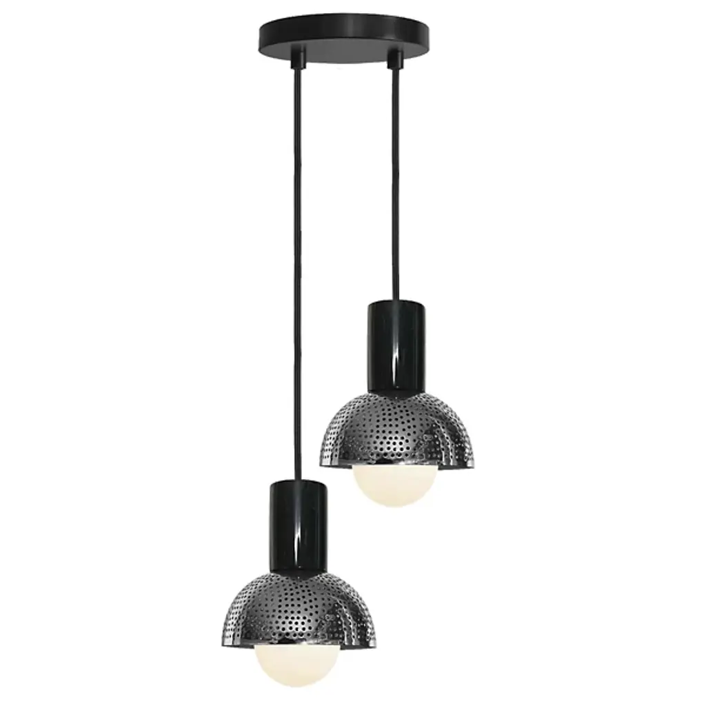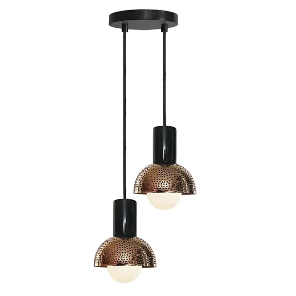 The Maria Multi-Light Pendant from Dounia Home adds natural character and handcrafted intricacy to inside ceilings. A handmade design made in Morocco, its circle canopy suspends cylinder housings of black marble, securing damp-listed lamping inside hemisphere shades of sustainably sourced metal. Each shade is made by hand and features unique perforations across its surface, showing off translucent glass bowl shades below while casting unique patterns of light and shadow to the sides.