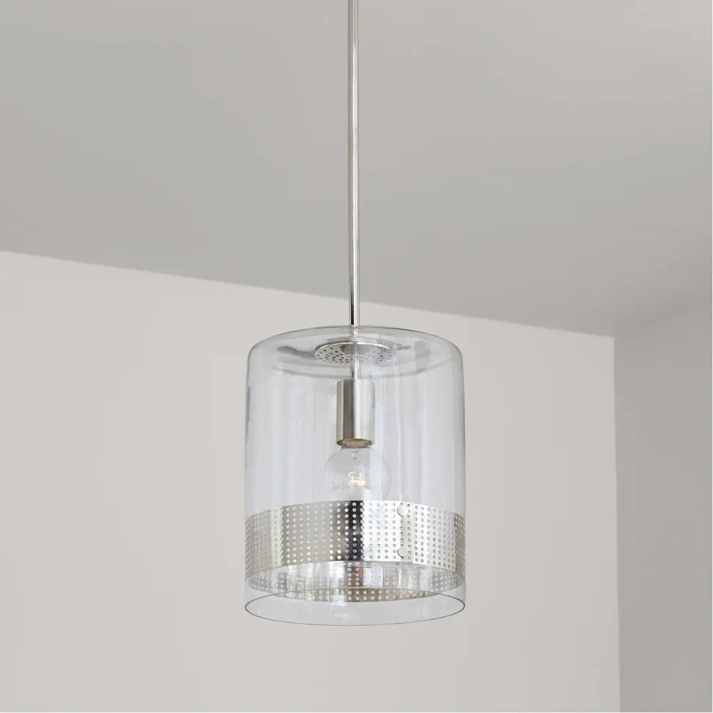 Metal and glass come together in this versatile pendant light featuring a perforated band in Polished Nickel accentuated by decorative rivets. Try a trio over the island, a pair flanking the bed or add pop to an overlooked space such as the laundry room or closet with a single pendant.