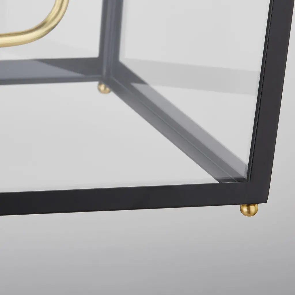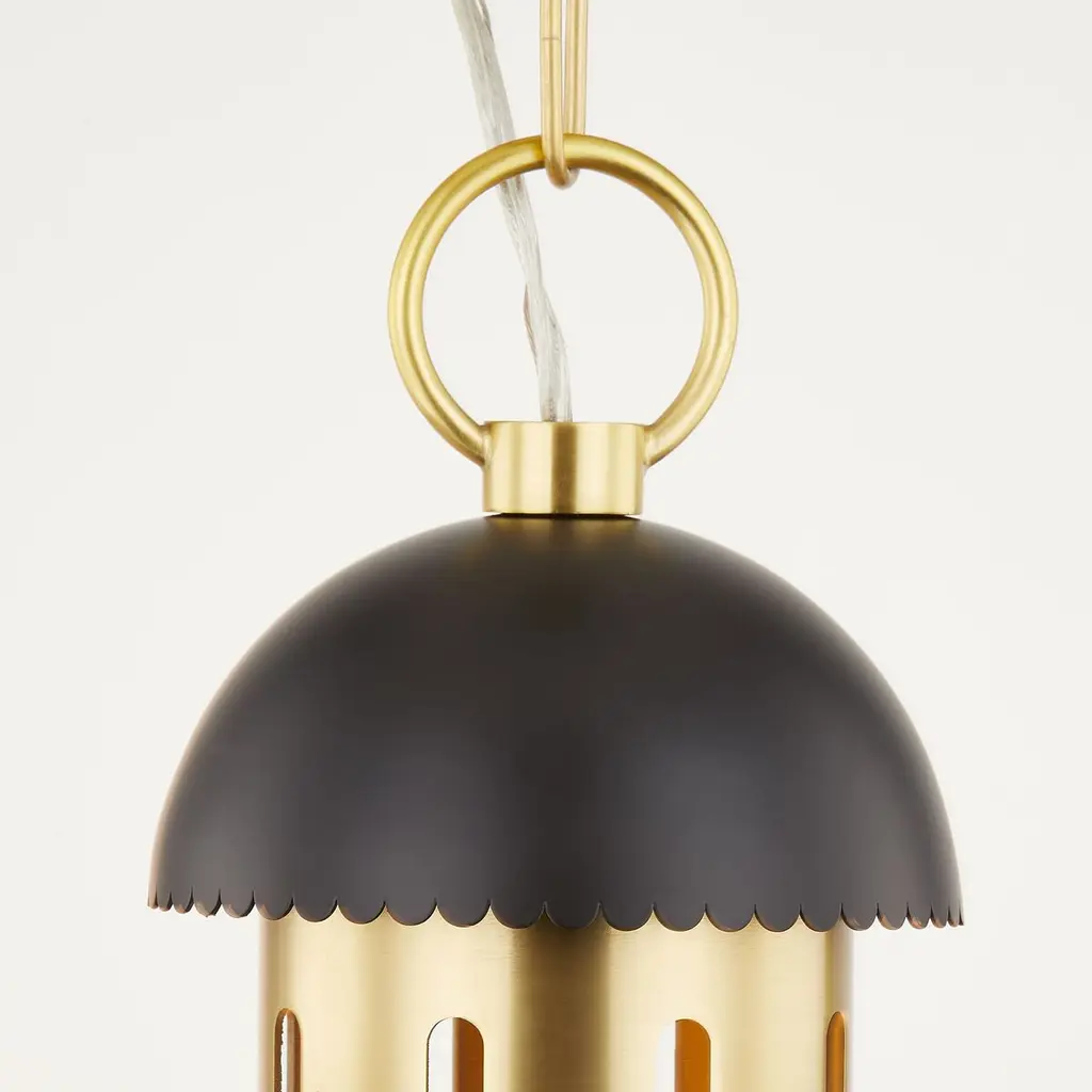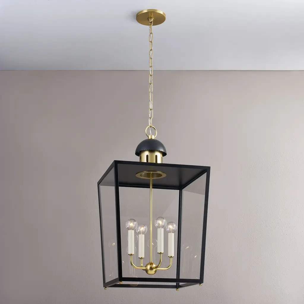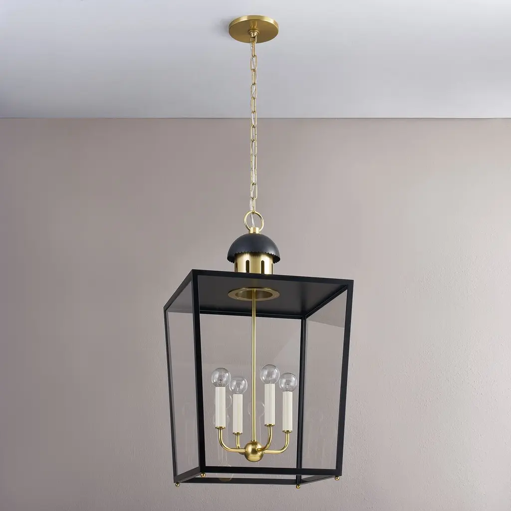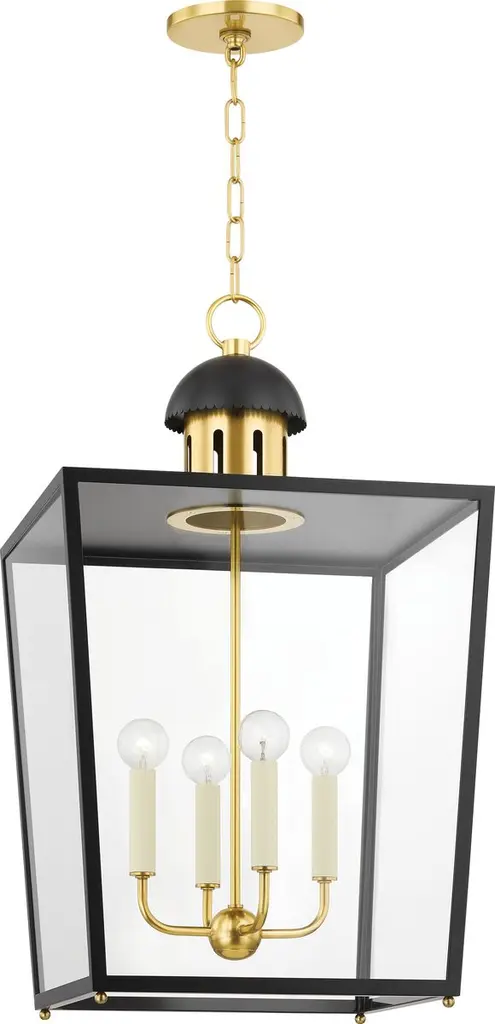 Contrasting finishes and a petite scalloped dome just below the chain are among the elements that set this four-bulb lantern apart from more-traditional versions.