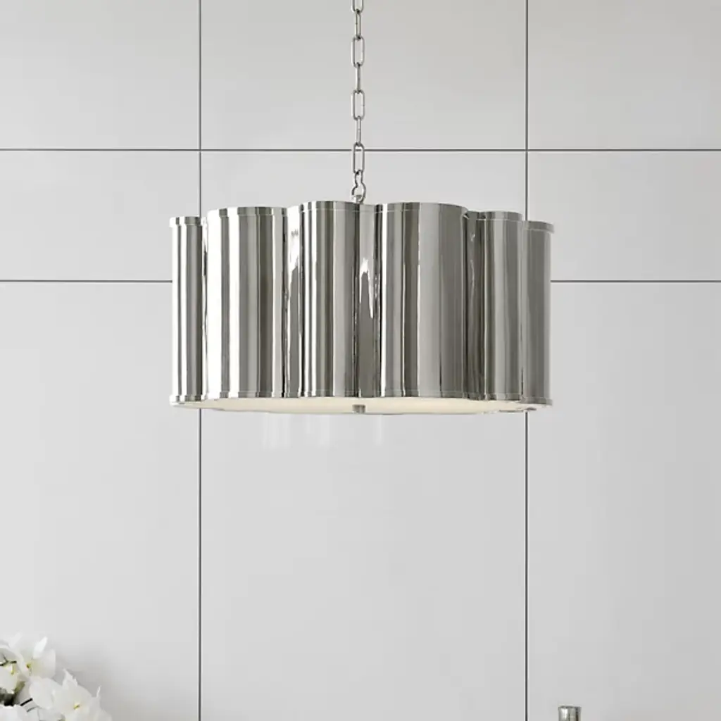 The Markos Pendant by Visual Comfort Signature, formerly known as Visual Comfort, features and industrial refabricated look that does not pull any punches with style. The clean curves of the shade fold onto each other at varying lengths, resulting in soft lines created by its shadows, held up by an elegant chain link. This offers a glowing downlight that provides spaces a focus. Over counters, in a bedroom, or an inviting entrance area, this light provides a welcoming warmth.