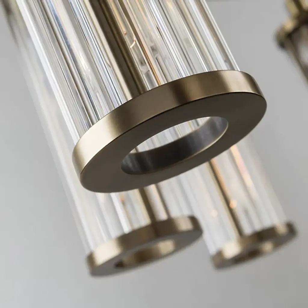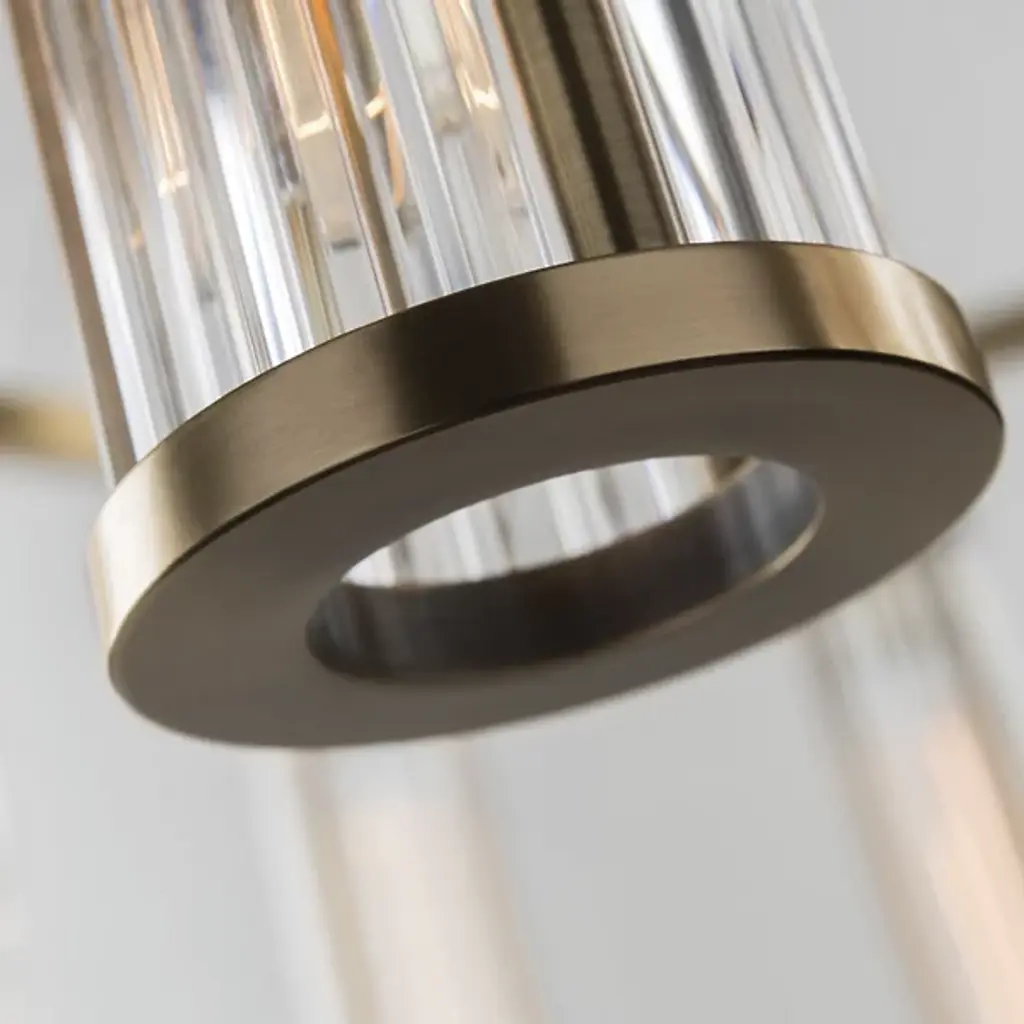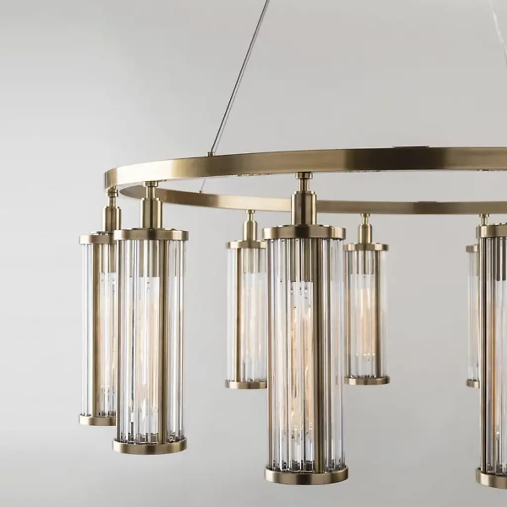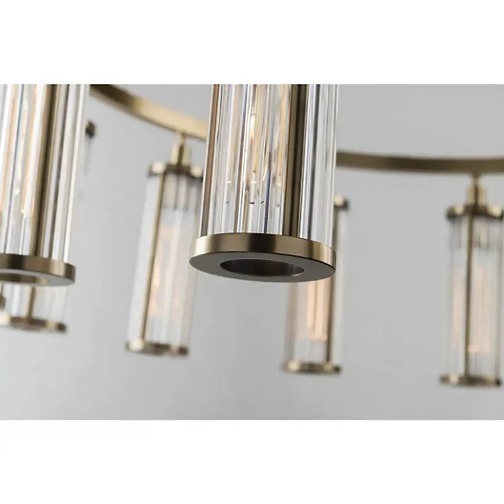 A revamp of the hanging lantern with a '70's twist, the Marley Pendant by Hudson Valley Lighting commands attention in a grand foyer, dining room or modern living room. Lofted by a simple canopy and 4 wires, the design showcases a large circular Brass frame with open-based cylinders wrapped in Clear Glass rod shades. Inside each shade a T10 bulb radiates light through the rods and downwards for a unique lighting display.