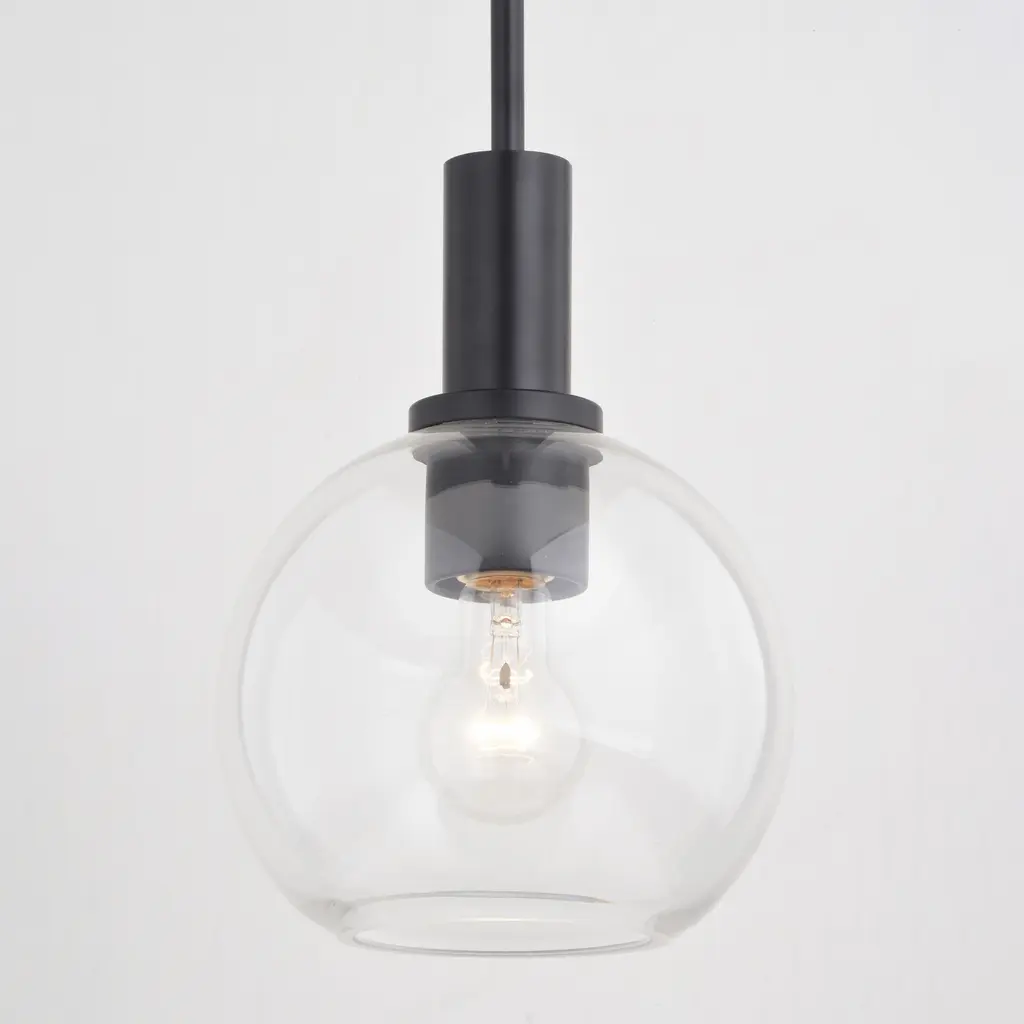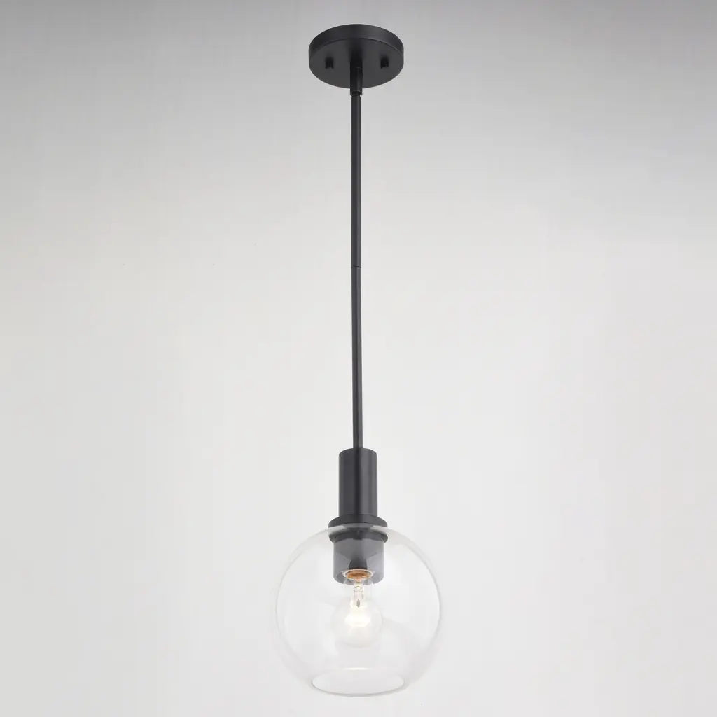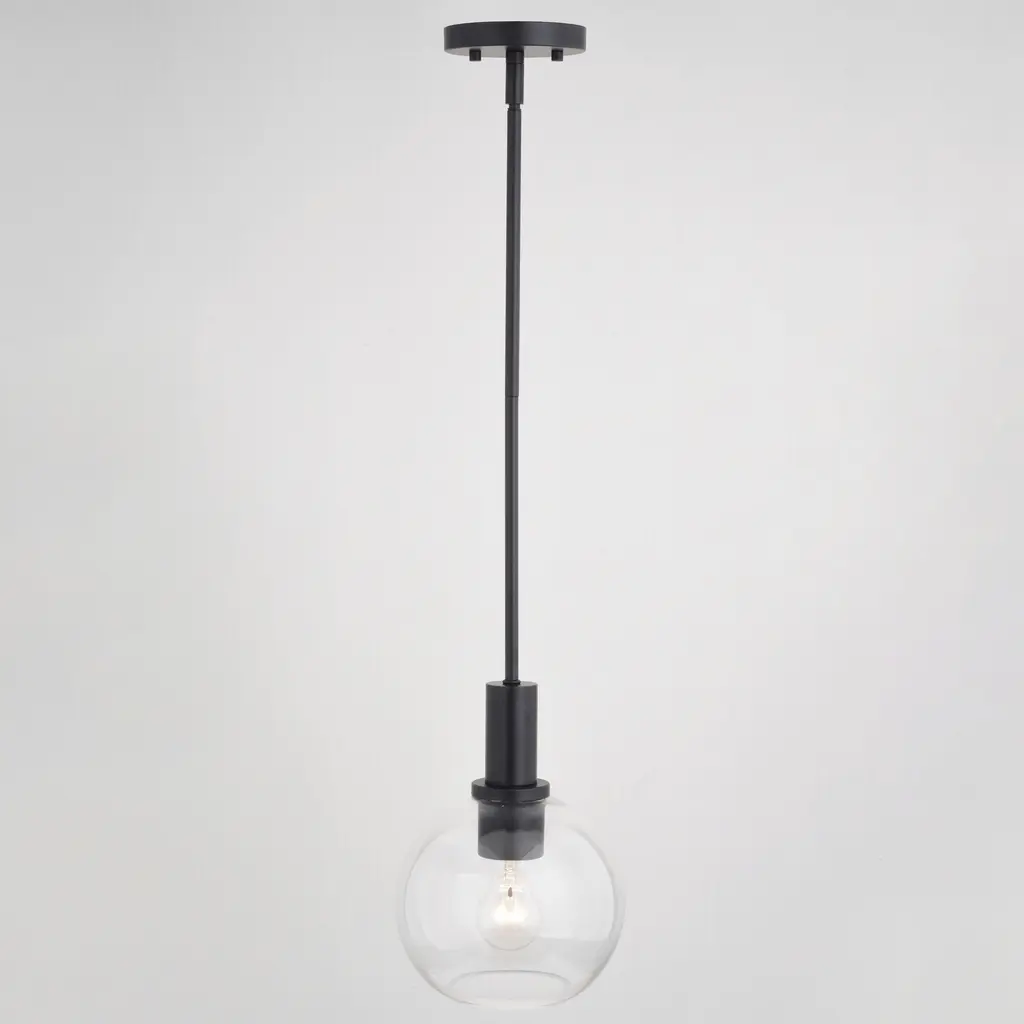 The Marshall collection is transitional style with a contemporary flair at a competitive price. A stately central column finished in matte black supports a clear glass globe for the perfect balance of dark versus light. Height is adjustable with the included down rods compatible with sloped ceilings. Install this mini pendant individually or in a group ideal for kitchens, dining areas, or bar areas.