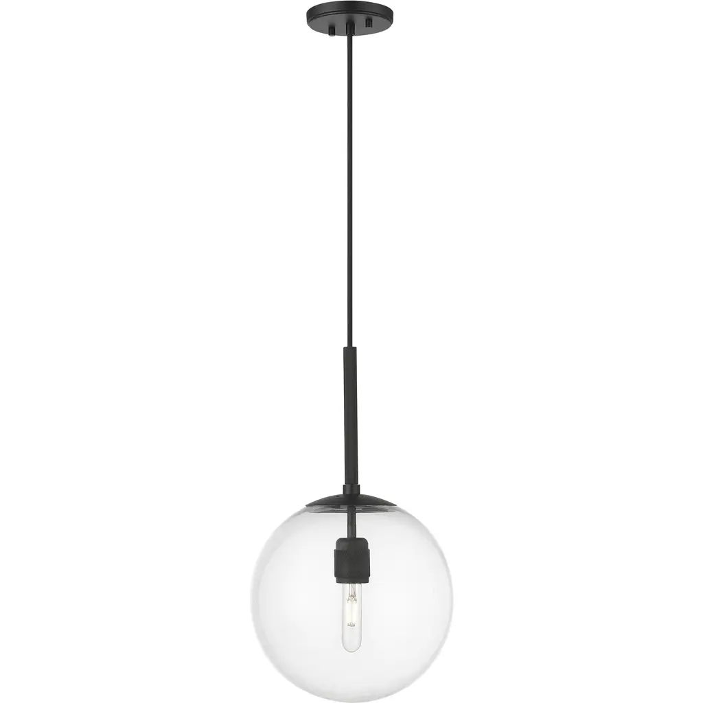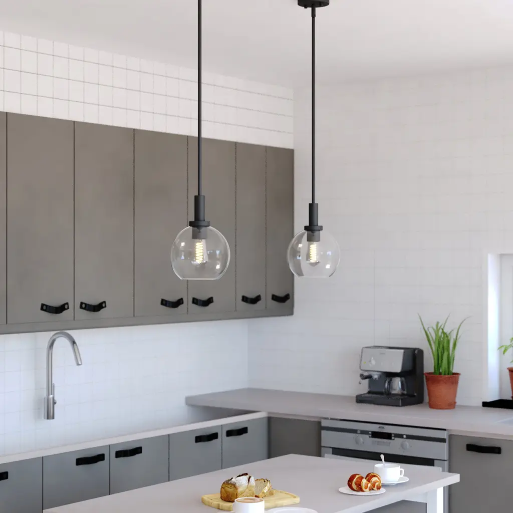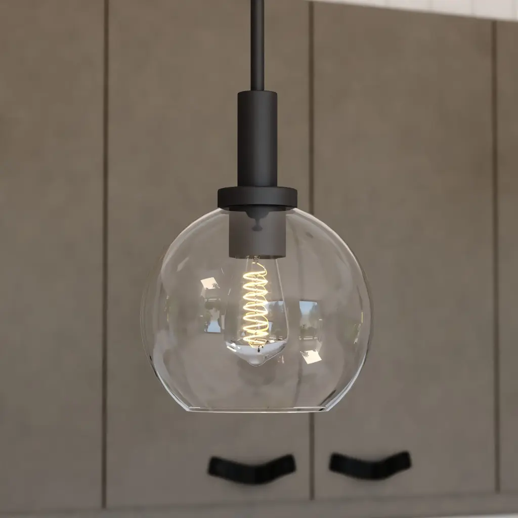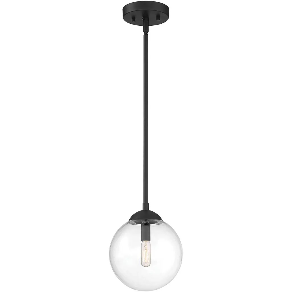 The Marshall collection is transitional style with a contemporary flair at a competitive price. A stately central column finished in matte black supports a clear glass globe for the perfect balance of dark versus light. Height is adjustable with the included down rods compatible with sloped ceilings. Install this mini pendant individually or in a group ideal for kitchens, dining areas, or bar areas.