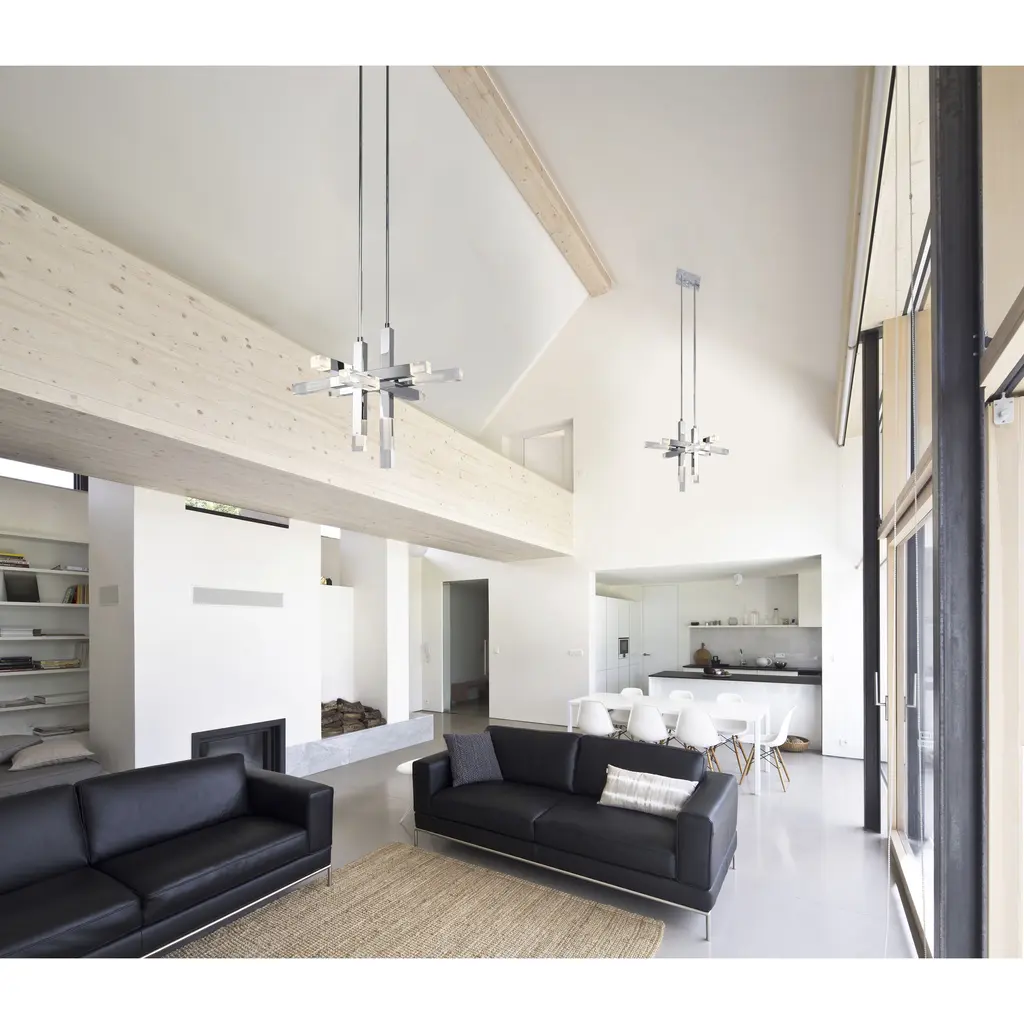 Hanging from 2 polished silver rods, this pendant uses man-made and natural elements to exude a dramatic vibe six polished chrome bars capped with quartz-like acrylic ends are stacked perpendicularly. Clean angles and edges are highlighted by the light emitted from each end of the silver bars.