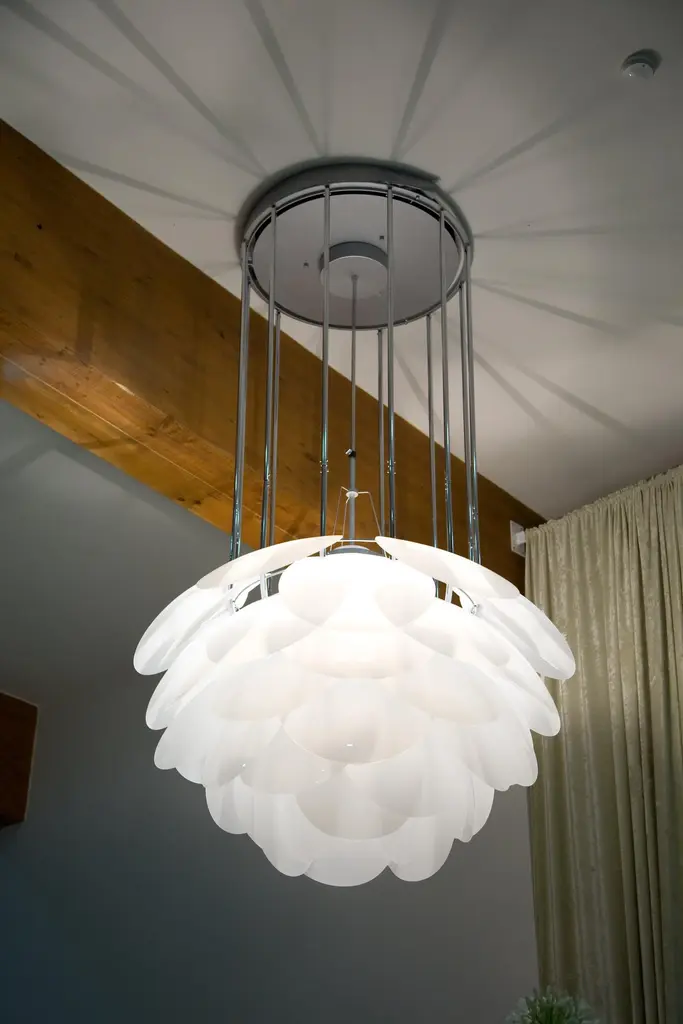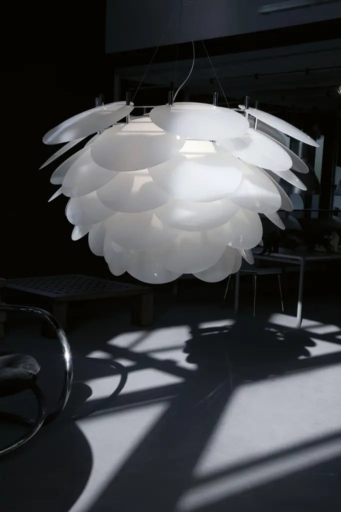 Nuvole Vagabonde pendant light by Elio Martinelli. Suspension lamp providing diffused light. Metal support for hanging, white opal methacrylate diffuser. The lamp is suspended with a chrome support. Complete with power supply in the ceiling box. Available in a larger size on request.Materials: Structure: Metal; Diffuser: Opal White Methacrylate Bulbs: LED: 1x14W E26; Class: A+; Device Specifications: Type of Emission: Diffused; Power Supply Cable: 350 cm; Voltage: 120 V.'