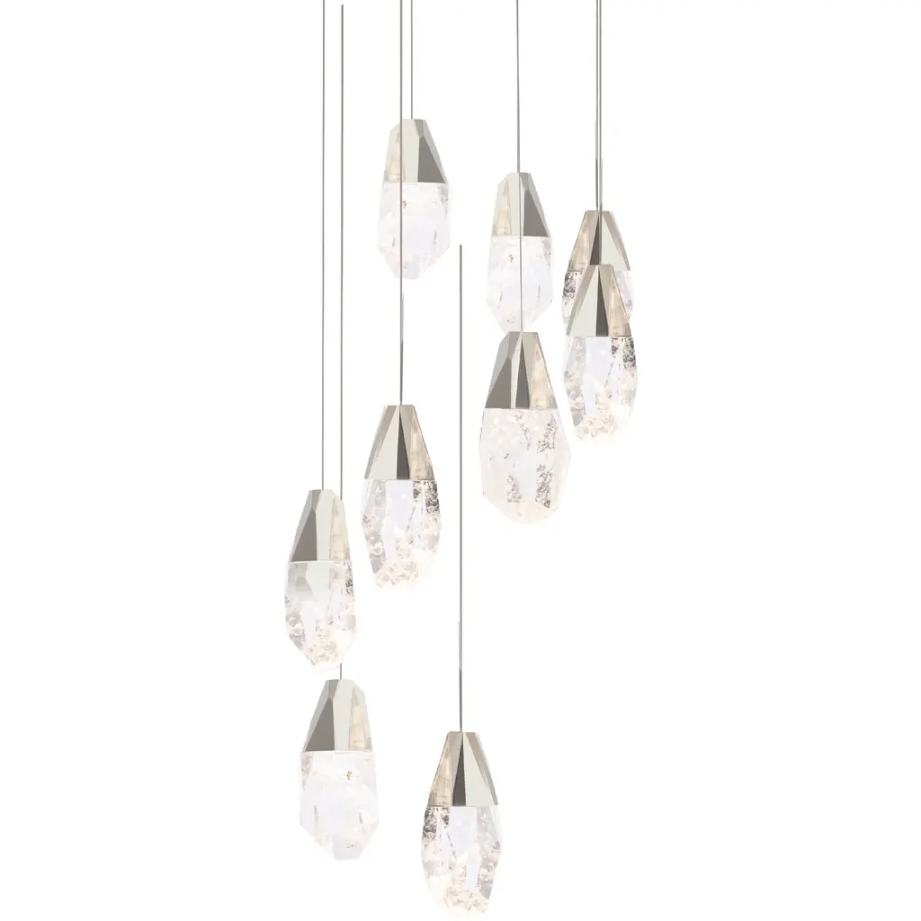 Suspended in mid-air, a jewel of Schonbek optic haze crystal illuminates like natural quartz to entice or available in a clear optic crystal optically pure face with no flaws or imperfections. The chiseled metal fitting is congruent with the faceted crystal to confer elegance in design continuity. Schonbek Beyond LED luminaires feature a 3-CCT color temperature selectable switch that can be accessed at the time of installation to toggle between 3000K-3500K-4000K color temperatures. Martini is offered in multi-light (3 Light, 5 Light, and 9 Light) or single light configurations. Ultra-sleek electrified cables eliminate the need for clunky power wires and the height is simple to adjust through push pin connectors on the canopy up to 10ft of length.