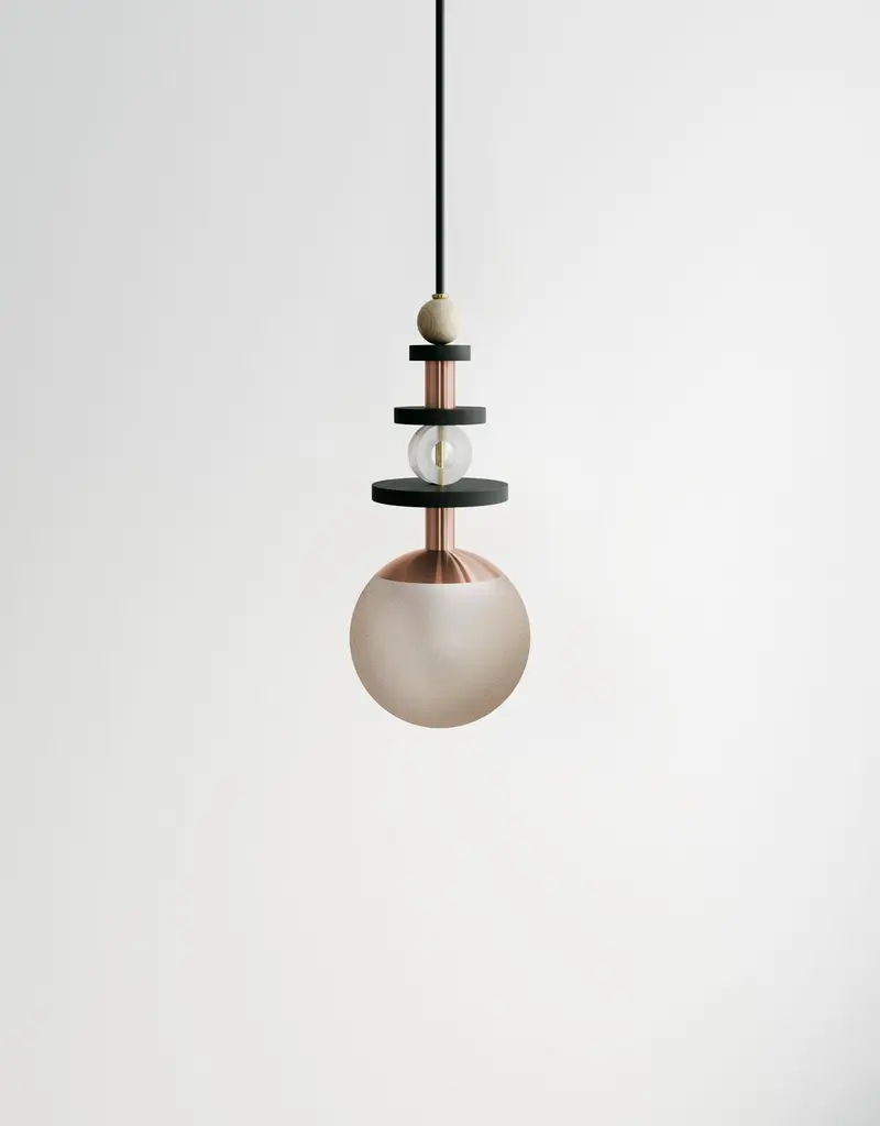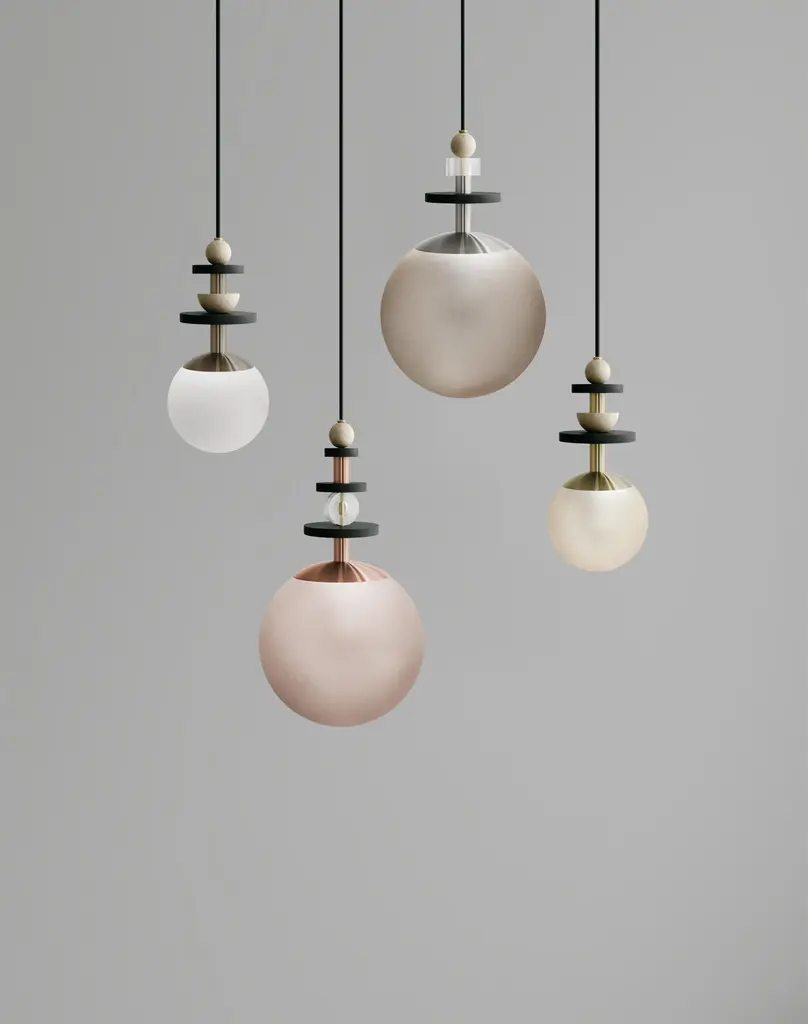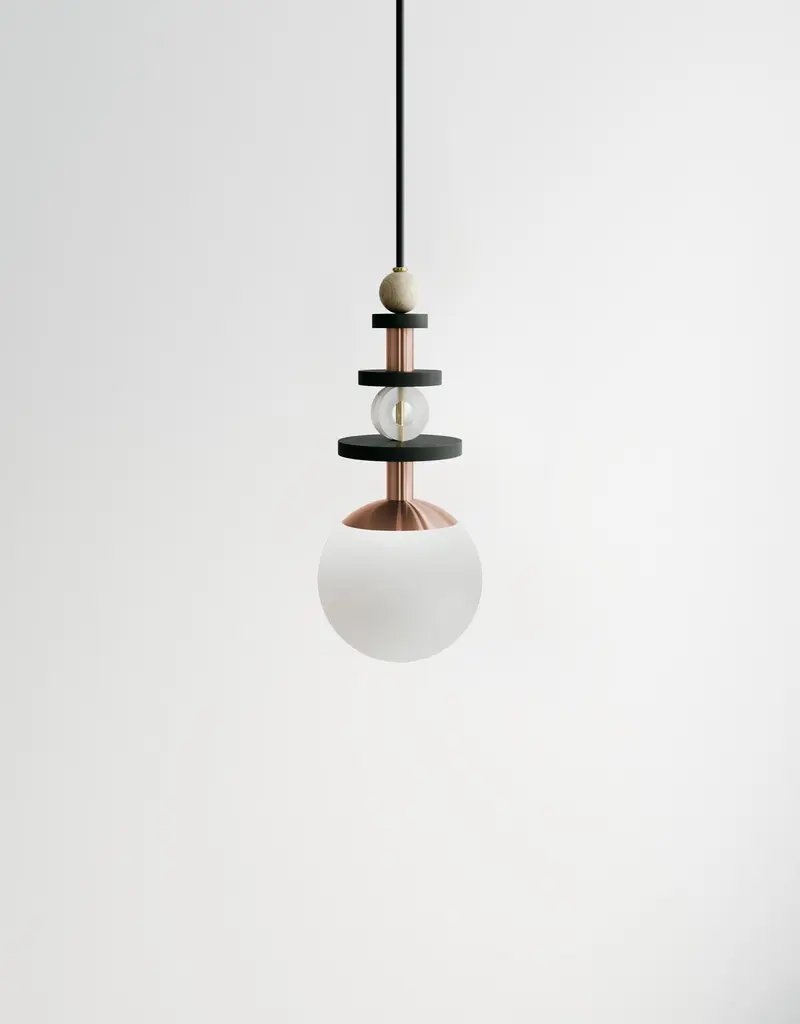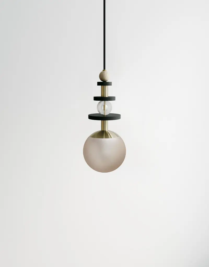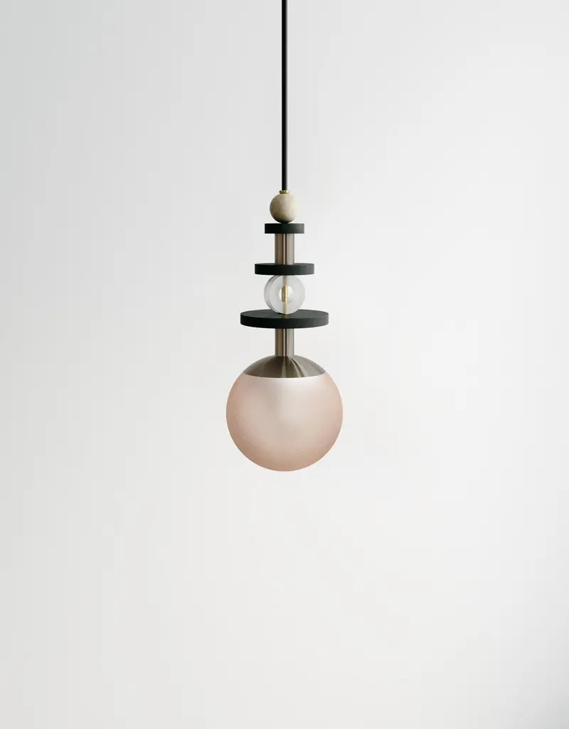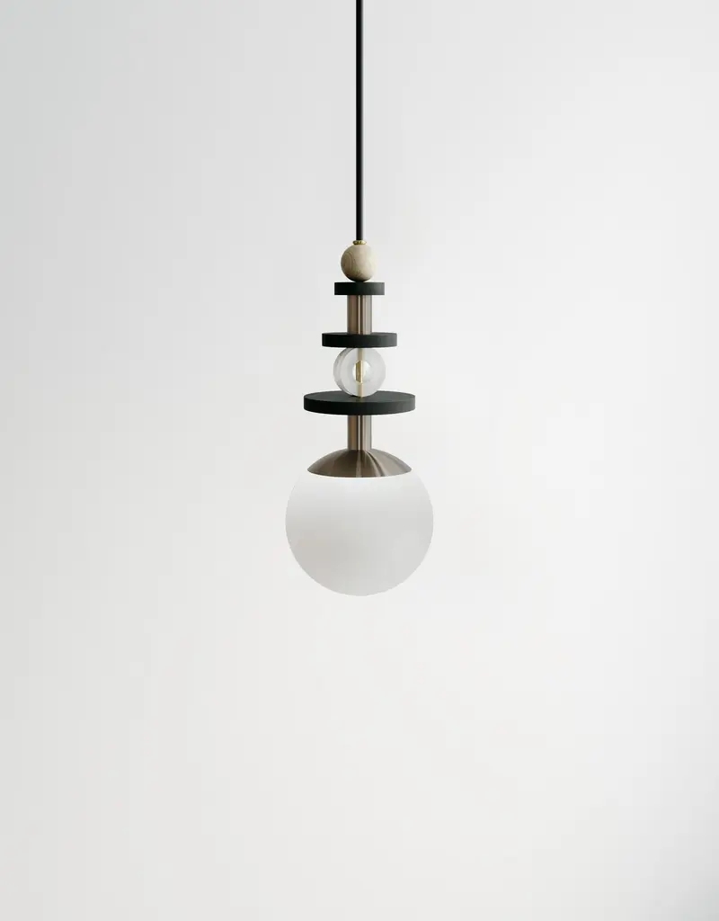 A collection of playful and versatile pendants that consider lighting as the "jewelry" of space.Stacked beads in copper, brass, satin nickel, antique brass, blackened oak, maple, and clear acrylic create jewelry-inspired compositions above a simple glass globe that comes in four shade ranges. Bead stacks available in three heights (short, medium, tall). Pendants may be clustered together to create a varied arrangement of materials and textures. Accepts A19 bulbs (halogen or LED) and is wired to both US and international standards. UL approved up to 25w. Fixtures come hardwired for permanent installation with 8' of fabric wrapped warm dark gray cord and a 5" black round canopy. Bulb is not included. Hardware available in - brass, antique brass, copper, or satin nickelGlobe finishes available in - matte white (opaque), cream (translucent), bronze (translucent), rust (translucent). Please specify hardware finish and globe finish at time of order. MARU 6” PENDANT - Short $869 / Medium $880 / Tall $891MARU 10” PENDANT - Short $1,012 / Medium $1,034 / Tall $1,056Please inquire for custom cluster options.