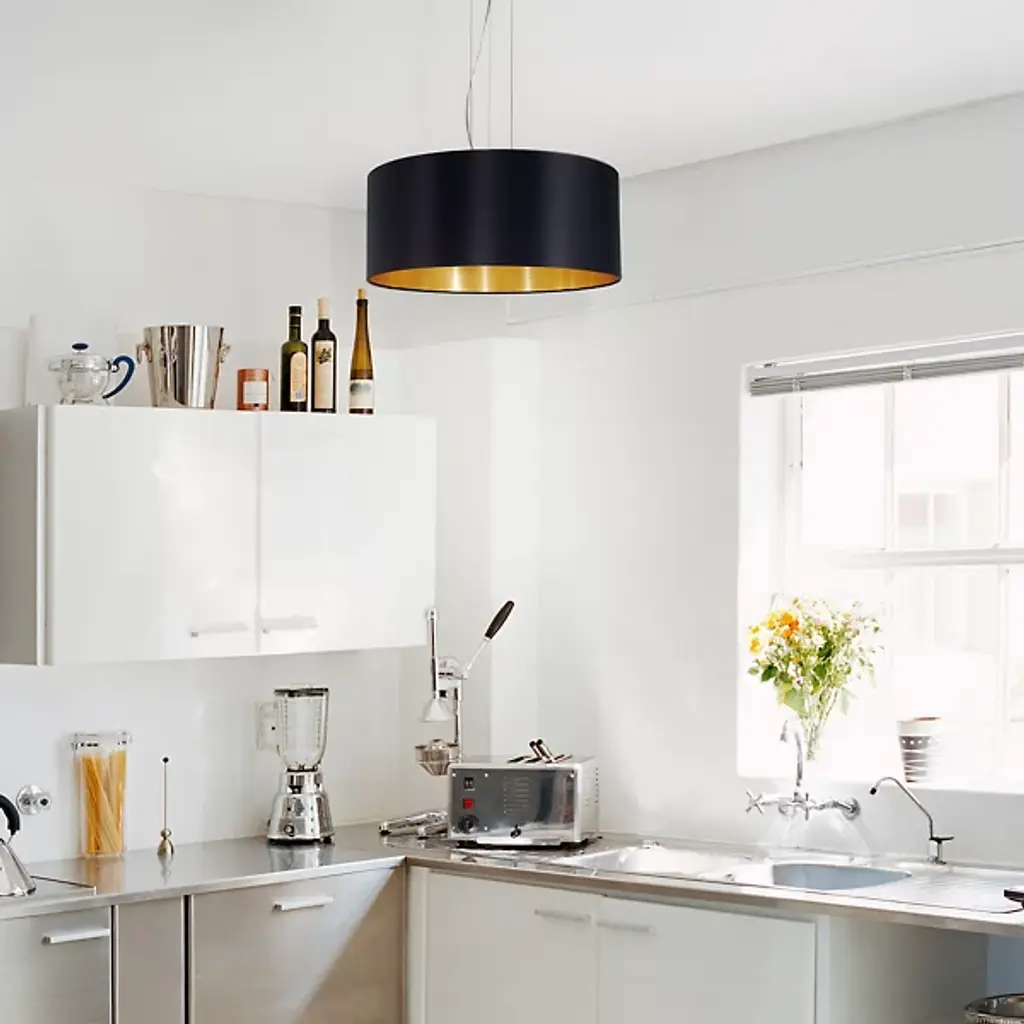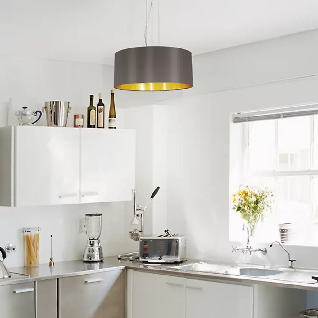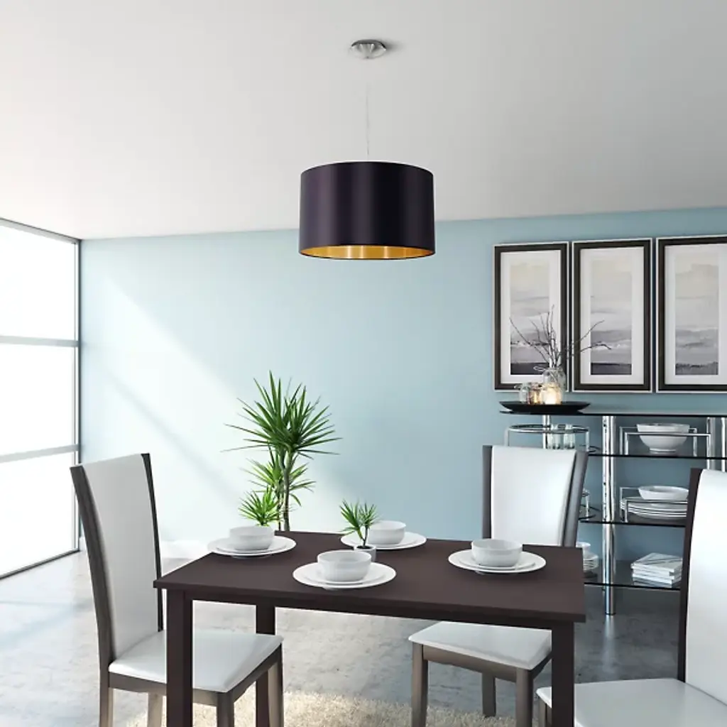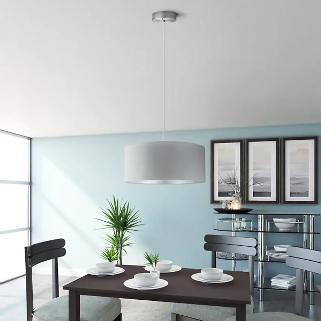 When it comes to stylish sophistication, the Maserlo Drum Pendant by Eglo doesn't miss a beat. Crisp and classy with a fabric drum shade that hosts a single socket inside, this ceiling fixture delivers a luxurious look perfect for accenting formal living rooms and dining areas. The cuttable cord allows you to create the perfect length to accommodate a specific space and a dimmer compatible design offers multiple lighting levels to suit any occasion.