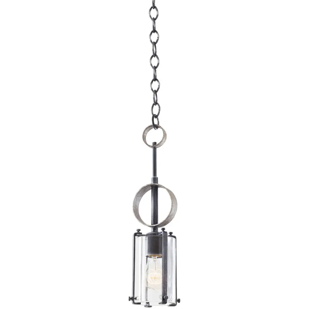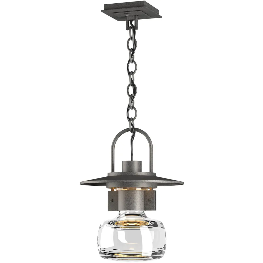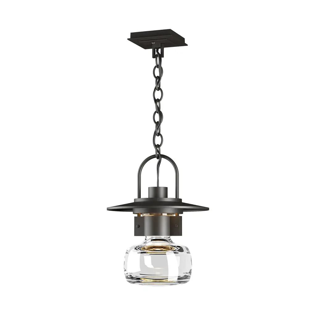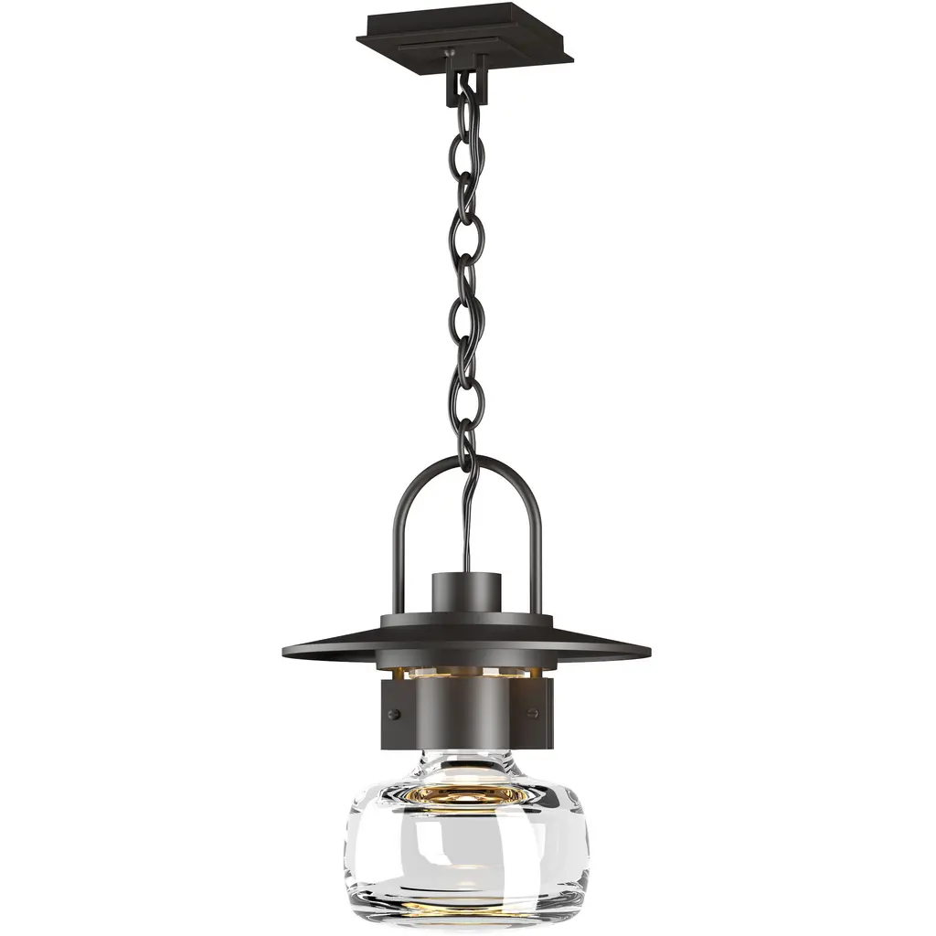 Hubbardton Forge's version of a traditional lantern gives a subtle nod to steampunk aesthetics. Showing a mix of high-end craftsmanship, from the thick blown-glass bell to the metallic curve of the lantern handle, to the details of the riveted collar – this fixture has it all. Features