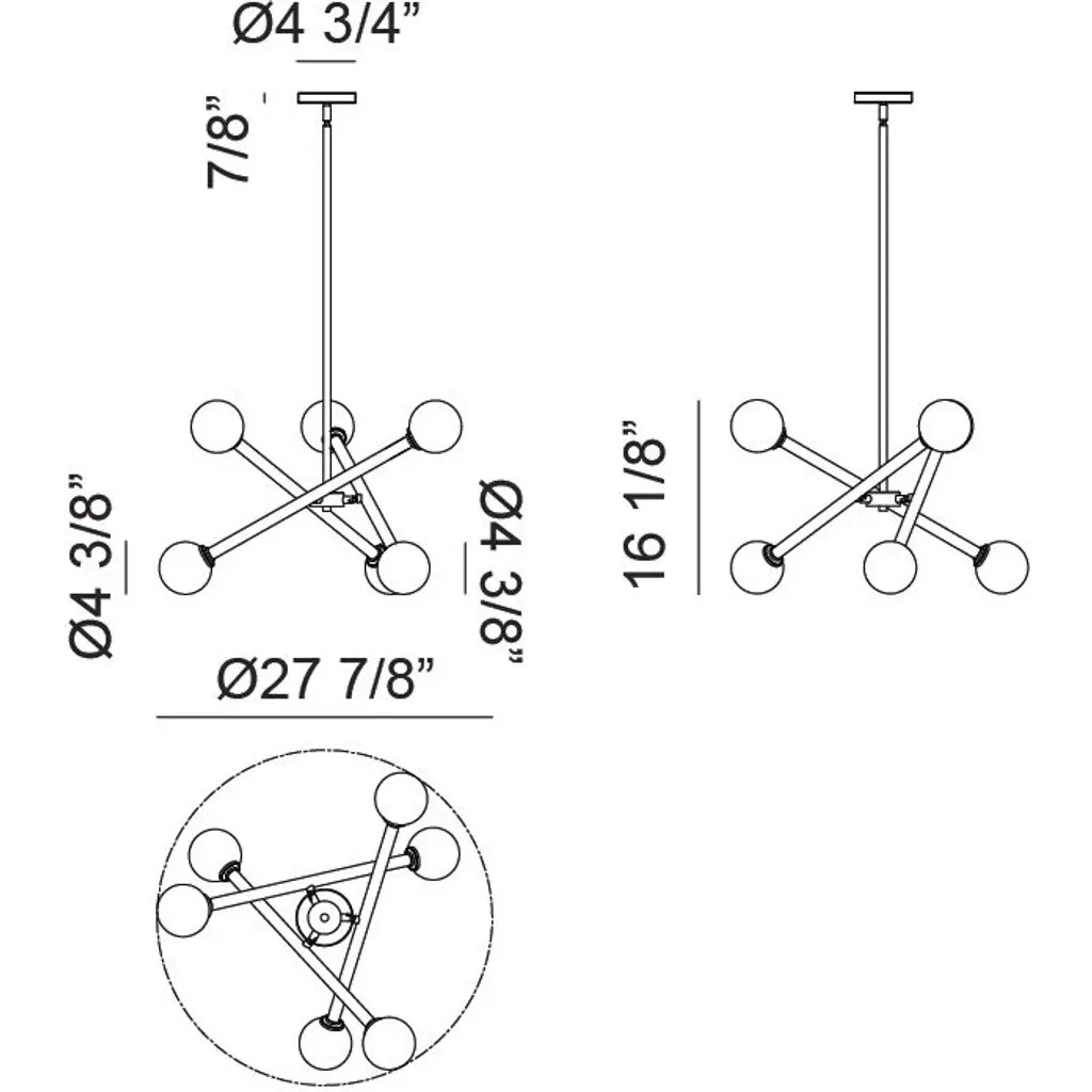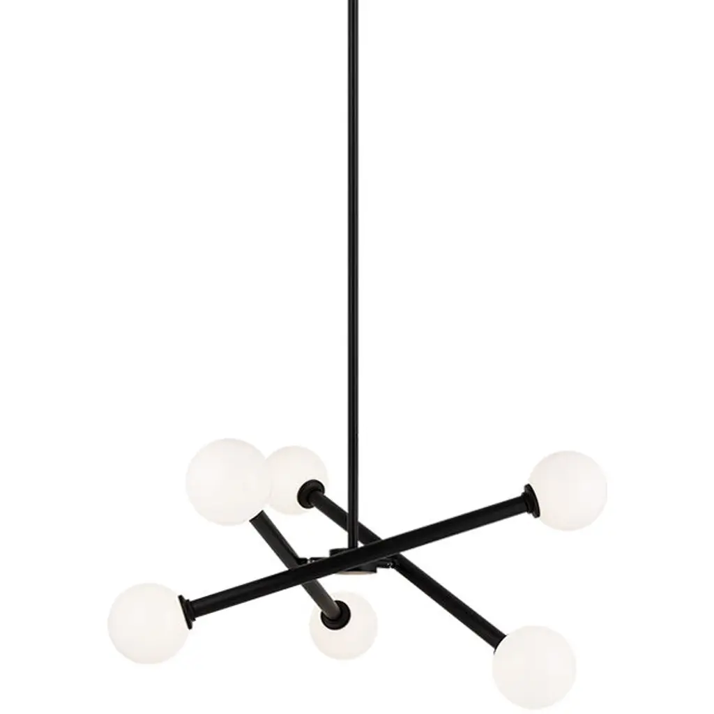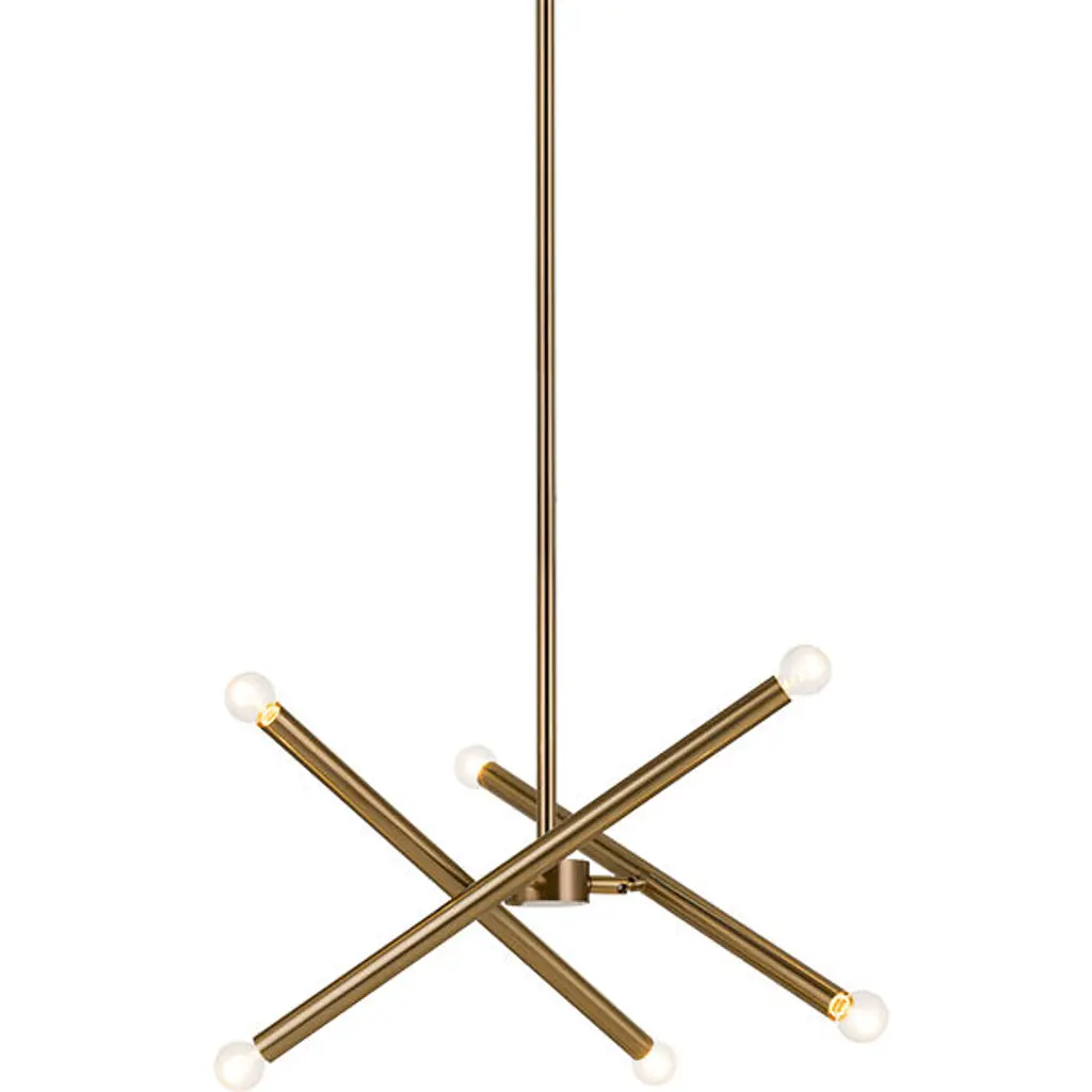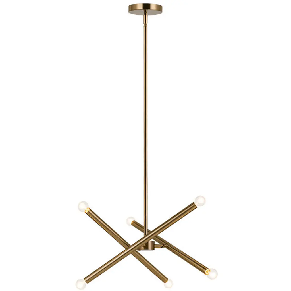 Matchstix chandelier will be a dramatic addition to any room. Modern movement in the crossing bar design will be a signature piece. Available in Aged Gold Brass or Black with either Clear or Opal glass.